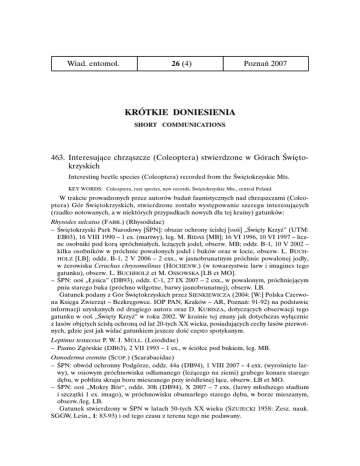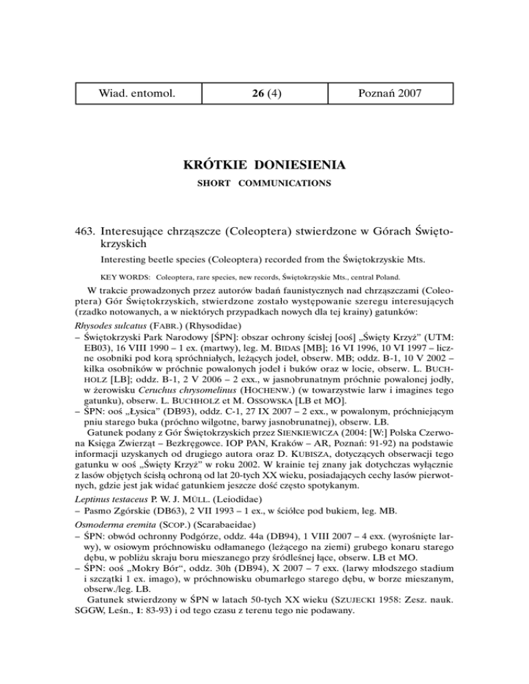 Wiad. entomol. 26 (4) Poznań 2007 KRÓTKIE DONIESIENIA SHORT COMMUNICATIONS 463. Interesujące chrząszcze (Coleoptera) stwierdzone w Górach Świętokrzyskich Interesting beetle species (Coleoptera) recorded from the Świętokrzyskie Mts. KEY WORDS: Coleoptera, rare species, new records, Świętokrzyskie Mts., central Poland. W trakcie prowadzonych przez autorów badań faunistycznych nad chrząszczami (Coleoptera) Gór Świętokrzyskich, stwierdzone zostało występowanie szeregu interesujących (rzadko notowanych, a w niektórych przypadkach nowych dla tej krainy) gatunków: Rhysodes sulcatus (FABR.) (Rhysodidae) – Świętokrzyski Park Narodowy [ŚPN]: obszar ochrony ścisłej [ooś] „Święty Krzyż” (UTM: EB03), 16 VIII 1990 – 1 ex. (martwy), leg. M. BIDAS [MB]; 16 VI 1996, 10 VI 1997 – liczne osobniki pod korą spróchniałych, leżących jodeł, obserw. MB; oddz. B-1, 10 V 2002 – kilka osobników w próchnie powalonych jodeł i buków oraz w locie, obserw. L. BUCHHOLZ [LB]; oddz. B-1, 2 V 2006 – 2 exx., w jasnobrunatnym próchnie powalonej jodły, w żerowisku Ceruchus chrysomelinus (HOCHENW.) (w towarzystwie larw i imagines tego gatunku), obserw. L. BUCHHOLZ et M. OSSOWSKA [LB et MO]. – ŚPN: ooś „Łysica” (DB93), oddz. C-1, 27 IX 2007 – 2 exx., w powalonym, próchniejącym pniu starego buka (próchno wilgotne, barwy jasnobrunatnej), obserw. LB. Gatunek podany z Gór Świętokrzyskich przez SIENKIEWICZA (2004: [W:] Polska Czerwona Księga Zwierząt – Bezkręgowce. IOP PAN, Kraków – AR, Poznań: 91-92) na podstawie informacji uzyskanych od drugiego autora oraz D. KUBISZA, dotyczących obserwacji tego gatunku w ooś „Święty Krzyż” w roku 2002. W krainie tej znany jak dotychczas wyłącznie z lasów objętych ścisłą ochroną od lat 20-tych XX wieku, posiadających cechy lasów pierwotnych, gdzie jest jak widać gatunkiem jeszcze dość często spotykanym. Leptinus testaceus P. W. J. MÜLL. (Leiodidae) – Pasmo Zgórskie (DB63), 2 VII 1993 – 1 ex., w ściółce pod bukiem, leg. MB. Osmoderma eremita (SCOP.) (Scarabaeidae) – ŚPN: obwód ochronny Podgórze, oddz. 44a (DB94), 1 VIII 2007 – 4 exx. (wyrośnięte larwy), w osiowym próchnowisku odłamanego (leżącego na ziemi) grubego konaru starego dębu, w pobliżu skraju boru mieszanego przy śródleśnej łące, obserw. LB et MO. – ŚPN: ooś „Mokry Bór“, oddz. 30h (DB94), X 2007 – 7 exx. (larwy młodszego stadium i szczątki 1 ex. imago), w próchnowisku obumarłego starego dębu, w borze mieszanym, obserw./leg. LB. Gatunek stwierdzony w ŚPN w latach 50-tych XX wieku (SZUJECKI 1958: Zesz. nauk. SGGW, Leśn., 1: 83-93) i od tego czasu z terenu tego nie podawany. 290 KRÓTKIE DONIESIENIA Omalisus fontisbellaquaei FOURCR. (Omalisidae) – Kielce: Brusznia (DB63), 24 VI 1981 – 1 ex., leg. MB. – Dobromyśl ad Kielce (DB63), 20 VI 1986 – 1 ex., 29 V 1998 – 1 ex., leg. MB. – Pasmo Zgórskie (DB63), 21 VI 1993 – 1 ex., leg. MB. – Kielce: Baranówek (DB73), 3 VII 1993 – 1 ex., leg. MB. – „Góra Rzepka” ad Chęciny (DB62), 31 V 2002 – 1 ex., 7 VI 2004 – 1 ex., leg. MB. – ŚPN: obwód ochronny Podgórze, oddz. 62d (DB94), 10 VI 2007 – 1 ex., na skraju śródleśnej polanki, leg. LB et MO. Opilo mollis (L.) (Cleridae) – Pasmo Zgórskie (DB63), 3 VI 1996 – 1 ex., strząśnięty z suchej gałęzi lipy, leg. MB. Korynetes caeruleus (DEG.) (Cleridae) – Kielce (DB73), 11 VI - 13 VII 1991 – 4 exx., na usychających topolach, leg. MB. – Słowik ad Kielce (DB63), 18 V 1996 – 1 ex., leg. MB. – ŚPN: ad Psary-Kąty, oddz. 19, „Gajówka Kąty” (DB94), 6 VI 2007 – 1 ex., na ścianie drewnianej stodoły, przy psim kojcu, leg. LB et MO. Necrobia rufipes (DEG.) (Cleridae) – Kielce (DB73), 13 V 1989 – 1 ex., leg. MB. Eucinetus haemorrhoidalis (GERM.) (Eucinetidae) – Kielce: Białogon (DB63), 15 IX 1987 – 1 ex., 14 X 1989 – 1 ex., leg. MB. – Kielce: Wietrznia (DB73), 17 IV 1994 – 1 ex., leg. MB. – Kielce: Malików (DB63), 22 VI 2004 – 1 ex., leg. MB. Wszystkie osobniki w dołach po eksploatacji piasku. Monotoma conicicollis AUBÉ (Monotomidae) – Kaczyn ad Daleszyce (DB82), 12 I 1991 – 3 exx., leg. MB. – Kielce: Piaski (DB73), 28 III 1997 – 2 exx., leg. MB. Wszystkie osobniki wysiane z mrowisk. Monotoma angusticollis (GYLL.) (Monotomidae) – Kaczyn ad Daleszyce (DB82), 12 I 1991 – 2 exx., wysiane z mrowiska, leg. MB. Lycoperdina succincta (L.) (Endomychidae) – Kielce: „Góra Grabina” (DB63), 4 IV 1986 – 1 ex., 31VII 1987 – 3 exx., leg MB. – Kielce: „Góra Dalnia” (DB73), 29 VI 1997 – 1 ex. leg. MB. – „Góra Zelejowa” ad Chęciny (DB62), 6 X 1996 – 2 exx., leg. MB. – Korzecko ad Chęciny (DB62), 25 X 2002 – 1 ex., 7 IX 2002 – 1 ex., leg. MB. – Gościniec ad Chęciny (DB52), 7 VIII 2005 – 1 ex., 7 IX 2006 – 1 ex., leg. MB. Wszystkie osobniki w owocnikach purchawek (Lycoperdon sp.) Orthocerus clavicornis (L.) (Zapheridae) – Kielce: Białogon (DB63), 8 VIII 1987 – 1 ex., 1 V – 29 VII 1988 – 4 exx., 21 IV 1994 – 1 ex., leg. MB. – Suków ad Kielce (DB72), 23 V 1982 – 1 ex., leg. MB. – Cedzyna ad Kielce (DB73), 2 – 16 V 1992 – 2 exx., leg. MB. – Mójcza ad Kielce (DB73), 27 IV 1994 – 1 ex., 11 VIII 1995 – 1 ex., leg. MB. Wszystkie osobniki w dołach po eksploatacji piasku. Aderus populneus (PANZ.) (Aderidae) – Kielce (DB73), 18 I 1992 – 3 exx., 1 II 1992 – 1 ex., 19 I 1993 – 1 ex., wszystkie w dziupli topoli, leg. MB. – Słowik ad Kielce (DB63), 12 IV 1993 – 1 ex., w dziupli lipy, leg. MB. WIAD. ENTOMOL., 26 (4): POZNAŃ 2007 291 Curtimorda bisignata (REDT.) (Mordellidae) – Kielce: Malików (DB73), 13 V 2007 – 3 exx., z żerowiska w drewnianej poręczy, leg. MB. Pelecotoma fennica (PAYK.) (Rhipiphoridae) – Kielce: Białogon (DB63), 19 VII 1987 – 1 ex., na uschniętej topoli, leg. MB. Metoecus paradoxus (L.) (Rhipiphoridae) – Kielce (DB73), 12 VIII 1997