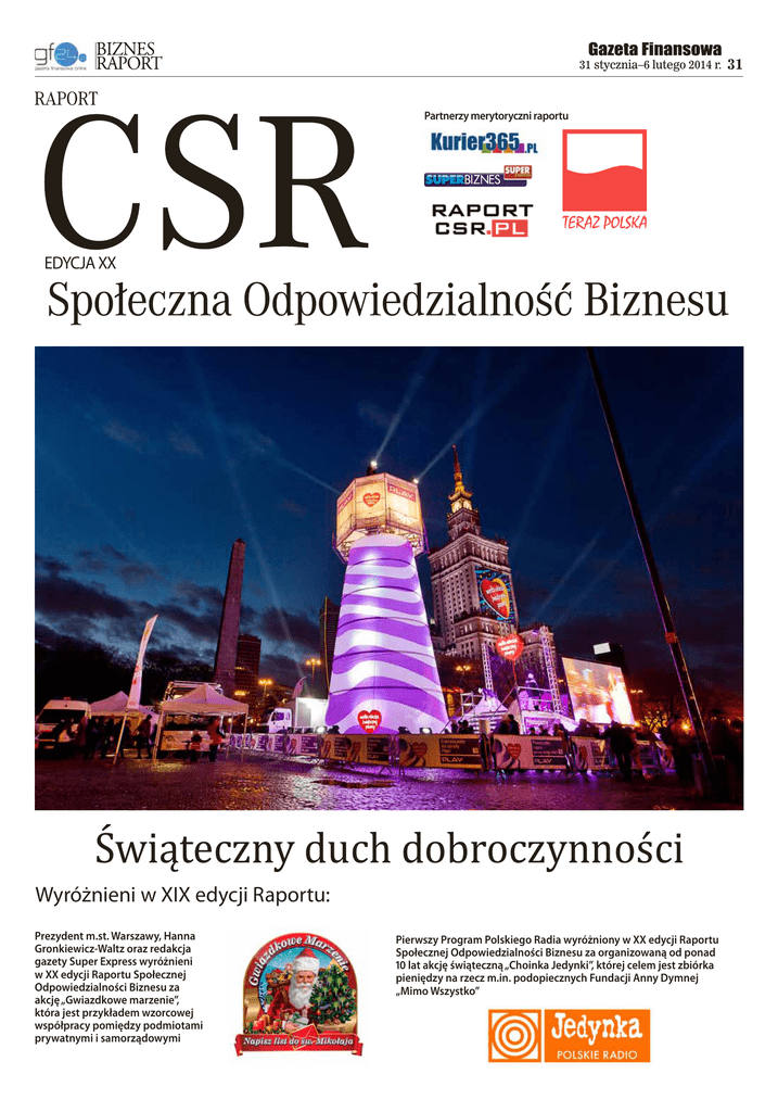 31 stycznia–6 lutego 2014 r. Partnerzy merytoryczni raportu EDYCJA XX Świąteczny duch dobroczynności Wyróżnieni w XIX edycji Raportu: Prezydent m.st. Warszawy, Hanna Gronkiewicz-Waltz oraz redakcja gazety Super Express wyróżnieni w XX edycji Raportu Społecznej Odpowiedzialności Biznesu za akcję „Gwiazdkowe marzenie”, która jest przykładem wzorcowej współpracy pomiędzy podmiotami prywatnymi i samorządowymi Pierwszy Program Polskiego Radia wyróżniony w XX edycji Raportu Społecznej Odpowiedzialności Biznesu za organizowaną od ponad 10 lat akcję świąteczną „Choinka Jedynki”, której celem jest zbiórka pieniędzy na rzecz m.in. podopiecznych Fundacji Anny Dymnej „Mimo Wszystko” 31 32 csr 31 stycznia–6 lutego 2014 r. Szanowni Państwo, w naszym najnowszym numerze Raportu Społeczna Odpowiedzialność Biznesu zbiegło się wiele jubileuszy. Po pierwsze, mija już pięć lat, od kiedy ukazał się nasz pierwszy Raport CSR, po drugie, to już jego 20. edycja! Postanowiliśmy więc numer poświęcić tematyce świątecznej i noworocznej. W końcu, jak świętować, to na całego! W numerze znajdą Państwo obszerny wywiad z Jurkiem Owsiakiem na temat Wielkiej Orkiestry Świątecznej Pomocy i tego, jak ocenia chęć Polaków do pomocy innym. Dużo miejsca poświęciliśmy także akcjom charytatywnym i różnym fundacjom oraz temu, czemu one służą. Oczywiście, jak zawsze wyróżniliśmy dwa ciekawe projekty z zakresu CSR. Te inicjatywy wiele łą- czy. Przede wszystkim ich organizatorami były media, a akcje polegały na zbiórce pieniędzy na rzecz potrzebujących i były świąteczną inicjatywą. Pierwszym wyróżnionym jest akcja „Gwiazdkowe Marzenie”. Jej organizatorami są redakcja „Super Expressu” oraz prezydent m.st. Warszawy, Hanna Gronkiewicz-Waltz. Ten projekt zwrócił nasza uwagę, bo jest przykładem wzorcowej współpracy pomiędzy podmiotami prywatnymi a samorządowymi. Poza samymi organizatorami wzięli w niej udział burmistrzowie ośmiu dzielnic Warszawy. A na czym polegała? Od początku grudnia 2013 r. mali warszawiacy mogli pisać listy do świętego Mikołaja, którego adres chwilowo był zbieżny z redakcją gazety. Spośród setek listów, często wzruszających, wybrano te, zdaniem redakcji, najpiękniejsze. Na prezenty złożyły się samorządy i firmy prywatne. Dzięki temu dla ponad setki dzieci ostatnie święta Bożego Narodzenia były bardzo wyjątkowe. A czytelnikom „Super Expressu” pokazano, w jak prosty sposób można spełnić czyjeś marzenia. Kolejnym wyróżnionym jest Pierwszy Program Polskiego Radia, za organizowaną od ponad 10 lat akcję świąteczną „Choinka Jedynki”. Jak twierdzą jej organizatorzy, akcja i aukcja charytatywna powstała w sposób zupełnie naturalny, z potrzeby serca, a o jej sile świadczy choćby fakt, że w 2013 r. odbyła się już po raz dwunasty. Celem inicjatywy jest przede wszystkim zbiórka pieniędzy (podczas specjalnej aukcji sztuki) na rzecz Fundacji Anny Dymnej „Mimo Wszystko” i Stowarzyszenia DEBRA Polska „Kruchy Dotyk”. Dzięki hojności słuchaczy Pierwszego Programu Polskiego Radia w tym roku udało się zebrać rekordową kwotę 120 475 złotych! Zapraszamy do lektury naszego dodatku, tradycyjnie dziękując wszystkim tym, bez których Raport, by nie istniał: naszym partnerom – Fundacji Polskiego Godła Promocyjnego „Teraz Polska”, redakcji „Super Biznesu”, portalom Kurier365.pl i RaportCSR.pl – i przede wszystkim naszym Czytelnikom. Redakcja 0 Ciągle gramy, z roku na rok coraz lepiej Polski biznes ma wyobraźnię Z Jurkiem Owsiakiem, założycielem i prezesem zarządu Fundacji Wielkiej Orkiestry Świątecznej Pomocy, rozmawiała Aneta Jóźwiak Wielka Orkiestra Wielkiej Świątecznej Pomocy zagrała w styczniu już po raz 22. Jakie ma Pan doświadczenia ze współpracy ze sponsorami w ciągu tych lat? Wypracowaliśmy sobie bardzo dobre standardy sponsoringowe, nauczyliśmy się wzajemnie – my i przede wszystkim firmy – na czym polega ten sponsoring. Przez te lata pracy nad Wielką Orkiestrą Świątecznej Pomocy zdobyliśmy wspólnie cenne doświadczenie. Cieszymy się, że wytworzyliśmy taki model, w którym firmy wiedzą, jaki jest sens naszego działania. Przykładowo, wspólnie wymyślamy, jak będzie wyglądała kampania reklamowa. Ustalamy, w jaki sposób będziemy się informowali i przekazywali wiadomości na temat naszej współpracy. To są rozmowy oparte na zaufaniu. Razem pracujemy na nasz wizerunek. Od początku wypracowaliśmy samodzielny styl działania, nie wynajmujemy żadnej firmy, która robi nam design, plakaty czy reklamy. Nawet, jeśli sponsor fundacji wynajmuje firmę, która później robi jakąś reklamę, to jednak ta współpraca między nami jest bardzo ścisła. Mówimy, co nam się podoba, a co nie. Na samym początku bardzo precyzyjnie tłumaczymy firmie, że pieniądze to jest ta jedna wartość, natomiast druga to prawdziwe zaangażowanie. Pamiętajmy, że nie da się wszystkiego kupić za pieniądze. Chętnie szukamy sponsorów, bo oni są nam niezwykle potrzebni, ale także tłumaczymy im, że przyjęcie naszej optyki patrzenia jest z korzyścią dla nich. Przykładowo, firma Play robi na Przystanku Woodstock niezwykłe rzeczy. Współpracujemy również z firmą Allegro, Bankiem Pekao SA, który wydaje karty płatnicze zaprojektowane przez nas, a także z Pocztą Polską, która tworzy znaczki według naszych projektów. Wiemy, że taki sponsoring jest obwarowany często twardymi zasadami, bo trzeba stworzyć reklamę, pokazać logo sponsora itd. Taka współpraca, naszym zdaniem, bardzo dobrze się sprawdza. Jesteśmy zadowoleni z jej efektów i myślę, że fakt długofalowej współpracy z tymi samymi firmami pokazuje, że one również są usatysfakcjonowane. Nie gonimy za sponsorami, wolimy mieć ich mniej, ale takich, z którymi budujemy współpracę na wiele lat. Umowy sponsorskie obecni