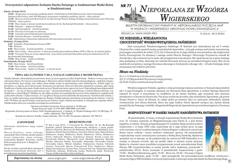 UroczystościodpustoweZesłaniaDuchaŚwiętegowSanktuariumMatkiBożej wStudzienicznej Sobota,18maja2013r. 10.00–RozpoczęcieuroczystegospotkaniadziecizPodwó rkowychKó łRó ż ań cowych,dziecikomunijnych, SzkolnychKó łCaritas,schol,Kó łMisyjnych(zawiązaniewspó lnoty,modlitwa,ś piew)–ołtarzpolowy 12.00-Mszaś w.podprzewodnictwemJ.E.Ks.BpaJerzegoMazuraBiskupaEłckiego(transmitowanaprzezTelewizję TRWAM)–ołtarzpolowy 17.00-Mszaś więtawintencjimatek(przewodniczyJ.E.Ks.BpRomualdKamiń ski)–ołtarzpolowy 19.00-Ró ż aniec–kaplicanaWyspie 21.00-ApelJasnogó rski-koś ció łparafialny 21.30-Procesjaześ wiecaminacmentarz 23.00-CzuwanieprzedNajś więtszymSakramentem 24.00-PasterkaMaryjna-koś ció łparafialny 2.00-Naboż eń stwoodnowieniaSakramentuBierzmowania(czuwaniecałąnoc). Niedziela,19maja2013r. 6.00-GodzinkioNiepokalanymPoczęciuNMP 7.00-Ró ż aniec, 8.00-Mszaś więta-koś ció łparafialny-ourodzaje 10.00-Mszaś więta-ołtarzpolowy-wintencjipowołań (przewodniczyRektorWSDwEłkuks.drAndrzejJaś ko) 12.00-UroczystaMszaś w.(sumaodpustowa)-przyołtarzupolowymKoncelebrapodprzewodnictwemJ.E.Ks. BpaRomualdaKamiń skiego 19.00-Mszaś więta-kaplicanaWyspie Poniedziałek,20maja2013r. 9.20-Mszaś więta-koś ció łparafialny 11.00-Mszaś więta-koś ció łparafialny 19.00-Mszaś więta-kaplicanaWyspie-wintencjiojcó w NR 77 NIEPOKALANA ZE WZGÓRZA WIGIERSKIEGO BIULETYN INFORMACYJNY PARAFII P.W. NIEPOKALANEGO POCZĘCIA NMP W WIGRACH I WIGIERSKIEGO AREOPAGU NOWEJ EWANGELIZACJI REDAKCJA: WWW.WIGRY.PRO 12 MAJA 2013 ROKU VII NIEDZIELA WIELKANOCNA UROCZYSTOŚĆ WNIEBOWSTĄPIENIA PAŃSKIEGO Dziś uroczystoś ć Wniebowstąpienia Pań skiego. W Koś ciele jest obchodzona już od V wieku. ChrystusPan,zanimopuś ciłziemię,powiedziałdoApostołó w:„AJa,gdyzostanęnadziemięwywyż szony, przyciągnęwszystkichdosiebie”(J12,32).Itłumaczyłim,ż eJegoodejś ciejestpotrzebne,abymó głzesłać Ducha Pocieszyciela. Po złoż onej z samego siebie Ofierze Nowego i Wiecznego Przymierza wszedł do chwałyOjca,abywstawiać sięzanami,abyprzygotować nammiejsce.Mywpatrujemysięwgó rę,każ dego dniapodąż amyzaNim,obieramytenwłaś niekierunek,kroczącpoziemskichdrogachwiary.Mocdotej wędró wkiczerpiemyzsamegoChrystusaobecnegowEucharystii,odwagęisiły–zDuchaSwiętego,któ ry nieustannienaswspieraipociesza. Słowo na Niedzielę: TRWA AKCJA POMOCY DLA NATALII JADESZKO Z REMIEŃKINIA Natalka Jadeszko z Remieńkinia jest poważnie chora, jej życiu zagraża nie tylko Zespół Dandy - Walkera i towarzyszące temu schorzeniu objawy. Po wizycie u neurochirurga w Warszawie rodzice Natalki usłyszeli straszną diagnozę - zanik kory mózgu i niewykształcony pień mózgu, oraz torbiel, która bardzo uciska tą najważniejszą część tyłomózgowia. Torbiel ciągle się powiększa, co zagraża życiu dziewczynki. Konieczna jest operacja, która jest obarczona ogromnym ryzykiem, gdyż mózg Natalki jest w bardzo złym stanie. Każdy dzień się liczy! Każdy uraz może zagrozić jej życiu! Atak epilepsji maże doprowadzić do śmierci! - „To cud, że dziewczynka jeszcze żyje” - tak powiedział lekarz, neurochirurg z Centrum Zdrowia Dziecka. Los Natalki leży w rękach Boga!!! Módlmy się, aby udało się pomóc tej wspaniałej dziewczynce, która zupełnie nie wygląda na tak ciężko chore dziecko. Ciężko uwierzyć, że w jej główce dzieją się niewyobrażalne dla nas procesy i nieodwracalne zmiany, a liczy się szybka interwencja neurochirurgiczna. Rodzice Natalki polecieli natychmiast na konsultację do Niemiec. I stał się cud!!! W Polsce nie dawali Natalce szans przeżycia! Profesor Vogel z Berlina powiedział, ze chirurgicznie zoperuje torbiel i Natalka będzie zdrowym, normalnie rozwijającym się dzieckiem! Operacja jest bardzo kosztowna: Koszt operacji to 10 660 euro. Numer konta do wpłat: 62 9354 0007 0000 0000 1629 0001 Regionalne Stowarzyszenie na Rzecz Osób Niepełnosprawnych w Sejnach, ul. Wojska Polskiego 60 d, 16-500 Sejny. W tytule z dopiskiem "Dla Natalki". Kontakt do rodziców Natalki: Joanna Jadeszko: 506 716 888, Przemysław Jadeszko: 503 990 913 BIERZMOWANIE ZAPOWIEDŹ Sakrament małżeństwa mają zamiar zawrzeć: Marcin Kuźmicz, stanu wolnego, zamieszkały Stary Folwark, parafia tutejsza i Iwona Jankowska, stanu wolnego, zamieszkała Bargłów Kościelny, parafia Podwyższenia Krzyża św. w Bargłowie. Zapowiedź I. Kto by wiedział o przeszkodach istniejących międzywymienionymi proszony jest o powiadomienie kancelarii parafialnej. Zapraszamy na stronę: W dniu 8 maja 2013r., w Uroczystość Św. Stanisława J.E. Ks. Bp Romuald Kamiński udzielił Sakramentu Bierzmowania młodzieży z naszej parafii: Balewicz Wojciech, Barszczewski Bartłomiej, Bienio Karol, Bołtrukanis Jerzy, Daniłowicz Dawid, Dermont Mateusz, Gawryłow Nikola, Grnyo Maria Stefania, Hołubowicz Joanna, Hołubowicz Kamil, Hołubowicz Oliwia, Hołubowicz Paweł, Jankowski Mateusz, Jarmołowicz Damian, Korsak Leszek Jan, Kowalewski Mateusz, Maciejewski Jacek, Masalska Agnieszka, Masalska Monika, Milewska Natalia, Nowosadko Aleksandra, Nowosadko Kamila, Nowosadko Łukasz, Obłocki Arkadiusz, Omiljanowicz Szymon, Ostrowski Szymon, Piotrowski Marcin, Poświatowski Piotr, Stankiewicz Milena, Strękowska Katarzyna, Świacki Piotr, Tomczyk Piotr Jan, Warakomska Marta, Wasilewska Adrianna, Wasilewska Joanna, Wasilewski Jakub, Wasilewski Tomasz, Ziółkowska Edyta, Żukowski Kamil. www.wigry.pro www.wigry.kuria.elk.pl Dz1,1-11Uniósłsięwichobecnościwgórę Ef1,17-23BógposadziłChrystusaposwojejprawicy Łk24,46-53Jezuszostałuniesionydonieba WniebowstąpieniePań skie,zgodniezrelacjąś więtegoŁukaszazaró wnowDziejachApostolskich jakiwjegoEwangelii,toostatnieukazaniesięChrystusaPanaApostołom,wtrakciektó regoZbawiciel nakazał im trwać w Jerozolimie na modlitwie aż do chrztu Duchem, gdy otrzymali moc dawania ś wiadectwaoChrystusieZbawicielu.PanJezusunió słsiędonie