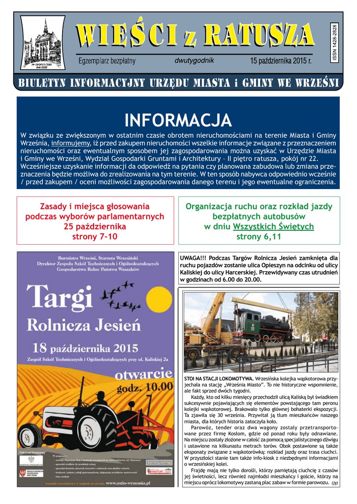 15 października 2015 r. WIEŚCI z RATUSZA 19/2015 1 INFORMACJA W związku ze zwiększonym w ostatnim czasie obrotem nieruchomościami na terenie Miasta i Gminy Września, informujemy, iż przed zakupem nieruchomości wszelkie informacje związane z przeznaczeniem nieruchomości oraz ewentualnym sposobem jej zagospodarowania można uzyskać w Urzędzie Miasta i Gminy we Wrześni, Wydział Gospodarki Gruntami i Architektury – II piętro ratusza, pokój nr 22. Wcześniejsze uzyskanie informacji da odpowiedź na pytania czy planowana zabudowa lub zmiana przeznaczenia będzie możliwa do zrealizowania na tym terenie. W ten sposób nabywca odpowiednio wcześnie / przed zakupem / oceni możliwości zagospodarowania danego terenu i jego ewentualne ograniczenia. Zasady i miejsca głosowania podczas wyborów parlamentarnych 25 października strony 7-10 Organizacja ruchu oraz rozkład jazdy bezpłatnych autobusów w dniu Wszystkich Świętych strony 6,11 UWAGA!!! Podczas Targów Rolnicza Jesień zamknięta dla ruchu pojazdów zostanie ulica Opieszyn na odcinku od ulicy Kaliskiej do ulicy Harcerskiej. Przewidywany czas utrudnień w godzinach od 6.00 do 20.00. Stoi na stacji lokomotywa. Wrzesińska kolejka wąskotorowa przyjechała na stację „Września Miasto”. To nie historyczne wspomnienie, ale fakt sprzed dwóch tygodni. Każdy, kto od kilku miesięcy przechodził ulicą Kaliską był świadkiem sukcesywnie pojawiających się elementów powstającego tam peronu kolejki wąskotorowej. Brakowało tylko głównej bohaterki ekspozycji. Ta zjawiła się 30 września. Przywitał ją tłum mieszkańców naszego miasta, dla których historia zatoczyła koło. Parowóz, tender oraz dwa wagony zostały przetransportowane przez firmę Kosłom, gdzie od ponad roku były odnawiane. Na miejscu zostały złożone w całość za pomocą specjalistycznego dźwigu i ustawione na kilkunastu metrach torów. Obok postawione są także eksponaty związane z wąskotorówką: rozkład jazdy oraz trasa ciuchci. W przyszłości stanie tam także info-kiosk z niezbędnymi informacjami o wrzesińskiej kolei. Frajdę mają nie tylko dorośli, którzy pamiętają ciuchcię z czasów jej świetności, lecz również najmłodsi mieszkańcy i goście, którzy na miejscu oprócz lokomotywy zastaną plac zabaw w formie parowozu. (jg) 2 WIEŚCI z RATUSZA 19/2015 Budowa nowej hali rozpoczęta. W poniedziałek, 12 października 2015 roku w Pałacu na Opieszynie odbyła się uroczystość wmurowania kamienia węgielnego pod budowę hali Wałbrzyskiej Specjalnej Strefy Ekonomicznej „Invest Park”. Inwestycja prowadzona przez WSSE powstaje na terenach Wrzesińskiej Strefy Aktywności Gospodarczej (WSAG). Wmurowanie kamienia węgielnego oficjalnie rozpoczęło proces budowy nowej hali przemysłowej o powierzchni 10 000 m2 z parkingami i placami manewrowymi. Zgodnie z planem, nowa hala przemysłowa ma być gotowa wiosną przyszłego roku. Najemcą obiektu zostanie spółka Sitech, należąca do koncernu Volkswagen. Powstała ona w 1998 roku, a swoją produkcję prowadzi już w Polkowicach i Głogowie. Firma specjalizuje się w produkcji metalowych stelaży siedzisk samochodowych do wybranych modeli samochodów takich marek jak: Volkswagen, Audi, Skoda oraz Seat. W wynajmowanej hali spółka Sitech będzie produkowała kompletne zestawy foteli samochodowych do Craftera. Pierwsze siedzenia wyprodukowane zostaną w drugiej połowie 2016 roku. W uroczystości wmurowania kamienia węgielnego pod budowę nowej hali wzięli udział m.in.: (jł) przedstawiciele rządu, WSSE, firmy Sitech, a także lokalne władze. Mieszkańcy Wrześni postawili na zdrowie. W sobotę, 3 października we Wrześni odby- ła się kolejna odsłona jesiennej kampanii „Uzależnia mnie tylko sport”. Mieszkańcy Wrześni i Powidza ponownie pobiegli po zdrowie, symbolicznie walcząc z używkami. Pierwsza, wiosenna edycja organizowanej przez Samorząd Województwa Wielkopolskiego kampanii „Uzależnia mnie tylko sport” była jedną z największych akcji profilaktyki zdrowia w tym roku w kraju. Sukces akcji był tak duży, że już jesienią zorganizowano jej kolejną edycję. W serii rodzinnych biegów oraz festynów promujących zdrowy styl życia i walkę z używkami biorą udział również Powidz i Września. Z inicjatywą kontynuowania kampanii w okresie jesiennym wystąpiły gminy i ich mieszkańcy. Zaplanowano m.in. konkursy wiedzy o uzależnieniach, dyżury specjalistów do spraw uzależnień oraz mnóstwo pozytywnej rywalizacji. Współorganizatorzy imprezy: Poradnia Psychologiczno-Pedagogiczna we Wrześni, Powiatowa Stacja Sanitarno-Epidemiologiczna Oddział Września, Komenda Powiatowa Policji Wydział Prewencji, Straż Miejska we Wrześni, Wrzesińskie Stowarzyszenie Abstynentów JANTAR, Gminna Komisja Rozwiązywania Problemów Alkoholowych we Wrześni, Poradnia Leczenia Uzależnień we Wrześni. (pp) 15 października 2015 r. TOMEK MICHNIEWICZ I JEGO ŚWIAT RÓWNOLEGŁY We wtorek, 6 października 2015 r. Biblioteka Publiczna we Wrześni zaprosiła czytelników na kolejne spotkanie z cyklu Wrzesiński Kalejdoskop Literacki. Gościem wieczoru był podróżnik, fotograf i reportażysta – Tomek Michniewicz. Autor najnowszej książki „Świat równoległy” z pasją opowiadał o swoich podróżach, które pozwoliły mu odkryć prawdziwe oblicza innych kultur i w pewien sposób zdemaskować stereotypowy sposób ich postrzegania. Twórca programu „Inny świat” przekonywał, że istnieją dwa równoległe światy – jeden lansowany od lat, który przedstawia nam błędny obraz obcych kultur i drugi rzeczywisty, który możemy odkryć poprzez obserwacje otaczającego nas świata. Próbował pokazać zebranym słuchaczom, że odrzucając stereotypy i masowe myślenie, możemy zobaczyć zupełnie nowy, normalny świat, którego nie widzimy w telewizji. Jako przykład podawał błędne i jednostronne myślenie o islamistach i świecie muzułmańs