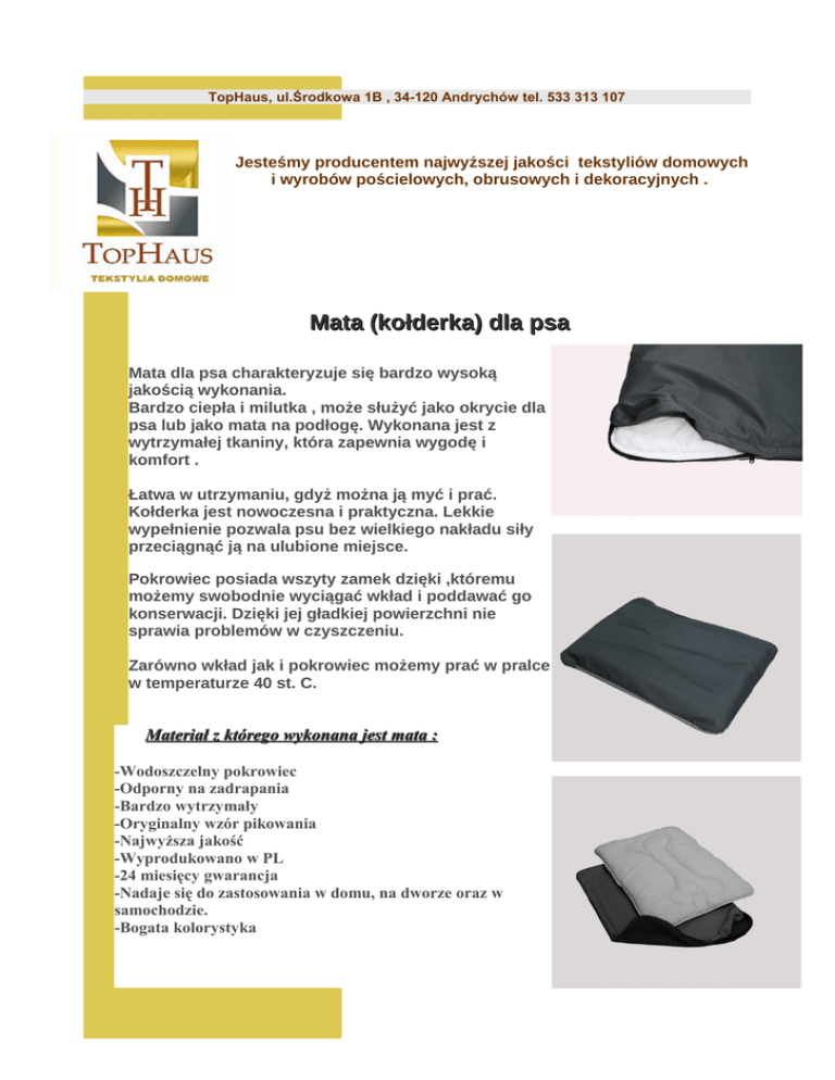TopHaus, ul.Środkowa 1B , 34-120 Andrychów tel. 533 313 107 Jesteśmy producentem najwyższej jakości tekstyliów domowych i wyrobów pościelowych, obrusowych i dekoracyjnych . Mata (kołderka) dla psa Mata dla psa charakteryzuje się bardzo wysoką jakością wykonania. Bardzo ciepła i milutka , może służyć jako okrycie dla psa lub jako mata na podłogę. Wykonana jest z wytrzymałej tkaniny, która zapewnia wygodę i komfort . Łatwa w utrzymaniu, gdyż można ją myć i prać. Kołderka jest nowoczesna i praktyczna. Lekkie wypełnienie pozwala psu bez wielkiego nakładu siły przeciągnąć ją na ulubione miejsce. Pokrowiec posiada wszyty zamek dzięki ,któremu możemy swobodnie wyciągać wkład i poddawać go konserwacji. Dzięki jej gładkiej powierzchni nie sprawia problemów w czyszczeniu. Zarówno wkład jak i pokrowiec możemy prać w pralce w temperaturze 40 st. C. Materiał z którego wykonana jest mata : -Wodoszczelny pokrowiec -Odporny na zadrapania -Bardzo wytrzymały -Oryginalny wzór pikowania -Najwyższa jakość -Wyprodukowano w PL -24 miesięcy gwarancja -Nadaje się do zastosowania w domu, na dworze oraz w samochodzie. -Bogata kolorystyka TopHaus, ul.Środkowa 1B , 34-120 Andrychów tel. 533 313 107 Mata dla psa składa się z dwóch części: Kołderki – wykonanej z tkaniny typu mikrofibra,którą wypełnia puszysta termozgrzewalna włóknina poliestrowa, całość jest przepikowana ( wzór kości) i obszyta lamówką. Pokrowca – wykonanego z mocnej tkaniny poliestrowej podklejonej wodoszczelną warstwą poliuretanu posiadającego właściwości paroprzepuszczalne( oddychające) Wszyty do pokrowca zamek umożliwia nam swobodne wyciąganie i zakładanie wkładu. Mata dla psa może być dwustronna (dwukolorowa), istnieje możliwość swobodnego dobierania i łączenia kolorów, co powoduje, że można będzie ją dopasować do wystroju pomieszczenia i nada wnętrzu oryginalny i nowoczesny wygląd. ane techniczne Wkład Dane techniczne Wymiar Grubość 70x100 około 6 cm Wymiar Ciężar tkaniny Waga 0,5 kg Surowiec Pokrowiec 70x100 190 g/m2 95 % Poliester 5 % Poliuretan Poliestrowa włóknina termozgrzewalna Materiał obszyta Mikrofibrą, wzór pikowania – Kość Gramatura surowca 600g Odporność na światło 4 Maty dla psów występują w poniższej konfiguracji kolorystycznej: bordo brąz popiel zielony grafit Cena brutto maty dla psa – 36 zł KONTAKT TOPHAUS S.C ul.Środkowa 1B 34-120 Andrychów Roczyny email: [email protected] www. tophaus.pl tel: 0048 533 313 107