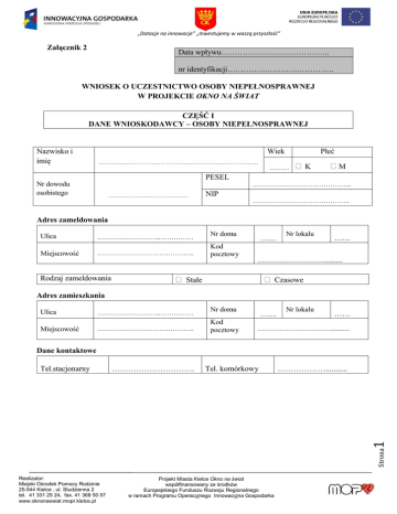 „Dotacje na innowacje” „Inwestujemy w waszą przyszłość” Załącznik 2 Data wpływu………………………………….. nr identyfikacji…………………………………. WNIOSEK O UCZESTNICTWO OSOBY NIEPEŁNOSPRAWNEJ W PROJEKCIE OKNO NA ŚWIAT CZĘŚĆ I DANE WNIOSKODAWCY – OSOBY NIEPEŁNOSPRAWNEJ Nazwisko i imię Płeć Wiek ……………………………………………………………………………… PESEL Nr dowodu osobistego ……………………………………… NIP ……… K M ……………………………………... …………………………………….. Adres zameldowania Ulica Miejscowość ………………………..…………… Nr domu …………………………………….. Kod pocztowy Rodzaj zameldowania …...... Nr lokalu …… …………………………........... Stałe Czasowe Adres zamieszkania Ulica Miejscowość ………………………..…………… Nr domu …………………………………….. Kod pocztowy …...... Nr lokalu …… ……………………………........... Dane kontaktowe …………………………. Tel. komórkowy ………………........... Strona 1 Tel.stacjonarny Realizator: Miejski Ośrodek Pomocy Rodzinie 25-544 Kielce , ul. Studzienna 2 tel. 41 331 25 24, fax. 41 368 50 57 www.oknonaswiat.mopr.kielce.pl Realizator Projekt Miasta Kielce Okno na świat współfinansowany ze środków Europejskiego Funduszu Rozwoju Regionalnego w ramach Programu Operacyjnego Innowacyjna Gospodarka „Dotacje na innowacje” „Inwestujemy w waszą przyszłość” CZĘŚĆ II DANE OSOBY WYSTĘPUJĄCEJ W IMIENIU WNIOSKODAWCY NIE DOTYCZY, proszę przejść do wypełnienia Części III DOTYCZY proszę wybrać: Przedstawiciel Ustawowy Opiekun Prawny Kurator Sądowy Pełnomocnik Nazwisko i imię Płeć Wiek …………………………………………………………………………… Nr dowodu osobistego PESEL ……………………………………… .…….. K M ……………………………………… NIP ………………………………...….. Adres zamieszkania Ulica …………………………................. Nr domu …………… Nr lokalu Miejscowość ……………………………… Kod pocztowy ………. ……………………………… Dane kontaktowe ……………………….. Tel. komórkowy Tel. stacjonarny ………………............. CZĘŚĆ III DANE O GOSPODARSTWIE DOMOWYM 1. Czy w gospodarstwie domowym jest podłączony Internet? TAK NIE 2. Czy w gospodarstwie domowym jest: telewizja kablowa telefon stacjonarny TAK TAK NIE NIE Jeżeli NIE, to czy w gospodarstwie domowym zainstalowane jest: NIE NIE 3. W jakim sposób dostęp do Internetu może wpłynąć na funkcjonowanie gospodarstwa domowego? ………………………………………………………………………………………………… ………………………………………………………………………………………………… ………………………………………………………………………………………………… ………………………………………………………………………………………………… ………………………………………………………………………………………………… ………………………………………………………………………………………………… Realizator: Miejski Ośrodek Pomocy Rodzinie 25-544 Kielce , ul. Studzienna 2 tel. 41 331 25 24, fax. 41 368 50 57 www.oknonaswiat.mopr.kielce.pl Realizator Projekt Miasta Kielce Okno na świat współfinansowany ze środków Europejskiego Funduszu Rozwoju Regionalnego w ramach Programu Operacyjnego Innowacyjna Gospodarka 2 gniazdo telefonii stacjonarnej TAK TAK Strona gniazdo telewizji kablowej „Dotacje na innowacje” „Inwestujemy w waszą przyszłość” 4. Czy w gospodarstwie domowym jest komputer? TAK, zakupiony w roku ……… NIE 5. Czy Wnioskodawca w 2013 r. korzystał ze wsparcia organizowanego w ramach pomocy społecznej przez MOPR lub organizacji pozarządowych, z którymi MOPR zawarł umowę zlecając realizację zadań z zakresu pomocy społecznej? TAK NIE 6. Czy Wnioskodawca w miesiącu poprzedzającym złożenie Wniosku korzystał ze świadczeń pieniężnych w ramach systemu pomocy społecznej? TAK NIE 7. Czy gospodarstwo domowe w miesiącu poprzedzającym złożenie Wniosku korzystało ze świadczeń w ramach systemu świadczeń rodzinnych? TAK NIE 8. Oświadczam, że miesięczny dochód netto w przeliczeniu na jednego członka rodziny w miesiącu poprzedzającym złożenie Wniosku wyniósł ………………..…zł (słownie……….…………..………………………...............................................................) 9. Czy Wnioskodawca lub członek rodziny uczestniczy lub uczestniczył w projekcie systemowym MOPR pn. Działanie szansą na przyszłość współfinansowanym ze środków Unii Europejskiej w ramach Europejskiego Funduszu Społecznego? TAK NIE Jeżeli TAK, to w którym roku? 2008 r. 2009 r. 2010 r. 2011 r. 2012 r. 2013 r. 10. Czy Wnioskodawca jest osobą długotrwale bezrobotną, tj: pozostającą w rejestrze urzędu pracy łącznie przez okres ponad 12 miesięcy w okresie ostatnich 2 lat ( Dz.U. z 2013r. poz. 674)? TAK NIE 11. Czy w gospodarstwie domowym występuje bezradność w sprawach opiekuńczo - wychowawczych? TAK NIE Ogółem liczba osób dorosłych (powyżej 18 lat) …………., w tym Kobiet…..... Mężczyzn.……… Realizator: Miejski Ośrodek Pomocy Rodzinie 25-544 Kielce , ul. Studzienna 2 tel. 41 331 25 24, fax. 41 368 50 57 www.oknonaswiat.mopr.kielce.pl Realizator Projekt Miasta Kielce Okno na świat współfinansowany ze środków Europejskiego Funduszu Rozwoju Regionalnego w ramach Programu Operacyjnego Innowacyjna Gospodarka Strona 3 12. Członkowie gospodarstwa domowego: Og