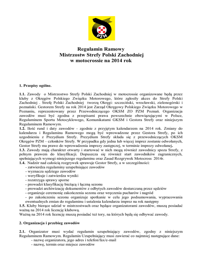 Regulamin Ramowy Mistrzostw Strefy Polski Zachodniej w motocrossie na 2014 rok 1. Przepisy ogólne. 1.1. Zawody o Mistrzostwo Strefy Polski Zachodniej w motocrossie organizowane będą przez kluby z Okręgów Polskiego Związku Motorowego, które zgłosiły akces do Strefy Polski Zachodniej . Strefę Polski Zachodniej tworzą Okręgi: szczeciński, wrocławski, zielonogórski i poznański. Gestorem Strefy na rok 2014 jest Zarząd Okręgowy Polskiego Związku Motorowego w Poznaniu, reprezentowany przez Przewodniczącego OKSM ZO PZM Poznań. Organizacja zawodów musi być zgodna z przepisami prawa powszechnie obowiązującymi w Polsce, Regulaminem Sportu Motocyklowego, Komunikatami GKSM i Gestora Strefy oraz niniejszym Regulaminem Ramowym. 1.2. Ilość rund i daty zawodów - zgodnie z przyjętym kalendarzem na 2014 rok. Zmiany do kalendarza i Regulaminu Ramowego mogą być wprowadzone przez Gestora Strefy, po ich uzgodnieniu z Prezydium Strefy. Prezydium Strefy składa się z przewodniczących OKSM Okręgów PZM – członków Strefy. W przypadku gdy jedna lub więcej imprez zostanie odwołanych, Gestor Strefy ma prawo do wprowadzenia imprezy zastępczej, w terminie imprezy odwołanej. 1.3. Zawody mają charakter otwarty i startować w nich mogą również zawodnicy spoza Strefy, z pełnym prawem do klasyfikacji. Dopuszcza się również start zawodników zagranicznych, spełniających wymogi niniejszego regulaminu oraz Zasad Rozgrywek Motocross 2014r. 1.4. Nadzór nad całością rozgrywek sprawuje Gestor Strefy, a w szczególności: - zatwierdza regulaminy uzupełniające zawodów - wyznacza sędziego zawodów - weryfikuje i zatwierdza wyniki - rozstrzyga sprawy sporne - prowadzi klasyfikację bieżącą i łączną sezonu - prowadzi archiwizację dokumentów z odbytych zawodów dostarczaną przez sędziów - organizuje ceremonię zakończenia sezonu oraz wręczenia pucharów i nagród - po zakończeniu sezonu organizuje spotkanie w celu jego podsumowania, wypracowania ewentualnych zmian do regulaminu i ustalenia kalendarza imprez na rok następny 1.5. Kluby biorące udział w mistrzostwach oraz będące organizatorami zawodów, muszą posiadać ważną na 2014 rok licencję klubową. Ważną na 2014 rok licencję muszą posiadać też tory, na których będą się odbywać zawody. 2. Organizacja i przebieg zawodów 2.1. Organizator musi wydać regulamin uzupełniający zawodów, zgodny z niniejszym Regulaminem Ramowym. Regulamin Uzupełniający musi zawierać co najmniej następujące dane: - nazwę organizatora, jego adres i telefon/fax/e-mail - nazwę, termin oraz miejsce zawodów - imię i nazwisko sędziego oraz dyrektora zawodów - termin przyjmowania zgłoszeń - czas i miejsce pracy biura zawodów - godzina i miejsce startu oraz ogłoszenia wyników Regulamin uzupełniający zawodów musi być przesłany 4 tygodnie przed datą organizowanych zawodów do Gestora Strefy, celem zatwierdzenia. Zatwierdzony regulamin Gestor Strefy rozsyła do wszystkich Okręgów i klubów należących do Strefy i zamieszcza go na stronie internetowej Gestora Strefy. Zaleca się, aby Organizator wysłał regulamin także do klubów i Okręgów spoza Strefy. 2.2. Władze zawodów, wykaz osób funkcyjnych oraz ich obowiązki i kompetencje określa RSM. Wyznaczony przez Organizatora Dyrektor Zawodów musi posiadać co najmniej licencję sędziego klasy O sportu motocyklowego. Wyznaczony przez Gestora Sędzia Zawodów musi posiadać licencję sędziego klasy P sportu motocyklowego. 2.3. Zawody muszą być zabezpieczone medycznie zgodnie z Regulaminem Medycznym PZM. 2.4. Każdy organizator zawodów zobowiązany jest do wniesienia opłaty 350 zł przed zatwierdzeniem regulaminu uzupełniającego , tytułem partycypacji w kosztach organizacyjnych Strefy, na podstawie faktury lub noty uznaniowej wystawionej przez Gestora Strefy. 2.5. Jednorazową opłatę w wysokości 500 zł wnoszą także Okręgi, należące do Strefy, w terminie do 30.06.2014r. 3. Uczestnictwo w zawodach 3.1. Prawo startu w zawodach mają zawodnicy z licencją „A”, „B” oraz „C” w klasach, jak podano w pkt. 4.1. Uczestnicy startujący pierwszy raz (nie posiadający jeszcze licencji), muszą przystąpić przed zawodami do egzaminu teoretycznego na certyfikat. Egzaminy, w formie testów, ze znajomości przepisów RSM oraz Zasad Rozgrywek Motocross 2014, organizowane są w Zarządach Okręgowych PZM lub przed zawodami (w dniu zawodów egzamin należy przeprowadzić przed treningami). Po pozytywnym zaliczeniu egzaminu teoretycznego uczestnik zostaje dopuszczony do zawodów, które są egzaminem praktycznym. Po sklasyfikowaniu się w zawodach, musi wystąpić do właściwego Zarządu Okręgowego PZM o wydanie licencji sportowej. Szczegółowe informacje o uzyskiwaniu licencji patrz Rozdz. 4 RSM Zasady Ogólne. 3.2. Uczestnicy bez licencji, którzy nie ukończyli 18 lat, muszą przedłożyć pisemną zgodę rodziców lub opiekuna prawnego (z podaniem numeru dokumentu tożsamości osoby podpisującej zgodę), na udział w zawodach. 3.3. Zawodnik oraz uczestnik bez licencji musi przedłożyć w biurze zawodów: - wypełnioną i podpisaną kartę zgłoszenia do zawodów - właściwą licencję ważną na 2014 rok (tylko zawodnik licencjonowany) - kartę zdrowia zawodnika sportów motorowych z ważnym wpisem o zdolności zawodnika - dokument tożsamości (tylko uczestnik bez licencji) - zaświadczenie o zdolności od lekarza sportowego (tylko uczestnik bez licencji) - dowód wpłaty wpisowego 3.4. Wpisowe do zawodów, zgodnie z Zasadami Rozgrywek Motocross 2014r., wynosi 130 zł dla wszystkich klas i od wszystkich uczestników i zawodników. Uczestnicy bez licencji wnoszą dodatkową opłatę za egzamin w wysokości 25 zł (jeśli zdawany jest na zawodach) oraz opłatę za ubezpieczenie NNW w wysokości 25 zł za każdy dzień zawodów (zgodnie z pkt. 17.8 Zasad Rozgrywek Motocross 2014). 3.5. Organizator zawodów ma obowiązek przesłani