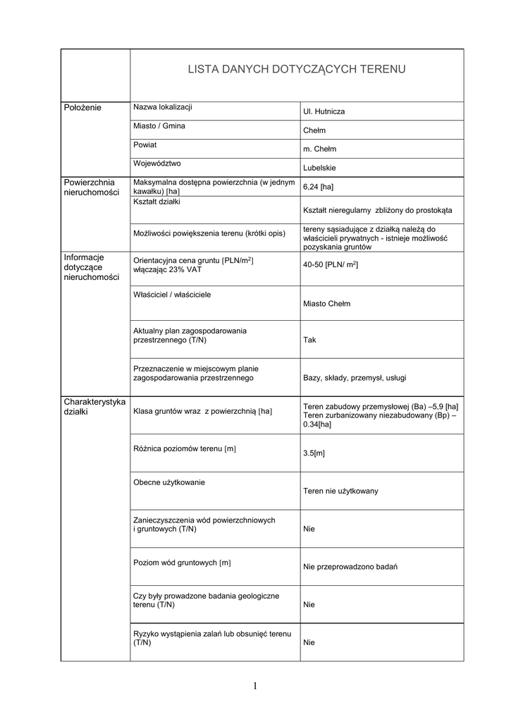 LISTA DANYCH DOTYCZĄCYCH TERENU Położenie Nazwa lokalizacji Ul. Hutnicza Miasto / Gmina Chełm Powiat m. Chełm Województwo Powierzchnia nieruchomości Lubelskie Maksymalna dostępna powierzchnia (w jednym kawałku) ha Kształt działki 6,24 [ha] Kształt nieregularny zbliżony do prostokąta Możliwości powiększenia terenu (krótki opis) Informacje dotyczące nieruchomości Orientacyjna cena gruntu PLN/m2 włączając 23% VAT tereny sąsiadujące z działką należą do właścicieli prywatnych - istnieje możliwość pozyskania gruntów 40-50 [PLN/ m2] Właściciel / właściciele Miasto Chełm Aktualny plan zagospodarowania przestrzennego (T/N) Tak Przeznaczenie w miejscowym planie zagospodarowania przestrzennego Bazy, składy, przemysł, usługi Charakterystyka Klasa gruntów wraz z powierzchnią ha działki Różnica poziomów terenu m Teren zabudowy przemysłowej (Ba) –5,9 [ha] Teren zurbanizowany niezabudowany (Bp) – 0.34[ha] 3.5[m] Obecne użytkowanie Teren nie użytkowany Zanieczyszczenia wód powierzchniowych i gruntowych (T/N) Poziom wód gruntowych m Nie Nie przeprowadzono badań Czy były prowadzone badania geologiczne terenu (T/N) Nie Ryzyko wystąpienia zalań lub obsunięć terenu (T/N) Nie 1 Tak wodociąg, kable energetyczne, kanalizacja sanitarna Przeszkody podziemne (T/N) Przeszkody występujące na powierzchni terenu Tak (T/N) Budynki, wiaty, słupy eN, studnie ks i kd, nawierzchnia utwardzona w części działek Istniejące ograniczenia ekologiczne (T/N) Nie Budynki i zabudowania na terenie (T/N) Połączenia transportowe Tak (Budynek biurowy, 2-kond, murowany, pow-412m2 ) Droga dojazdowa do terenu (rodzaj drogi i jej szerokość) Droga powiatowa lokalna nr P0018840662011, szerokość 5m Autostrada / droga krajowa km Droga krajowa nr 12 – 0,2km Porty rzeczne i morskie w odległości do 200 km Kolej km Porty rzeczne : Kazimierz Dolny – 122km Puławy -118km 0.5 [km] Bocznica kolejowa km 0.5 [km] Istniejąca infrastruktura Najbliższe lotnisko międzynarodowe km Odległość do lotniska: Port lotniczy Lublin – 70km Najbliższe miasto wojewódzkie km Odległość od miasta wojewódzkiego: Lublin – 70km Elektryczność na terenie (T/N) Nie Odległość przyłącza od granicy terenu Napięcie W bezpośrednim sąsiedztwie 15 [kV] Dostępna moc Według potrzeb inwestora Gaz na terenie (T/N) Nie Odległość przyłącza od granicy działki Wartość kaloryczna Średnica rury Odległość ok 80m od granicy działki nie mniejsza niż 34,0 MJ/m3 160 [mm] 2 Dostępna objętość 2000 [Nm3/h] Woda na terenie (T/N) Tak Odległość przyłącza od granicy terenu Dostępna objętość Według potrzeb inwestora Kanalizacja na terenie (T/N) Tak Odległość przyłącza od granicy terenu Dostępna objętość Oczyszczalnia ścieków na terenie bądź w bezpośrednim sąsiedztwie Nie Telefony (T/N) Nie Uwagi Odległość przyłącza od granicy terenu Connection point (distance from boundary) m Odległość ok 5m od granicy działki Przez miasto Chełm przebiega droga kołowa o międzynarodowym znaczeniu nr 12 klasy GP równoleżnikowo przez obszar Polski od granicy z Niemcami w Łęknicy do granicy z Ukrainą w Dorohusku; droga jest częścią europejskiego szlaku E373. Droga krajowa nr 12 w Piaskach łączy się z drogą krajową nr 17, tj. drogą krajową klasy GP ,przebiegającą od wschodnich granic Warszawy w kierunku południowo-wschodnim przez województwa mazowieckie oraz lubelskie. Łączy aglomeracje warszawską oraz lubelską z jednym z najczęściej wykorzystywanych polsko-ukraińskich przejść granicznych w Hrebennem; jest częścią europejskiego szlaku E372. Przez miasto Chełm przebiega linia kolejowa o międzynarodowym znaczeniu: linia kolejowa nr 7 (Kolej Nadwiślańska) łącząca Warszawę, Lublin, Chełm z granicą państwa w Dorohusku, a dalej z Kijowem. Obecnie jedna z najważniejszych linii kolejowych w Polsce; stacja towarowa posiada tory szerokie o rozstawie 1520 mm, wykorzystywane do transportu bezpośredniego wagonów pomiędzy Polską i Ukrainą, stwarzając doskonałe możliwości rozwoju logistyki. Główne branże gospodarki o największym potencjale rozwoju w regionie: • przemysł • branża lotnicza, • usługi dla ruchu transgranicznego, • turystyka, • rolnictwo, • szkolnictwo, Produkty niszowe wyróżniające Chełm na tle innych lokalizacji: • udostępnienie zaplecza i potencjału technicznego PWSZ dla rozwoju produktów zaawansowanych technologicznie, • wykorzystanie wyjątkowych walorów lokalizacji i ruchu transgranicznego, • stworzenie i promocja produktów turystycznych w oparciu o usługi małego lotnictwa Państwowa Wyższa Szkoła Zawodowa w Chełmie, w obszarze dydaktycznym, jak i naukowo-badawczym stanowi potencjał dla podjęcia działań mających na celu stworzenie uwarunkowań dla rozwoju branży lotniczej. Chełm leży w pasie objętym umową o małym ruchu przygranicznym z Ukrainą. Według danych GUS w ostatnich latach nastąpił wzrost obrotów na tym terenie. Największe natężenie ruchu granicznego na granicy polsko-ukraińskiej: eksport towarów na Ukrainę w I. kwartale 2013 r. wyniósł 3,8 mld zł, natomiast import z Ukrainy wyniósł 1,8 mld zł. 3 Kontakt Urząd Miasta Chełm Wydział Rozwoju, Promocji i Współpracy z Zagranicą Tel. +48 82 564 36 68 Załączniki: 1. 2. 3. 4. Mapa pokazująca położenie nieruchomości na tle miasta Mapa terenu pokazująca infrastrukturę Mapa terenu pokazująca sieć połączeń transportowych Fot. terenu. Załącznik 1 4 \ Załącznik 2 5 Załącznik 3 Załącznik 4 6
