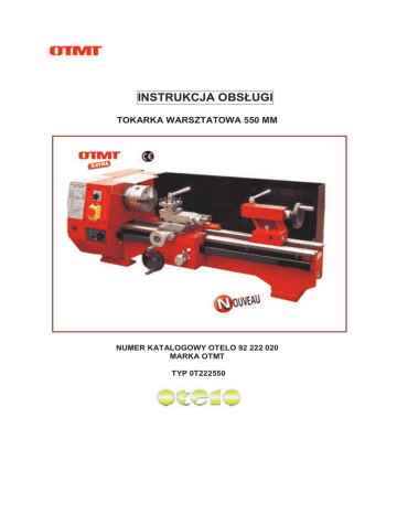 INSTRUKCJA OBSŁUGI TOKARKA WARSZTATOWA 550 MM NUMER KATALOGOWY OTELO 92 222 020 MARKA OTMT TYP 0T222550 BEZPIECZEŃSTWO I HIGIENA PRACY PRZY UśYCIU TOKARKI 1. NaleŜy upewnić się, czy wszystkie osłony zostały prawidłowo zainstalowane. 2. Przed uruchomieniem obrabiarki naleŜy upewnić się czy przedmiot obrabiany został właściwie zamocowany w uchwycie i czy zostały przeprowadzone próby bez skrawania. 3. Wyregulować imak noŜowy, sprawdzić swobodne obracanie imaka wraz z narzędziami i brak kolizji w elementami obrabiarki i przedmiotu obrabianego. 4. NaleŜy dobrać właściwy zakres obrotów wrzeciona w stosunku do technologii, rodzaju materiału oraz narzędzia; naleŜy przeprowadzić próbę maksymalnych obrotów przed skrawaniem. 5. Nie wolno zmieniać kierunku obrotów wrzeciona kiedy wrzeciono obraca się. 6. Nie wolno zatrzymywać wrzeciona ręką. 7. Nie wolno zostawiać obrabiarki w czasie pracy bez nadzoru. 8. Nie wolno zostawiać klucza w uchwycie tokarskim. 9. Nie naleŜy uŜywać obrabiarki z uszkodzeniami lub z zuŜytymi narzędziami; NaleŜy przestrzegać rutynowych przeglądów oraz obsługi serwisowej. 10. NaleŜy obrabiarkę wyłączyć z zasilania przed czynnościami serwisowymi, regulacyjnymi, przeglądowymi. 11. Wszelkie artykuły ochronne takie jak odzieŜ ochronną, rękawice jak równieŜ biŜuterię, długie włosy naleŜy trzymać z dala od wrzeciona. 12. NaleŜy uŜywać wyłączne dobrych, ostrych narzędzi, prawidłowo zamocowanych w odpowiednich, przewidzianych dla nich miejscach. 13. NaleŜy uŜywać klocków drewnianych jako podpory przy wymianie uchwytów tokarskich, wiertarskich, frezarskich. UWAGA KaŜde otoczenie warsztatowe jest odmienne i wymienione zasady przestrzegania bezpieczeństwa i higieny pracy są nie w pełni adekwatne do indywidualnych warunków pracy. NaleŜy zawsze kierować się indywidualnym bezpieczeństwem pracy, naleŜy uŜywać urządzeń, obrabiarek, narzędzi wyjątkowo ostroŜnie. Brak indywidualnej ostroŜności moŜe spowodować wypadek przy pracy, uszkodzenie zdrowia, uszkodzenia wyposaŜenia oraz wykonywanej pracy. OSTRZEśENIE Brak znajomości prawidłowej funkcjonalności obrabiarki jak równieŜ podstawowych zasad bezpieczeństwa w zakresie obróbki skrawaniem moŜe spowodować wypadek przy pracy. INSTRUKCJ Ę OBSŁUGI NALEśY PRZECZYTAĆ PRZED UśYCIEM URZĄDZENIA. UZIEMIENIE INSTALACJI ELEKTRYCZNEJ NaleŜy przestrzegać zasad podłączenia urządzenia do uziemionej instalacji elektrycznej. OTELO Sp. z o.o. Ul. Armii Krajowej 49, 05-600 Grójec, Polska +48 48 664 07 00 +48 48 664 07 07 2 SPECYFIKACJA Specyfikacja zawiera listę elementów obsługowych tokarki. Prosimy o zapoznanie się z nimi oraz z ich funkcjonowaniem. Ułatwi to zrozumienie instrukcji obsługi oraz terminologii w niej zawartej. 1. Tabliczka gwintów i prędkości 2. Przełącznik obrotów prawych i lewych 3. Tabliczka znamionowa tokarki 4. Wyłącznik bezpieczeństwa, ON/OFF 5. Lampka sygnalizacyjna zasilanie 6. Selektor 7. Osłona uchwytu 8. Uchwyt tokarski 9. Pokrętło ręcznego przesuwu wzdłuŜnego suportu 10. Pokrętło ręcznego przesuwu poprzecznego suportu 11. Dźwignia mechanicznego przesuwu o suportu 12. Suport poprzeczny 13. Szufladka z imakiem 14. Dźwignia imaka 15. Pokrętło przesuwu szufladki 16. Kieł stały 17. Śruby blokujące konik 18. Wskaźnik przestawienia konika 19. Pokrętło wysuwu pinoli konika 20. Dźwignia blokady pinoli konika OTELO Sp. z o.o. Ul. Armii Krajowej 49, 05-600 Grójec, Polska +48 48 664 07 00 +48 48 664 07 07 3 INSTALACJA Wstępne czynności instalacyjne Tokarka jest fabrycznie zapakowana w odpowiednią skrzynię. Wszelkie nie malowane powierzchnie zostały zabezpieczone specjalnym środkiem antykorozyjnym. NaleŜy usunąć to zabezpieczenie przy uŜyciu rozpuszczalnika lub środka odłuszczającego, bez zawartości chloru. Niektóre elementy tokarki będą musiały być zdemontowane. Dla optymalnego uŜytkowania, naleŜy usunąć zabezpieczenie ze wszystkich ruchomych, stykających się elementów. Wykaz wyposaŜenia standardowego • • • • • • • • • • • Tokarka Uchwyt tokarski 3-szczękowy Klucz do uchwytu tokarskiego Koła zębate ilości zębów: 30, 40, 42, 50, 52, 60, 66, 70, 75, 80 Koło zębate o ilości zębów 40 (zainstalowane fabrycznie) Klucz kwadratowy Klucze obsługowe 3, 4, 5, 6, mm Klucze obsługowe 5,5/7; 8/10; 12/14; 17/19 mm Kły stałe MK2 i MK3 Klucz obsługowy 45-52 Bezpieczniki Charakterystyka techniczna Typ Wznios kłów Odległość między kłami Przelot wrzeciona Przelot wrzeciona Końcówka wrzeciona Końcówka pinoli konika Obroty wrzeciona Zasilanie Moc Gwinty metryczne Gwinty calowe Wymiary CięŜar OT222550 125 mm 550 mm 20 mm Ø 20 mm MK3 MK2 125 – 2000 obr./min (6 stopni) 230 v, 50Hz 550 W 0,4-3,0 mm 10-44 TPI 1200x660x600 180 kg OTELO Sp. z o.o. Ul. Armii Krajowej 49, 05-600 Grójec, Polska +48 48 664 07 00 +48 48 664 07 07 4 Wstępne uruchomienie tokarki Przed skrawaniem należy przeprowadzić wstępny rozruch tokarki dla sprawdzenia prawidłowości jej funkcjonowania. 1. Należy upewnić się, czy klucz do zacisku szczęk został usunięty z uchwytu tokarskiego. Osłona uchwytu winna być w położeniu dolnym. PowyŜsze czynności powinny być wykonywane przed kaŜdorazowym uruchomieniem obrabiarki. 2. Zapoznać się ze elementami obsługi obrabiarki (wg rysunku); zwolnić wyłącznik bezpieczeństwa. Elementy obsługowe tokarki od góry: Przełącznik obrotów prawych / lewych – Wyłącznik bezpieczeństwa – Selektor – Dźwignia przesuwu suportu 3. Włączyć tokarkę do zasilania. 4. Ustawić dźwignię posuwu suportu w pozycji neutralnej, niezałączonej; Suport nie powinien się przesuwać. 5. Przełączyć selektor do pozycji „CUTING”. Lampka sygnalizacyjna winna się zapalić. JeŜeli się nie pali, naleŜy tokarkę odłączyć od zasilania, sprawdzić stan bezpieczników, sprawdzić zasilanie, podłączenie obrabiarki. 