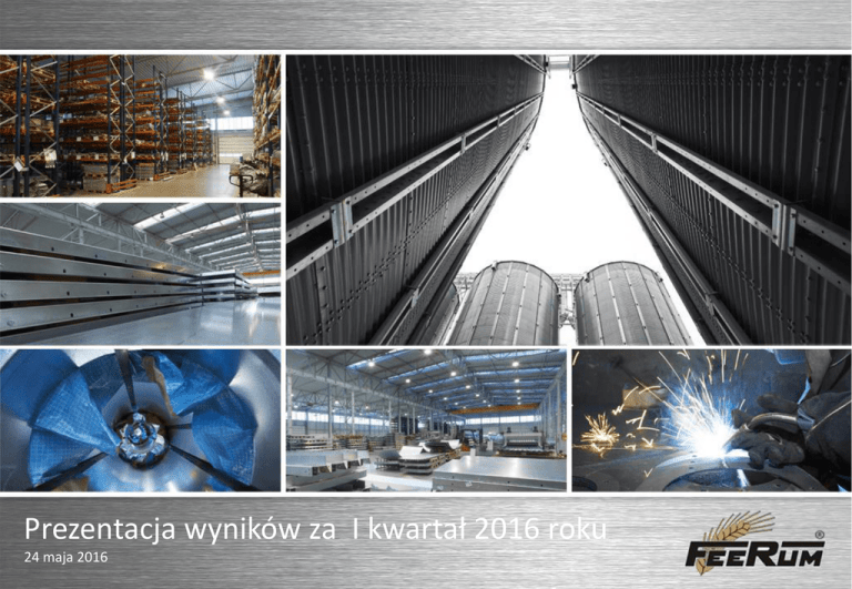 Prezentacja wyników za I kwartał 2016 roku 24 maja 2016 Osoby prezentujące Daniel Janusz Prezes Zarządu Piotr Wielesik Członek Zarządu 2 Najważniejsze wydarzenia I kwartału 2016 roku Program inwestycyjny w trakcie realizacji Wyniki finansowe I kwartału 2016 roku Kierunki rozwoju sprzedaży Strategia Podsumowanie 3 Najważniejsze wydarzenia I kwartału 2016 roku Wyniki finansowe w I kwartale 2016 roku niższe niż w analogicznym okresie roku ubiegłego z powodu przesunięcia okresu przyznawania dofinansowania unijnego z ARiMR. Wysoki portfel zamówień potencjalnych pozwala z optymizmem patrzeć na perspektywy 2016 i 2017 roku. Kontynuacja działań sprzedażowych na rynkach Europy Zachodniej w 2016 roku, rozpoczęte projekty na rynku rumuńskim, spodziewane kontrakty na rynku mołdawskim, węgierskim, czeskim oraz powrót na rynek białoruski i mongolski. Efektywna działalność badawczo-rozwojowa ukoronowana wyróżnieniem w postaci tytułu Jakość Roku 2015 w kategorii Innowacje przyznanym przez Fundację Qualitas Europejskie Centrum Promocji Dobrych Praktyk Biznesowych. Certyfikat „Przedsiębiorstwo Przyszłości” przyznawany najnowocześniejszym i najbardziej nowatorskim polskim firmom w ramach ogólnopolskiego programu certyfikacji przedsiębiorstw przez niezależną komisję złożoną z autorytetów naukowych i eksperckich. Efektywne wykorzystanie zintegrowanego systemu zarządzania przedsiębiorstwem klasy ERP Impuls wraz z platformą do projektowania i konstruowania na bazie Solidworks owocuje wysoką gotowością produkcyjną i istotnie wzmocnioną przewagą konkurencyjną. Wpływ płatności końcowych z dotacji unijnych, pozytywnie zakończone procedury kontrolne. Spółka otrzymała dofinansowanie w kwocie ponad 25 mln PLN 2013 rok – 6,5 mln PLN, 2014 rok – 7,8 mln PLN, 2015 rok – 9,5 mln PLN, 2016 rok - 1,2 mln PLN. 4 Najważniejsze wydarzenia I kwartału 2016 roku Program inwestycyjny na lata 2016-2018 Wyniki finansowe I kwartału 2016 roku Kierunki rozwoju sprzedaży Strategia Podsumowanie 5 Inwestycje w trakcie realizacji – Program 2016-2017 Zaawansowane lekkie ortotropowe konstrukcje płaszczy stalowych silosów płaskodennych Prace badawczo-rozwojowe Wzmocnienie potencjału produkcyjnego Przedmiotem projektu jest przeprowadzenie zaawansowanych prac B+R w celu opracowania innowacyjnych silosów zbożowych płaskodennych charakteryzujących się ortotropową konstrukcją płaszczy stalowych oraz nowoczesną konstrukcją połączenia pionowych żeber płaszcza z fundamentami silosu. Rozbudowa istniejącego parku maszynowego. Zakup maszyn i urządzeń. Nowoczesne linie produkcyjne zapewniają wysoką precyzję wykonania i jakość produkowanych wyrobów. Innowacyjne rozwiązania technologiczne dzięki automatyzacji procesów produkcyjnych przyczyniają się do umacniania przewagi rynkowej. Rezultat projektu będzie stanowił bezpośrednią odpowiedź na potrzeby Klientów dot. poprawy warunków i jakości przechowywania zbóż (oczekiwana większa stabilność termiczna i wilgotnościowa magazynowania), minimalizacji wpływu czynników atmosferycznych na jakość zboża, poprawy bezpieczeństwa użytkowania silosów i zmniejszenia kosztów transportu elementów konstrukcyjnych oraz montażu silosów. Modernizacja hali produkcyjnej umożliwi optymalizację procesów produkcyjnych, utrzymanie krótkich terminów dostaw przy rosnącej skali produkcji. Zaawansowane technologicznie urządzenia i linie produkcyjne wymagają precyzyjnej konfiguracji stanowisk w celu eliminacji zbędnych kosztów niewykorzystanych mocy przerobowych. 13,6 Unikalne parametry nowego produktu uzyskane dzięki nowatorskiej konstrukcji silosu, zapewnią poprawę warunków przechowywania zboża, zmniejszą jego straty w przechowalnictwie o 5% i poprawią trwałość i jakość ziarna w łańcuchu żywnościowym. Szacowana wartość inwestycji to 3,0 mln PLN. Finansowane zaplanowano ze środków własnych. Szacowana wartość inwestycji to 3,0 mln PLN. Finansowane zaplanowano ze środków własnych. 6 Inwestycje w trakcie realizacji – Program 2016-2018 1 Prace badawczo-rozwojowe 2 Wzmocnienie potencjału produkcyjnego Zakup maszyn i urządzeń Ortotropowe konstrukcje silosów Modernizacja hali produkcyjnej Modernizacja hali produkcyjnej mln PLN 3,0 Nakłady planowane 3,0 6,0 0,68 Nakłady poniesione 0,26 0,9 0,68 Środki własne 0,26 0,9 7 Obszar Produkcji Nowy układ maszyn w związku modernizacją zakładu produkcyjnego z rozbudową i Doskonalenie systemu planowania produkcją – zmiany organizacyjne 8 Obszar Zakupów Prace nad wdrożeniem urządzeń zasilanych pneumatycznie - rozpoczęto prace nad wprowadzeniem nowych urządzeń zasilanych pneumatycznie a nie elektrycznie. Tego rodzaju rozwiązanie zapewni znaczne obniżenie kosztu jednostkowego produktu, obniży zużycie energii elektrycznej oraz wpłynie na wyższe bezpieczeństwo bezawaryjności urządzeń FEERUM. Z punku widzenia zakupów plan ma na celu osiągnięcie oszczędności na poziomie 40-50%. Wprowadzenie uszczelnienia butylowego do połączeń śrubowych - bezpośrednia współpraca z producentami. Obniżono koszty zakupu o 30% poprzez ominięcie siatki dystrybucyjnej. Ponadto zastosowanie tej technologii przekłada się bezpośrednio na zwiększone zabezpieczenie szczelności połączeń śrubowych i redukcję kosztów serwisu. Wprowadzenie nowego produktu „Agregat do chłodzenia ziarna” – nowością w ofercie FEERUM jest innowacyjny agregat do chłodzenia ziarna, który powstał w ramach współpracy z kooperantem. Opracowanie własnego rozwiązania umożliwiło zdecydowane obniżenie kosztów zakupu gotowych rozwiązań funkcjonujących na rynku oraz wyjście do klienta z atrakcyjnym technicznie i cenowo produktem. 13,6 Wprowadzenie maszyn czyszczących do ziarna w oparciu o kontraktową produkcję dla FEERUM przez zagranicznego dostawcę. Działanie pozwoliło na osiągnięcie oszczędności zakupu w g