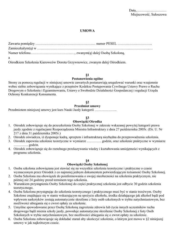 Data,……….….………… Miejscowość, Sułoszowa UMOWA Zawarta pomiędzy …………………………………………… numer PESEL …………….………….. Zamieszkałym(ą) w …………………………………………………………………….……………..… Numer telefonu……………………………..…, zwanym(ą) dalej Osobą Szkoloną, a Ośrodkiem Szkolenia Kierowców Dorota Grzywnowicz, zwanym dalej Ośrodkiem. §1 Postanowienia ogólne Strony za pomocą regulacji w niniejszej umowie zawartych postanawiają uregulować warunki oraz wzajemnie wobec siebie zobowiązania wynikające z przepisów Kodeksu Postępowania Cywilnego Ustawy Prawo o Ruchu Drogowym o Szkoleniu i Egzaminowaniu, Ustawy o Swobodzie Działalności Gospodarczej i regulacji Urzędu Ochrony Konkurencji Konsumenta. §2 Przedmiot umowy Przedmiotem niniejszej umowy jest kurs Nauki Jazdy kategorii ……………….. 1. 2. 3. 4. 1. 2. 3. 4. 5. 6. §3 Obowiązki Ośrodka Ośrodek zobowiązuje się do przeszkolenia Osoby Szkolonej w zakresie wskazanej powyżej kategorii prawa jazdy zgodnie z regulacjami Rozporządzenia Ministra Infrastruktury z dnia 27 października 2005r. (Dz. U. Nr 217 z dnia 31 października 2005r.) Ośrodek oświadcza, iż dysponuje kadrą, sprzętem i infrastrukturą niezbędna do przeprowadzenia szkolenia. Ośrodek zapewnia szkolenie teoretyczne w wymiarze …………. godzin, oraz szkolenie praktyczne w wymiarze …………. godzin. Ośrodek zobowiązuje się do rzetelnego przekazywania wiedzy i kształtowania umiejętności wynikających z programu szkolenia. §4 Obowiązki Osoby Szkolonej Osoba szkolona zobowiązana jest stawiać się na wszystkie szkolenia teoretyczne i praktyczne o czasie wyznaczonym przez Ośrodek z co najmniej jednym dokumentem potwierdzającym tożsamość Osoby Szkolonej. Osoba Szkolona ma obowiązek do poinformowania o swojej nieobecności na szkoleniu praktycznym, nie później niż 24 godziny przed terminem tego szkolenia. Warunkiem przystąpienia Osoby Szkolonej do części praktycznej szkolenia jest odbycie 30 godzin szkolenia teoretycznego. Osoba Szkolona przystępując do szkolenia teoretycznego i praktycznego musi być w stanie trzeźwym. Osoby Szkolone znajdujące się w stanie wskazującym na spożycie alkoholu, środka działającego jak alkohol bądź pod wpływem narkotyków zostają automatycznie skreślone z listy osób szkolonych w trybie natychmiastowym, bez możliwości ubiegania się o zwrot opłaty za szkolenie. Umyślne spowodowanie przez Osobę Szkoloną zagrożenia zdrowia lub życia innych uczestników ruchu drogowego bądź mienia szkoły jazdy, powoduje automatyczne skreślenie Osoby Szkolonej z listy Osób Szkolonych w trybie natychmiastowym, bez możliwości ubiegania się o zwrot opłaty za szkolenie. Osoba Szkolona zobowiązuje się dokładać starań aby ukończyć szkolenie, o którym jest mowa w §2 niniejszej umowy w jak najkrótszym czasie. 1. §5 Opłaty Strony ustalają koszt szkolenia na kwotę ………………….., słownie ………………………………… …………………………………………………..………………………………………………………. Osoba szkolona zobowiązuje się uiścić opłatę za szkolenie, o którym mowa w ust. 1 w całości przed rozpoczęciem tego szkolenia, Osoba Szkolona może płatność za szkolenie podstawowe rozłożyć na nieoprocentowane raty, że przed przystąpieniem do szkolenia Osoba Szkolona musi wpłacić nie mniej niż 300zł. Do końca części teoretycznej szkolenia wymagana jest wpłata w łącznej kwocie 700zł. Kolejna rata w wysokości 500zł wymagana jest do 10 godzin szkolenia praktycznego. Całość opłaty za kurs osoba szkolona musi opłacić najpóźniej do 20 godziny szkolenia praktycznego. Opłata za poprawkowy egzamin wewnętrzny praktyczny wynosi 30zł. Opłata za szkolenie praktyczne nieodbyte z winy osoby szkolonej wynosi 40zł za każdą planowaną godzinę tego szkolenia. Opłata za wypowiedzenie umowy bez winy Ośrodka wynosi: a. 35zł za każdą godzinę odbytego szkolenia teoretycznego, b. 50zł za każdą godzinę odbytego szkolenia praktycznego. 2. 3. 4. 5. 6. §6 Badania lekarskie 1. Ośrodek w zakresie świadczonych usług na rzecz Osób Szkolonych zapewnia przeprowadzenie badań lekarskich osób szkolonych ubiegających się o uprawnienia do kierowania pojazdami. Koszt takiego badania wynosi 200zł, słownie dwieście złotych i pokrywa je Osoba Szkolona, chyba że w §5 ust. 1 wskazują inaczej. 2. Ośrodek pozostawia Osobie Szkolonej dowolność w wyborze usługi lekarskiej w zakresie przeprowadzenia badań lekarskich osób ubiegających się o uprawnienia do kierowania pojazdami i honoruje orzeczenia lekarskie wystawione przez lekarze nie współpracujących z Ośrodkiem. Przedstawienie orzeczenia lekarskiego jest warunkiem rozpoczęcia szkolenia. §7 Zaświadczenie o ukończeniu kursu Ośrodek oświadcza, iż uregulowane przez Osobę Szkoloną całości zobowiązania wobec Ośrodka jest warunkiem niezbędnym do uzyskania Zaświadczenia o ukończeniu szkolenia, chyba że w Aneksie do Umowy ustalono inaczej. §8 Zmiana Ośrodka 1. Osoba szkolona ma prawo do zmiany Ośrodka w trakcie szkolenia. W takim przypadku dotychczasowy Ośrodek wystawia Osobie Szkolonej wtórnik karty przeprowadzonych zajęć, celem kontynuacji w innym Ośrodku. 2. W przypadku chęci zmiany Ośrodka, Osoba Szkolona zobowiązana jest do pokrycia niezbędnych kosztów dotychczasowego szkolenia, wskazanych w Regulaminie Szkolenia dostępnym w siedzibie Ośrodka. §9 Regulamin Ośrodka Osoba Szkolona oświadcza, iż zapoznała się z Regulaminem Szkolenia dostępnym w siedzibie Ośrodka. §10 Postanowienia końcowe 1. Strony oświadczają, że zapoznały się z wyżej wymienionymi warunkami umowy i w całości ją akceptują, co poświadczają własnoręcznym podpisem. 2. Kwestie sporne, nieuregulowane w niniejsze