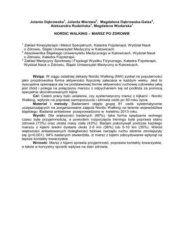 Jolanta Dąbrowska1, Jolanta Mierzwa2, Magdalena Dąbrowska-Galas3, Aleksandra Rudzińska1, Magdalena Wodarska1 NORDIC WALKING – MARSZ PO ZDROWIE 1 Zakład Kinezyterapii i Metod Specjalnych, Katedra Fizjoterapii, Wydział Nauk o Zdrowiu, Śląski Uniwersytet Medyczny w Katowicach. 2 Absolwentka Śląskiego Uniwersytetu Medycznego w Katowicach, Wydział Nauk o Zdrowiu, Katedra Fizjoterapii. 3 Zakład Medycyny Sportowej i Fizjologii Wysiłku Fizycznego, Katedra Fizjoterapii, Wydział Nauk o Zdrowiu, Śląski Uniwersytet Medyczny w Katowicach. Wstęp: W ciągu ostatniej dekady Nordic Walking (NW) zyskał na popularności jako prozdrowotna forma aktywności fizycznej zalecana w każdym wieku. Jest to dyscyplina opierająca się na podstawowej formie aktywności ruchowej człowieka jaką jest chód i polega na połączeniu marszu z odpychaniem się od podłoża za pomocą specjalnie skonstruowanych kijów. Cel: Celem pracy było ustalenie, czy systematyczny marsz z kijkami - Nordic Walking, wpłynie na poprawę samopoczucia i zdrowia osób po 50 roku życia. Materiał i metody: Badaniami objęto grupę 81 osób systematycznie uczęszczających na zorganizowane zajęcia Nordic Walking na terenie województwa śląskiego. Badania ankietowe przeprowadzono w kwietniu 2013 roku. Wyniki: Dla większości badanych (60%), taka forma spędzania wolnego czasu była przyjemnością, a powodem rozpoczęcia treningu była poprawa stanu zdrowia (73%) oraz utrata masy ciała (43%). Badani pokonywali podczas każdego marszu z kijami średni dystans około 2-5 km (38%) lub 5-10 km (35%). Wśród większości ankietowanych dolegliwości bólowe narządu ruchu istotnie zmniejszyły się (p=0,001). 94% badanych stwierdziła, iż marsz z kijami zdecydowanie wpłynął na lepsze kontakty towarzyskie. Wnioski: Marsz z kijami sprawia przyjemność, poprawia kontakty towarzyskie, a także w korzystny sposób wpływa na stan zdrowia.