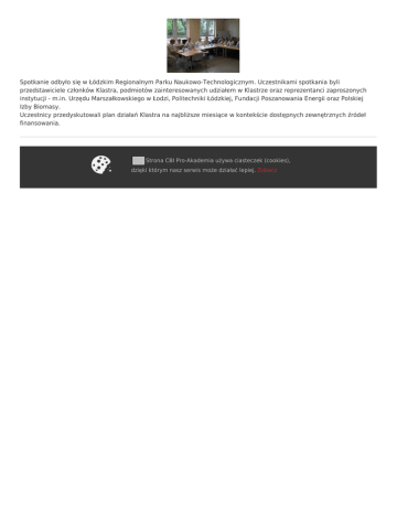 Spotkanie odbyło się w Łódzkim Regionalnym Parku Naukowo-Technologicznym. Uczestnikami spotkania byli przedstawiciele członków Klastra, podmiotów zainteresowanych udziałem w Klastrze oraz reprezentanci zaproszonych instytucji - m.in. Urzędu Marszałkowskiego w Łodzi, Politechniki Łódzkiej, Fundacji Poszanowania Energii oraz Polskiej Izby Biomasy. Uczestnicy przedyskutowali plan działań Klastra na najbliższe miesiące w kontekście dostępnych zewnętrznych źródeł finansowania. Strona CBI Pro-Akademia używa ciasteczek (cookies), dzięki którym nasz serwis może działać lepiej. Zobacz
