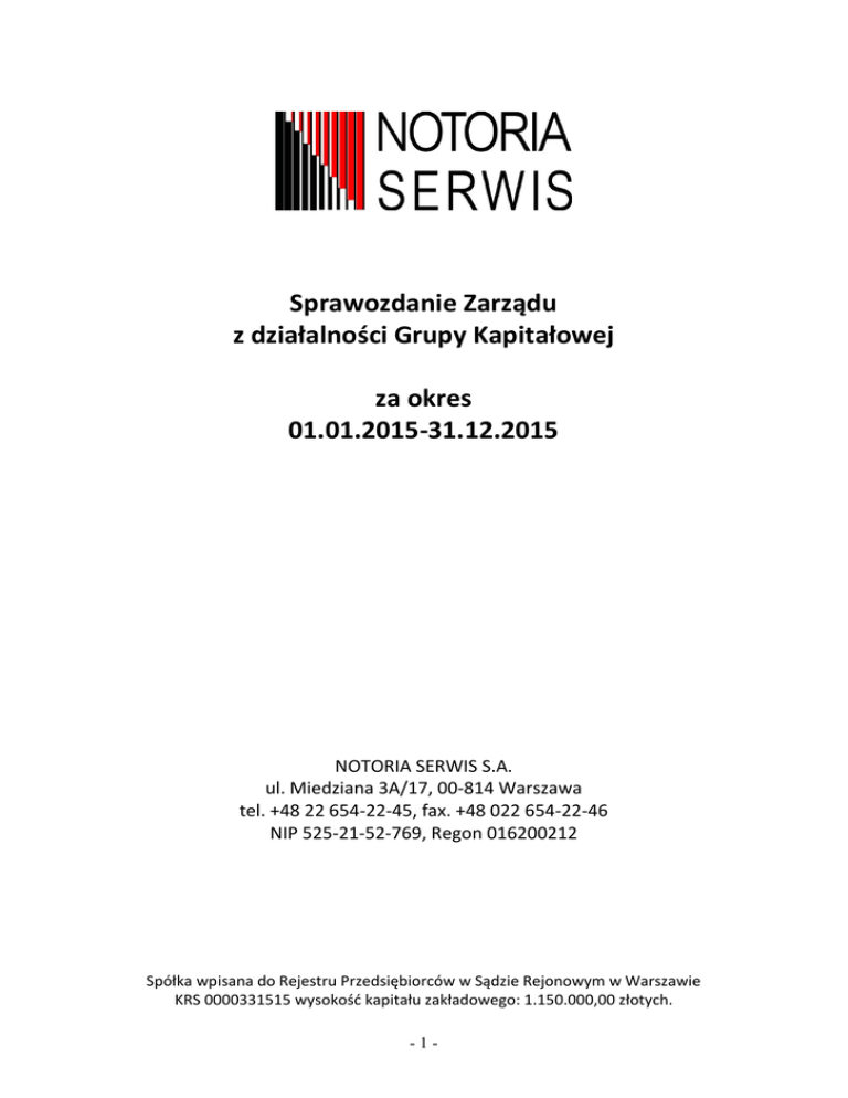 Sprawozdanie Zarządu z działalności Grupy Kapitałowej za okres 01.01.2015-31.12.2015 NOTORIA SERWIS S.A. ul. Miedziana 3A/17, 00-814 Warszawa tel. +48 22 654-22-45, fax. +48 022 654-22-46 NIP 525-21-52-769, Regon 016200212 Spółka wpisana do Rejestru Przedsiębiorców w Sądzie Rejonowym w Warszawie KRS 0000331515 wysokość kapitału zakładowego: 1.150.000,00 złotych. -1- Pismo Zarządu do Akcjonariuszy Szanowni Państwo, Przedstawiamy Państwu raport podsumowujący działalność Grupy Kapitałowej Notoria Serwis S.A. w 2015 roku. Po raz kolejny Grupa osiągnęła nadwyżkę finansową, która pozwala na finansowanie inwestycji w nowe produkty i udoskonalanie już istniejących. Sprzedaż usług opartych o nową bazę sprawozdań finansowych, rozpoczętą od stycznia 2015 roku systematycznie rośnie. Specjalistyczny serwis Notoria Online jest doceniany na rynku ze względu na swoją kompleksowość i unikatowość rozwiązań. Dodatkowo został on wzbogacony o nowe moduły, zawierające dane o funduszach i obligacjach. Nasz drugi produkt, którym jest zaawansowane oprogramowanie do analizy technicznej i analizy fundamentalnej Notoria StockGround 2.5, sprzedaje się ze stałą dynamiką. Wspólnie z naszym partnerem z Turcji, firmą Rasyonet SA pracujemy nad rozszerzeniem informacji o nowych rynkach. Dziękujemy za zaufanie wszystkim naszym Inwestorom oraz Partnerom. Jesteśmy przekonani, że rok 2016 będzie kolejnym rokiem dynamicznego rozwoju, co znajdzie swoje odzwierciedlenie w wynikach finansowych Grupy Kapitałowej. Z wyrazami szacunku _________________ Prezes Zarządu Artur Sierant _________________ Wiceprezes Zarządu Małgorzata Opalińska Warszawa, 31 maja 2016 roku -2- Informacje o Spółce 1. Informacje podstawowe o firmie Nazwa spółki Notoria Serwis S.A. siedziba: 00-814 Warszawa, ul. Miedziana 3A/17 Telefon: 0-22/654-22-45 Tel/Fax: 0-22/654-22-46 adres www www.notoria.pl adres email [email protected] NIP PL 525-21-52-769 REGON 016200212 KRS 0000331515 2. Władze Spółki Zarząd Spółki: W okresie od 1 stycznia 2015 roku do 24 czerwca 2015 roku Zarząd Spółki był dwuosobowy. Prezesem Zarządu był Artur Sierant, a Wiceprezesem Zarządu Joanna Żukowska. W dniu 24 czerwca 2015 roku Rada Nadzorcza Spółki odwołała ze składu Zarządu panią Joannę Żukowską i powołała w skład Zarządu panią Małgorzatę Opalińską. Objęła ona funkcję w Zarządzie Spółki z dniem 15 lipca 2015 roku. W okresie od 25 czerwca do 14 lipca 2015 roku zarząd był jednoosobowy. Prezesem Zarządu był Artur Sierant. Od 15 lipca 2015 roku do 31 grudnia 2015 roku Zarząd spółki tworzyli: Artur Sierant – Prezes Zarządu, Małgorzata Opalińska – Wiceprezes Zarządu. Prokura: Od 01 stycznia 2015 roku do 31 grudnia 2015 roku pani Katarzyna Marczak sprawowała prokurę łączną. Rada Nadzorcza: W okresie od 1 stycznia 2015 roku do 31 grudnia 2015 roku Radę Nadzorczą Spółki tworzyli: Grzegorz Dróżdż – Przewodniczący Rady Nadzorczej Joanna Billewicz-Fotowicz – Wiceprzewodnicząca Rady Nadzorczej Arkadiusz Garbarczyk – Członek Rady Nadzorczej Janusz Grabski – Członek Rady Nadzorczej Krystian Krupski – Członek rady Nadzorczej Katarzyna Sieńkowska – Członek Rady Nadzorczej Maciej Sierant – Członek Rady Nadzorczej -3- 3. Czas trwania Spółki Czas trwania Spółki jest nieograniczony. Sprawozdanie finansowe zostało sporządzone przy założeniu kontynuowania działalności przez Spółkę. 4. Struktura akcjonariatu Na dzień 31.12.2015 r. struktura akcjonariatu Spółki – zgodnie z danymi posiadanymi przez Spółkę na podstawie zawiadomień otrzymanych od akcjonariuszy – wyglądała następująco: Udział w Liczba akcji i ogólnej liczbie głosów głosów Akcjonariusz Udział w kapitale Wojciech Kuryłek 287.533 25,00% 25,00% Artur Sierant z Rant sp. z o.o. 263.623 22,92% 22,92% Wiesław Krasuski 150.000 13,04% 13,04% 81.754 7,11% 7,11% 367.090 31,92% 31,92% 1.150.000 100,00% 100,00% Marek Rojewski z Elmwart12 sp. z o.o. i Karol Investment & Advising sp. z o.o. Pozostali Ogółem Na dzień sporządzenia sprawozdania finansowego struktura akcjonariatu przedstawia się następująco: Udział w Liczba akcji i ogólnej liczbie głosów głosów Akcjonariusz Udział w kapitale Wojciech Kuryłek 287.533 25,00% 25,00% Artur Sierant z Rant sp. z o.o. 263.623 22,92% 22,92% Wiesław Krasuski 150.000 13,04% 13,04% Marek Rojewski z Elmwart12 sp. z o.o. i Karol Investment & Advising sp. z o.o. 81.754 7,11% 7,11% Orkun Barin 70.000 6.09% 6.09% 297.090 25,83% 25,83% 1.150.000 100,00% 100,00% Pozostali Ogółem -4- 5. Struktura Grupy Kapitałowej Udział w kapitale Podmiot dominujący Podmiot zależny Notoria Serwis S.A. Supermarket Ubezpieczeń sp. z o.o. Data objęcia kontroli – – 100% 25.01.2013 6. Działalność Grupy Kapitałowej Notoria Serwis SA w 2015 roku Notoria Serwis Spółka Akcyjna to firma działająca na rynku informacji finansowej od 1993 roku. Swoją działalność koncentruje na monitorowaniu rynków finansowych oraz gromadzeniu, opracowywaniu i sprzedaży baz danych dotyczących podmiotów gospodarczych, ze szczególnym uwzględnieniem spółek giełdowych. Podstawowe produkty spółki ofertowane w 2015 roku to: Notoria Stockground 2.5 Zaawansowane oprogramowanie do pogłębionej analizy finansowej przygotowane wspólnie z tureckim partnerem – firmą Rasyonet Ltd. Notoria OnLine Wyspecjalizowany serwis dla inwestorów giełdowych Baza Emitenci Baza danych do budowy własnych narzędzi analitycznych oraz serwisów internetowych Baza MSSF 2.0 Baza danych zawierająca bieżące i aktualne sprawozdania finansowe wszystkich emitentów papierów wartościowych notowanych na GPW 7. Opis ważnych zdarzeń w roku obrotowym 2015 7.1 Emisja akcji serii D W trzecim kwartale 2015 roku Spółka przeprowadziła subskrypcję prywatną 100.000 akcji serii D, emitowanych po cenie emisyjnej 4,40 PLN. Pozyskane środki przeznaczone zostały na inwestycj