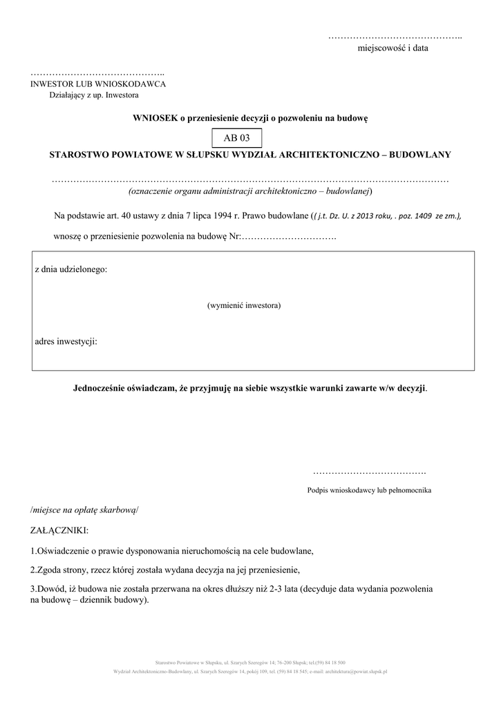 …………………………………….. miejscowość i data …………………………………….. INWESTOR LUB WNIOSKODAWCA Działający z up. Inwestora WNIOSEK o przeniesienie decyzji o pozwoleniu na budowę AB 03 STAROSTWO POWIATOWE W SŁUPSKU WYDZIAŁ ARCHITEKTONICZNO – BUDOWLANY ………………………………………………………………………………………………………………… (oznaczenie organu administracji architektoniczno – budowlanej) Na podstawie art. 40 ustawy z dnia 7 lipca 1994 r. Prawo budowlane (( j.t. Dz. U. z 2013 roku, . poz. 1409 ze zm.), wnoszę o przeniesienie pozwolenia na budowę Nr:…………………………. z dnia udzielonego: (wymienić inwestora) adres inwestycji: Jednocześnie oświadczam, że przyjmuję na siebie wszystkie warunki zawarte w/w decyzji. ………………………………. Podpis wnioskodawcy lub pełnomocnika /miejsce na opłatę skarbową/ ZAŁĄCZNIKI: 1.Oświadczenie o prawie dysponowania nieruchomością na cele budowlane, 2.Zgoda strony, rzecz której została wydana decyzja na jej przeniesienie, 3.Dowód, iż budowa nie została przerwana na okres dłuższy niż 2-3 lata (decyduje data wydania pozwolenia na budowę – dziennik budowy). Starostwo Powiatowe w Słupsku, ul. Szarych Szeregów 14; 76-200 Słupsk; tel.(59) 84 18 500 Wydział Architektoniczno-Budowlany, ul. Szarych Szeregów 14, pokój 109, tel. (59) 84 18 545; e-mail: [email protected]