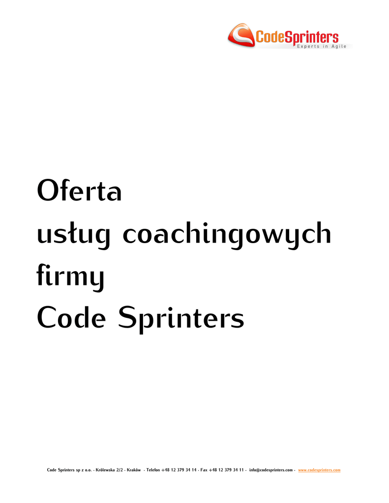 Oferta usług coachingowych firmy Code Sprinters Code Sprinters sp z o.o. ⋅ Królewska 2/2 ⋅ Kraków ⋅ Telefon +48 12 379 34 14 ⋅ Fax +48 12 379 34 11 ⋅ [email protected] ⋅ www.codesprinters.com Zakres i sposób dostarczania usług Usługi coachingowe Usługi coachingowe to wszechstronne wsparcie zespołów w zakresie wdrażania i udoskonalania metod zwinnych (Agile) oraz związanych z nimi praktyk developerskich i jakościowych przez doświadczonego praktyka-konsultanta. Pracuje on na miejscu, w ścisłej interakcji z zespołem/zespołami, a także innymi pracownikami w całej organizacji - wspierając osoby pełniące role kluczowe w wybranych metodach (np. Scrum Masterzy). Coaching polega na budowaniu relacji z zespołami oraz innymi pracownikami organizacji i długofalowym oddziaływaniu na nich, przy jednoczesnym zachowaniu niezależności spojrzenia konsultanta. Podczas swojej obecności konsultant (coach) będzie służył swoją wiedzą i doświadczeniem wspierając zespoły między innymi poprzez: Ewaluację procesu oraz poprawności wdrożenia konkretnych metodyk i praktyk, a także bieżącą pomoc w rozwiązywaniu napotkanych problemów. Wskazywanie nowych, dotąd nie stosowanych w organizacji praktyk i metod, motywowanie zespołów do dalszego samodoskonalenia. Wsparcie osób pełniących kluczowe role w zespołach (np. Scrum Master, Product Owner itp.). Demonstrowanie sposobu prowadzenia pracy przy wykorzystaniu wdrażanych metod i praktyk, w tym także przez przejmowanie kluczowej roli we wskazanym zespole oraz moderowanie istotnych spotkań (retrospekcji, przeglądów, planowań itp.). Oferta usług coachingowych Prowadzenie ad hoc warsztatów i demonstracji praktyk technicznych takich jak TDD, BDD itp. Dostarczanie kierownictwu informacji i ocen dotyczących zespołów i ich sposobu pracy. Powyższy zakres nie jest oczywiście wyczerpujący. Coach podczas swojej obecności w firmie służy zespołom z którymi pracuje, całą swoją wiedzą i doświadczeniem. Dodatkową przewagą coacha z Code Sprinters jest to, że ma on wsparcie naszego zespołu złożonego z doświadczonych praktyków i trenerów. Może zatem przedyskutować specjalistyczne napotkane szkolenia sytuacje czy z warsztaty innymi oferowane lub na zarekomendować preferencyjnych warunkach, a także zaprosić innych coachów i trenerów do współpracy. Dzięki okresowym spotkaniom warsztatowym nasz zespół stale wymienia się doświadczeniami z pracy nad wdrażaniem metod i praktyk zwinnych oraz rozwiązywaniem problemów klientów. Model 3-na-5 W naszej współpracy z klientami wykorzystujemy najczęściej model „3-na-5”, w którym coach jest obecny średnio przez trzy dni na pięć dni roboczych w tygodniu. Dni szkoleniowe coach ustala samodzielnie z zespołem lub wskazaną osobą odpowiedzialną. Model taki ma wiele zalet dla organizacji, z którą pracuje nasz coach: dzięki temu, że coach nie jest zawsze obecny z zespołami mają one czas na to, by samodzielnie korzystać z przekazanej wiedzy i metod, obecność coacha i organizowane przez niego zajęcia nie dezorganizują bieżącej pracy, coachowi jest łatwiej zachować cenne w jego roli zewnętrzne spojrzenia na organizację, z którą pracuje. Oferta usług coachingowych Inne usługi i rozwiązania Code Sprinters Poniżej przedstawiamy podstawowe informacje o innych naszych usługach i produktach, które mogą Państwa zainteresować. Szeroka gama szkoleń i warsztatów Stale poszerzamy naszą ofertę szkoleń i warsztatów dla programistów, testerów, menedżerów i osób odpowiedzialnych za kreowanie produktu. Najważniejsze nowości w naszej ofercie to: Budowanie wizji produktu – szkolenie dla product managerów i product ownerów (w zespołach Scrum), poświęcone ćwiczeniu umiejętności efektywnego rozwijania wizji produktów oraz ich skutecznego przekazywania innym. Wprowadzenie do usability – szkolenie dla osób, które chcą projektować wygodne i estetyczne interfejsy użytkownika. Warsztaty z Automatyzacji testów – wprowadzenie od podstaw do zaawansowanych metod automatyzacji testów, praktyczne wzorce i sposoby radzenia sobie z dużym skomplikowaniem testowanych systemów. Warsztaty Test-Driven Development – wprowadzenie do efektywnych metod projektowania, testowania i tworzenia kodu wysokiej jakości. Zapraszamy do zapoznania się z pełną ofertą pod http://www.agileszkolenia.pl/. Oferta usług coachingowych Banana Scrum Nowoczesne narzędzie wspomagające zespoły pracujące zgodnie z metodyką Scrum. Banana Scrum umożliwia m.in.: Prowadzenie backlogu projektu. Planowanie wydań (release planning). Śledzenie przebiegu sprintów (sprint backlog, różne wykresy od klasycznego burndown po wykresy workload itp.). Użytkownicy korzystają z Banana Scrum poprzez przeglądarki internetowe (wspieramy wszystkie główne przeglądarki), dzięki funkcji Live Sync widząc nawzajem swoje akcje, co jest szczególnie pomocne dla zespołów rozproszonych. Banana Scrum dostępny jest http://www.bananascrum.com/ lub jako aplikacja jako hostowana oprogramowanie do pod adresem instalacji na własnym serwerze w wersji Banana Scrum Pro. Korzystanie z wersji hostowanej można rozpocząć w ciągu kilku minut po dokonaniu rejestracji na stronie, gdzie dostępne są do wyboru plany abonamentowe. W przypadku zainteresowania wersją Banana Scrum Pro prosimy o kontakt. Oprogramowanie biznesowe na zamówienie Tworzymy oprogramowanie biznesowe na zamówienie, indywidualnie dostosowane do potrzeb naszych klientów. Specjalizujemy się w systemach webowych tworzonych w wiodących językach obiektowych – Python, Ruby on Rails i PHP5. Dzięki naszemu doświadczeniu w biznesie oraz stosowaniu metod agile oferujemy niezrównaną szybkość tworzenia aplikacji oraz jakość tworzonego kodu. Oferujemy różne formy współpracy, od pojedynczych sprintów po kompletne projekty pod klucz. Więcej informacji można uzyskać kontaktując s