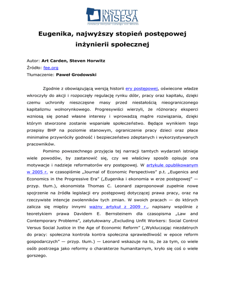 Eugenika, najwyższy stopień postępowej inżynierii społecznej Autor: Art Carden, Steven Horwitz Źródło: fee.org Tłumaczenie: Paweł Grodowski Zgodnie z obowiązującą wersją historii ery postępowej, oświecone władze wkroczyły do akcji i rozpoczęły regulację rynku dóbr, pracy oraz kapitału, dzięki czemu uchroniły nieszczęsne masy przed niestałością nieograniczonego kapitalizmu wolnorynkowego. Progresywiści wierzyli, że różnoracy eksperci wzniosą się ponad własne interesy i wprowadzą mądre rozwiązania, dzięki którym stworzone zostanie wspaniałe społeczeństwo. Będące wynikiem tego przepisy BHP na poziomie stanowym, ograniczenie pracy dzieci oraz płace minimalne przywróciły godność i bezpieczeństwo zdeptanych i wykorzystywanych pracowników. Pomimo powszechnego przyjęcia tej narracji tamtych wydarzeń istnieje wiele powodów, by zastanowić się, czy we właściwy sposób opisuje ona motywacje i nadzieje reformatorów ery postępowej. W artykule opublikowanym w 2005 r. w czasopiśmie „Journal of Economic Perspectives” p.t. „Eugenics and Economics in the Progressive Era” („Eugenika i ekonomia w erze postępowej” — przyp. tłum.), ekonomista Thomas C. Leonard zaproponował zupełnie nowe spojrzenie na źródła legislacji ery postępowej dotyczącej prawa pracy, oraz na rzeczywiste intencje zwolenników tych zmian. W swoich pracach — do których zalicza się między innymi ważny artykuł z 2009 r., napisany wspólnie z teoretykiem prawa Davidem E. Bernsteinem dla czasopisma „Law and Contemporary Problems”, zatytułowany „Excluding Unfit Workers: Social Control Versus Social Justice in the Age of Economic Reform” („Wykluczając niezdatnych do pracy: społeczna kontrola kontra społeczna sprawiedliwość w epoce reform gospodarczych” — przyp. tłum.) — Leonard wskazuje na to, że za tym, co wiele osób postrzega jako reformy o charakterze humanitarnym, kryło się coś o wiele gorszego. Bernstein i Leonard twierdzą, że niektórzy z najbardziej prominentnych wśród postępowych reformatorów byli „stronnikami ludzkiej nierówności”. Popierali oni interwencje w gospodarkę jako sposób na osiągnięcie swojego eugenicznego celu, czyli czystszej (białej) rasy ludzkiej, poprzez zlikwidowanie możliwości otrzymania poważnej pracy przez osoby „nieodpowiednie”. „Nieodpowiednimi” były nie tylko osoby o innym niż biały kolorze skóry (zwłaszcza Afroamerykanie), lecz także „obłąkani”, imigranci (zwłaszcza z Europy Środkowej i Wschodniej) oraz, w nieco innym sensie, także kobiety. Innymi słowy to, co dziś uważamy za niepożądane konsekwencje legislacji popieranej przez współczesnych, mających dobre intencje, choć niekompetentnych pod względem ekonomicznym postępowców, było w rzeczywistości pożądane przed stu laty przez niektórych z ich ideowych przodków. Pierwsi ekonomiści progresywizmu znali skutki państwowych interwencji, lecz uważali je za mile widziane. Ekonomiści ery postępu, żyjący pod koniec XIX i na początku XX w., uważali nauki społeczeństwa, społeczne lecz nie także za tylko środek za sposób badania pozwalający nim i zrozumienia zarządzać, oraz kontrolować je. Pod koniec XIX w. pojawienie się darwinizmu oraz jego akceptacja, połączone z coraz większą wiarą w to, że moc nauki oraz naukowego zarządzania może rozwiązać problemy społeczne, doprowadziło do fascynacji eugeniką, oraz możliwością wykorzystania polityki państwowej do zapewnienia „przetrwania najsilniejszych”, a także czystości oraz siły rasy ludzkiej. Dla wielu myślicieli przełomu XIX i XX wieku teoria Darwina stała się uzasadnieniem dla wykorzystania siły państwa w celu wyeliminowania osób „niepożądanych” i „nieodpowiednich” w podobny sposób, jak zrozumienie zasad ewolucji zmieniało rolnictwo i hodowlę zwierząt. Kluby i towarzystwa eugeniczne powstawały w zastraszającym tempie, a wielu wiodących intelektualistów początku XX wieku, w tym niektórzy z dobrze znanych ekonomistów (takich jak John Maynard Keynes oraz Irving Fisher, prawdopodobnie nasłynniejszy w tym czasie amerykański ekonomista), brało udział w ich działaniach i postrzegało swoją pracę przez pryzmat eugeniki. Eugenika i jej zamierzone konsekwencje Słusznie eugeniczny. czujemy Jednak te grozę same spoglądając idee, które dziś w przeszłość doprowadziły do na ruch stosowania przymusowej sterylizacji, stanowiły także źródło ograniczeń w miejscu pracy. Rynek pracy był bowiem miejscem, w którym zajmujący się eugeniką ekonomiści mogli połączyć obydwa swoje zainteresowania. Już na początku zauważyli oni, że prawo, które wykluczało osoby „nieodpowiednie” z rynku pracy pozwoliłoby na osiągnięcie ich eugenicznych celów. Większość z tego typu przepisów została w tym okresie wprowadzona na poziomie stanowym, lecz w epoce New Dealu to samo rozumowanie często stosowano na poziomie federalnym. Niech za przykład posłuży kwestia płacy minimalnej. Współcześnie wydaje się nam, że ludzie ją popierają, gdyż uważają, iż płaca minimalna to darmowy sposób na pomoc biednym. Klasyczni liberałowie od dawna krytykowali tego typu regulacje niezamierzonych twierdząc, konsekwencji, że oraz są one idealnym dysonansu przykładem między prawa zamierzeniami a skutkami. Na konkurencyjnym rynku pracy każdy pracownik, który potrafi wypracować pewną wartość, może zostać zatrudniony w zamian za wynagrodzenie o wysokości nieprzekraczającej tej wartości. Nawet pracownicy o ograniczonych umiejętnościach mogą zostać zatrudnieni. Płaca minimalna i inne ustawowe korzyści tworzą kryterium minimalnej produktywności, przy której dana osoba może otrzymać pracę, przez co zamyka się rynek dla tych, których produktywność jest zbyt niska, by uzasadniała poniesione koszty. Badania Leonarda wykazują, że niektórzy ze zwolennikó
