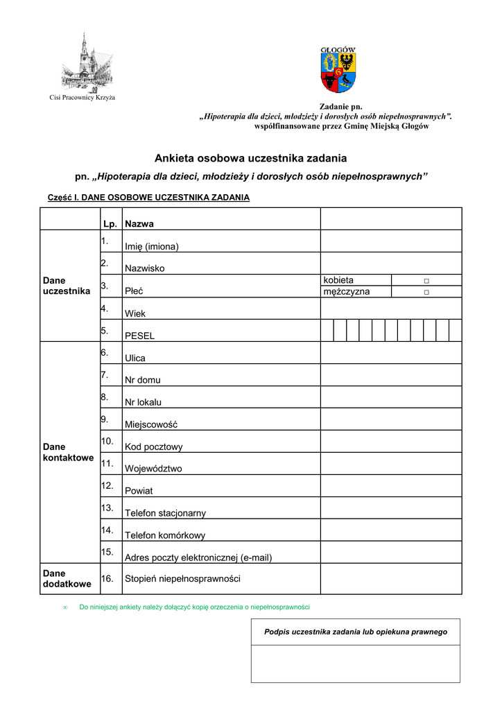 Cisi Pracownicy Krzyża Zadanie pn. „Hipoterapia dla dzieci, młodzieży i dorosłych osób niepełnosprawnych”. współfinansowane przez Gminę Miejską Głogów Ankieta osobowa uczestnika zadania pn. „Hipoterapia dla dzieci, młodzieży i dorosłych osób niepełnosprawnych” Część I. DANE OSOBOWE UCZESTNIKA ZADANIA Lp. Nazwa 1. 2. Dane uczestnika 3. 4. 5. 6. 7. 8. 9. Dane kontaktowe 10. 11. 12. 13. 14. 15. Dane 16. dodatkowe • Imię (imiona) Nazwisko kobieta mężczyzna Płeć □ □ Wiek PESEL Ulica Nr domu Nr lokalu Miejscowość Kod pocztowy Województwo Powiat Telefon stacjonarny Telefon komórkowy Adres poczty elektronicznej (e-mail) Stopień niepełnosprawności Do niniejszej ankiety należy dołączyć kopię orzeczenia o niepełnosprawności Podpis uczestnika zadania lub opiekuna prawnego Cisi Pracownicy Krzyża Zadanie pn. „Hipoterapia dla dzieci, młodzieży i dorosłych osób niepełnosprawnych”. współfinansowane przez Gminę Miejską Głogów Część II. PRZETWARZANIE DANYCH OSOBOWYCH Administratorem danych osobowych zadania pn. „Hipoterapia dla dzieci, młodzieży i dorosłych osób niepełnosprawnych” są Cisi Pracownicy Krzyża, ul. bł. Luigiego Novarese 2, 67-200 Głogów. Ww. dane osobowe zbierane są w celu realizacji zadania pn. „Hipoterapia dla dzieci, młodzieży i dorosłych osób niepełnosprawnych”. Osobie, której dane dotyczą, przysługuje prawo dostępu do treści tych danych i ich poprawiania. Podanie danych jest dobrowolne, aczkolwiek odmowa ich podania jest równoznaczna z brakiem możliwości udzielenia wsparcia w ramach Projektu. Podpis uczestnika zadania lub opiekuna prawnego Część III. ZGODA NA WYKORZYSTANIE WIZERUNKU Udzielam / nie udzielam Cichym Pracownikom Krzyża nieodwołalnego i nieodpłatnego prawa wielokrotnego wykorzystywania zdjęć z moim wizerunkiem, jako uczestnika w realizacji projektu „Hipoterapia dla dzieci, młodzieży i dorosłych osób niepełnosprawnych” każdorazowego ich zatwierdzania. Zgoda obejmuje wykorzystanie, bez konieczności utrwalanie, obróbkę i powielanie wykonanych zdjęć za pośrednictwem dowolnego medium, wyłącznie w celu informacji i promocji dot. zadania „Hipoterapia dla dzieci, młodzieży i dorosłych osób niepełnosprawnych”. Podanie danych jest dobrowolne, aczkolwiek odmowa ich podania jest równoznaczna z brakiem możliwości udzielenia wsparcia w ramach Projektu. Podpis uczestnika zadania lub opiekuna prawnego