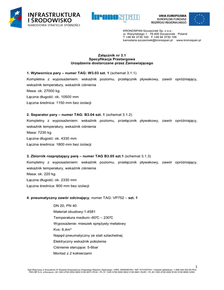 KRONOSPAN Szczecinek Sp. z o.o.· ul. Waryńskiego 1 · 78-400 Szczecinek · Poland T +48 94 3730 100 · F +48 94 3730 109 [email protected] · www.kronospan.pl Załącznik nr 3.1 Specyfikacja Przetargowa Urządzenia dostarczane przez Zamawiającego 1. Wytwornica pary – numer TAG: W3.03 szt. 1 (schemat 3.1.1) Kompletna z wyposażeniem: wskaźnik poziomu, przełącznik pływakowy, zawór opróżniający, wskaźnik temperatury, wskaźnik ciśnienia Masa: ok. 27000 kg Łączna długość: ok. 10500 mm Łączna średnica: 1150 mm bez izolacji 2. Separator pary – numer TAG: B3.04 szt. 1 (schemat 3.1.2) Kompletny z wyposażeniem: wskaźnik poziomu, przełącznik pływakowy, zawór opróżniający, wskaźnik temperatury, wskaźnik ciśnienia Masa: 7230 kg Łączna długość: ok. 4330 mm Łączna średnica: 1800 mm bez izolacji 3. Zbiornik rozprężający parę – numer TAG B3.05 szt.1 (schemat 3.1.3) Kompletny z wyposażeniem: wskaźnik poziomu, przełącznik pływakowy, zawór opróżniający, wskaźnik temperatury, wskaźnik ciśnienia Masa: ok. 220 kg Łączna długość: ok. 2330 mm Łączna średnica: 800 mm bez izolacji 4. pneumatyczny zawór odcinający, numer TAG: VP752 – szt. 1 DN 20, PN 40 Materiał obudowy:1.4581 Temperatura medium:-60°C – 230°C Wyposażenie: mieszek sprężysty metalowy Kvs: 6,4m³ Napęd pneumatyczny ze stali szlachetnej Elektryczny wskaźnik położenia Ciśnienie sterujące: 5-6bar Montaż z 2 kołnierzami 1 Sąd Rejonowy w Koszalinie IX Wydział Gospodarczy Krajowego Rejestru Sądowego • KRS: 0000006799 • NIP: 6731657551 • Kapitał zakładowy: 1.068.346.300,00 PLN PKO BP S.A. o/Szczecin: 46 1020 4795 0000 9802 0106 9673 /PLN/ • PL 51 1020 4795 0000 9602 0106 9681 /EUR/ • PL 69 1020 4795 0000 9102 0106 9699 /USD/ KRONOSPAN Szczecinek Sp. z o.o.· ul. Waryńskiego 1 · 78-400 Szczecinek · Poland T +48 94 3730 100 · F +48 94 3730 109 [email protected] · www.kronospan.pl 5. pneumatyczna zasuwa identyfikacyjny: KP751 - szt. 2 DN 250, PN 40 Montaż z 2 kołnierzami 6. ręczne zasuwy odcinające - szt. 2 DN 300, PN 16 Montaż z przyspawanymi końcami Montaż ze spoinami 2 Sąd Rejonowy w Koszalinie IX Wydział Gospodarczy Krajowego Rejestru Sądowego • KRS: 0000006799 • NIP: 6731657551 • Kapitał zakładowy: 1.068.346.300,00 PLN PKO BP S.A. o/Szczecin: 46 1020 4795 0000 9802 0106 9673 /PLN/ • PL 51 1020 4795 0000 9602 0106 9681 /EUR/ • PL 69 1020 4795 0000 9102 0106 9699 /USD/