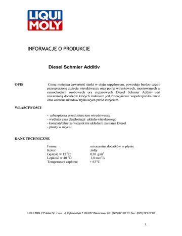INFORMACJE O PRODUKCIE Diesel Schmier Additiv Coraz mniejsza zawartość siarki w oleju napędowym, powoduje bardzo często przyspieszone zużycie wtryskiwaczy oraz pomp wtryskowych, montowanych w samochodach osobowych ora ciężarowych. Diesel Schmier Additiv jest mieszaniną dodatków których zadaniem jest zmniejszenie współczynnika tarcia oraz ochrona układów tryskowych przed zużyciem. OPIS WŁAŚCIWOŚCI - zabezpiecza przed zatarciem wtryskiwaczy - wydłuża czas eksploatacji układu wtryskowego - kompatybilny ze wszystkimi układami zasilania Diesel - prosty w użyciu DANE TECHNICZNE Forma: Kolor: Gęstość w 15 oC: Lepkość w 40 oC: Temperatura zapłonu: mieszanina dodatków w płynie żółty 0,81 g/m3 1,8 mm3/s + 63 oC LIQUI MOLY Polska Sp. z o.o., ul. Cybernetyki 7, 02-677 Warszawa, tel.: (022) 321 07 01, fax.: (022) 321 07 03 1. ZASTOSOWANIE Należy stosować w pojazdach które wymagają paliwa o zwiększonej zawartości siarki. SPOSÓB UŻYCIA: Jedno opakowanie 150 ml wystarcza na 80 litrów paliwa. Proporcja dawkowania 1:533. Dodać do zbiornika z paliwem przed lub po tankowaniu. POJEMNOŚCI OPAKOWANIA Diesel Schmier Additiv 150 ml Art. Nr 5122 Nasze informacje opierają się na starannych badaniach i są jak najbardziej prawidłowe, jednak mogą one jedynie doradzać bez ponoszenia odpowiedzialności. LIQUI MOLY Polska Sp. z o.o., ul. Cybernetyki 7, 02-677 Warszawa, tel.: (022) 321 07 01, fax.: (022) 321 07 03 2.