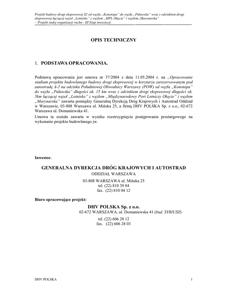 Projekt budowy drogi ekspresowej S2 od węzła „Konotopa” do węzła „Puławska” wraz z odcinkiem drogi ekspresowej łączącej węzeł „Lotnisko” z węzłem „MPL Okęcie” i węzłem„Marynarska” - Projekt stałej organizacji ruchu - III Etap inwestycji OPIS TECHNICZNY 1. PODSTAWA OPRACOWANIA. Podstawą opracowania jest umowa nr 37/2004 z dnia 11.05.2004 r. na „Opracowanie stadium projektu budowlanego budowy drogi ekspresowej w korytarzu zarezerwowanym pod autostradę A-2 na odcinku Południowej Obwodnicy Warszawy (POW) od węzła „Konotopa” do węzła „Puławska” długości ok. 15 km wraz z odcinkiem drogi ekspresowej długości ok. 5km łączącej węzeł „Lotnisko” z węzłem „Międzynarodowy Port Lotniczy Okęcie” i węzłem „Marynarska” zawarta pomiędzy Generalną Dyrekcją Dróg Krajowych i Autostrad Oddział w Warszawie, 03-808 Warszawa ul. Mińska 25, a firmą DHV POLSKA Sp. z o.o., 02-672 Warszawa ul. Domaniewska 41. Umowa ta została zawarta w wyniku rozstrzygnięcia postępowania przetargowego na wykonanie projektu budowlanego jw. Inwestor. GENERALNA DYREKCJA DRÓG KRAJOWYCH I AUTOSTRAD ODDZIAŁ WARSZAWA 03-808 WARSZAWA ul. Mińska 25 tel. (22) 810 39 84 fax. (22) 810 04 12 Biuro opracowujące projekt: DHV POLSKA Sp. z o.o. 02-672 WARSZAWA, ul. Domaniewska 41 (bud. SYRIUSZ) tel. (22) 606 28 12 fax. (22) 606 28 03 DHV POLSKA 1 Projekt budowy drogi ekspresowej S2 od węzła „Konotopa” do węzła „Puławska” wraz z odcinkiem drogi ekspresowej łączącej węzeł „Lotnisko” z węzłem „MPL Okęcie” i węzłem„Marynarska” - Projekt stałej organizacji ruchu - III Etap inwestycji 2. CHARAKTERYSTYKA INWESTYCJI. 2.1 Zakres zamierzenia. Etap III inwestycji, wraz ze zrealizowanym już Etapem I (ul. Wirażowa – ul. Poleczki) i realizowanym Etapem II (Trasa NS (S79) – odcinek od w. „Lotnisko” do w. „Marynarska” wraz z POW – odcinek od w. „Lotnisko” do w. „Puławska”) składają się na całe zamierzenie budowlane polegające na budowie drogi S-2 Konotopa – Puławska wraz z budową łącznika z „MPL Okęcie” i ul. Marynarską (S79) w Warszawie, które jest zlokalizowane w miejscu przecięcia się ważnych ciągów drogowych: autostrady A-2 oraz dwóch dróg ekspresowych S7 i S8. Oprócz tego w Warszawie zbiegają trzy korytarze transportowe międzynarodowej sieci TEN: korytarz I, II i VI. W ramach budowy Etapu III zostaną wykonane: — budowa odcinka drogi ekspresowej S2 (POW) od km 455+550 do km 466+684 o długości 11,134 km — budowa odcinka drogi ekspresowej Salomea-Wolica od km 0-650 do km 0+715 o długości 1,365km — budowa węzła drogowego „KONOTOPA” — budowa węzła drogowego „AL. JEROZOLIMSKIE” — budowa węzła drogowego „OPACZ”, — budowa węzła drogowego „AL. KRAKOWSKA”, — modernizacja odcinka Al. Jerozolimskich /rejon węzła/, — modernizacja odcinka Al. Krakowskiej /rejon węzła/, — budowa zatok autobusowych przy Al. Jerozolimskich, — budowa zatok autobusowych przy Al. Krakowskiej, — budowa dróg obsługujących umożliwiających dojazd do pól i posesji, — budowa drogi łączącej ulice Czystą i Badylarską /rejon węzła „OPACZ”/, — budowa drogi łączącej ulice Słowikowskiego z Rebusową /rejon węzła „OPACZ”/, — budowa drogi łączącej ulice Środkową i Szyszkową /rejon węzła „OPACZ”/, — przebudowa ul. Na Skraju w związku z budową obiektu nad POW, — budowa po nowym śladzie ul. Kinetycznej w związku z budową obiektu nad POW, — odbudowa istniejących dróg zniszczonych przez transport związany z realizacją inwestycji POW — budowa oświetlenia drogowego na całej długości dróg ekspresowych i wybranych dróg lokalnych i dojazdowych, — budowa kanalizacji deszczowej na całej długości dróg ekspresowych i wybranych dróg lokalnych i dojazdowych, — budowa urządzeń bezpieczeństwa ruchu, oznakowanie poziome, pionowe z elementami systemu monitoringu i zarządzania ruchem drogowym, itp. — budowa urządzeń ochrony ekologicznej, ekrany akustyczne, separatory, zbiorniki retencyjne, pasy zieleni ochronnej — przebudowa istniejącej infrastruktury technicznej kolidującej z projektowanymi obiektami Południowej Obwodnicy Warszawy. — budowa obiektów inżynierskich związanych z przebiegiem drogi głównej, łącznic oraz dróg lokalnych i poprzecznych. DHV POLSKA 2 Projekt budowy drogi ekspresowej S2 od węzła „Konotopa” do węzła „Puławska” wraz z odcinkiem drogi ekspresowej łączącej węzeł „Lotnisko” z węzłem „MPL Okęcie” i węzłem„Marynarska” - Projekt stałej organizacji ruchu - III Etap inwestycji 2.2 Lokalizacja inwestycji i charakterystyka stanu istniejącego Projektowana droga ekspresowa S2 POW została zlokalizowana w pasie terenu przeznaczonym pod przebieg autostrady od ok. 30 lat w dawnych Miejscowych Planach Zagospodarowania Przestrzennego. Poza krótkimi odcinkami przejść przez zwartą zabudowę podmiejską w Ursusie przy ul. Regulskiej, w Michałowicach-Osiedlu przy al. Jerozolimskich, w Opaczy-Kolonii przy ulicach Zachodniej i Klonowej (Billerówka) i w Załuskach przy al. Krakowskiej projektowana droga będzie biegnąć przez obszary o zagospodarowaniu rolniczym. Przy istniejących drogach nr 719 (al. Jerozolimskie) i nr 7/8 (al. Krakowska) zlokalizowana jest liczna zabudowa o charakterze mieszkaniowo-usługowym. Występuje również rozproszona zabudowa osiedlowa i zagrodowa. 2.2.1. Istniejąca zabudowa Skupiska zwartej zabudowy o charakterze mieszkaniowym przeznaczonej do wyburzeń występują głównie w rejonie skrzyżowań z ul. Piastowską, Regulską, Bodycha, Zachodnią, Klonową, Środkową, Targową, Na Skraju, Kinetyczną oraz w rejonie osiedla „Załuski” zlokalizowanego po zachodniej stronie Al. Krakowskiej pomiędzy ulicami Emaliową i Sworzniową. Obiekty przeznaczone do wyburzeń o charakterze handlowo usługowym znajdują się w rejonie 