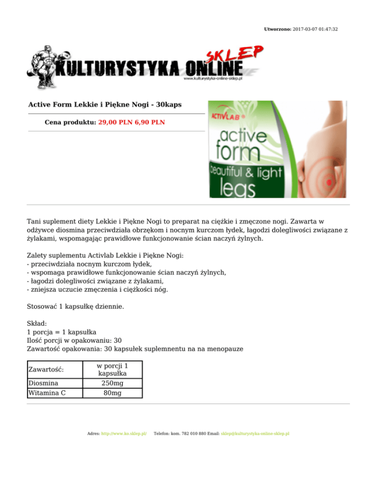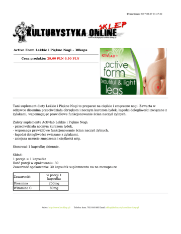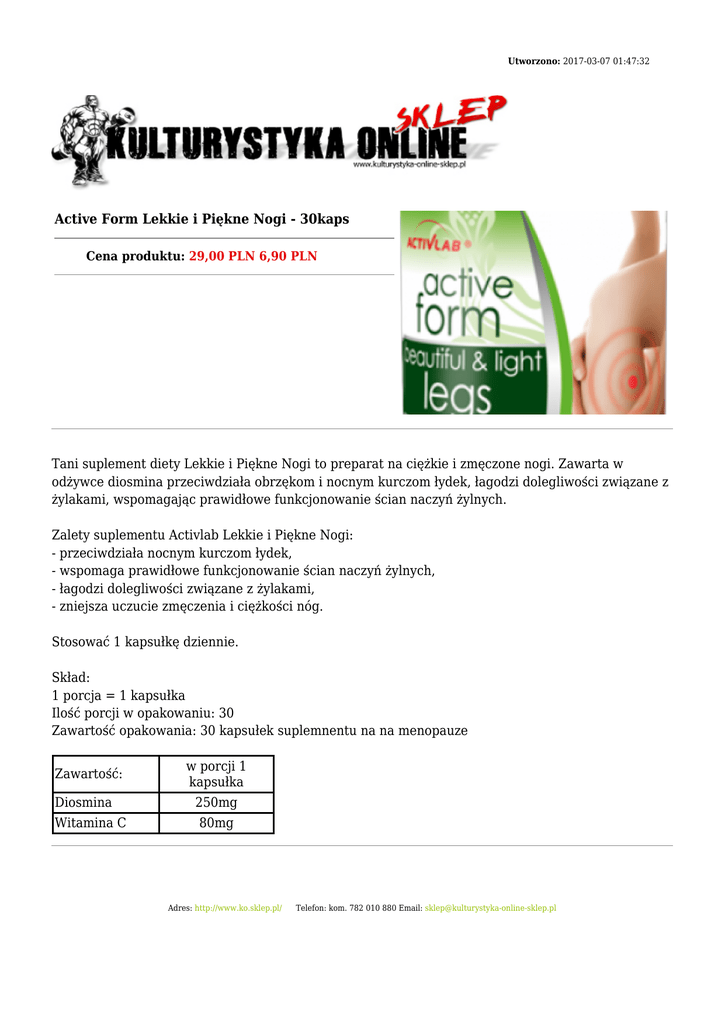 Utworzono: 2017-03-07 01:47:32 Active Form Lekkie i Piękne Nogi - 30kaps Cena produktu: 29,00 PLN 6,90 PLN Tani suplement diety Lekkie i Piękne Nogi to preparat na ciężkie i zmęczone nogi. Zawarta w odżywce diosmina przeciwdziała obrzękom i nocnym kurczom łydek, łagodzi dolegliwości związane z żylakami, wspomagając prawidłowe funkcjonowanie ścian naczyń żylnych. Zalety suplementu Activlab Lekkie i Piękne Nogi: - przeciwdziała nocnym kurczom łydek, - wspomaga prawidłowe funkcjonowanie ścian naczyń żylnych, - łagodzi dolegliwości związane z żylakami, - zniejsza uczucie zmęczenia i ciężkości nóg. Stosować 1 kapsułkę dziennie. Skład: 1 porcja = 1 kapsułka Ilość porcji w opakowaniu: 30 Zawartość opakowania: 30 kapsułek suplemnentu na na menopauze Zawartość: w porcji 1 kapsułka Diosmina 250mg Witamina C 80mg Adres: http://www.ko.sklep.pl/ Telefon: kom. 782 010 880 Email: [email protected]