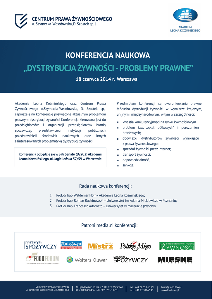 KONFERENCJA NAUKOWA „DYSTRYBUCJA ŻYWNOŚCI - PROBLEMY PRAWNE” 18 czerwca 2014 r. Warszawa Akademia Leona Koźmińskiego oraz Centrum Prawa Żywnościowego A.Szymecka-Wesołowska, D. Szostek sp.j. zapraszają na konferencję poświęconą aktualnym problemom prawnym dystrybucji żywności. Konferencja kierowana jest do przedsiębiorców i organizacji przedsiębiorców branży spożywczej, przedstawicieli instytucji publicznych, przedstawicieli środowisk naukowych oraz innych zainteresowanych problematyką dystrybucji żywności. Konferencja odbędzie się w Sali Senatu (D/202) Akademii Leona Koźmińskiego, ul. Jagiellońska 57/59 w Warszawie. Przedmiotem konferencji są uwarunkowania prawne łańcucha dystrybucji żywności w wymiarze krajowym, unijnym i międzynarodowym, w tym w szczególności: kwestia konkurencyjności na rynku żywnościowym problem tzw. „opłat półkowych” i porozumień branżowych; obowiązki dystrybutorów żywności wynikające z prawa żywnościowego; sprzedaż żywności przez Internet; transport żywności; odpowiedzialność, sankcje. Rada naukowa konferencji: 1. 2. 3. Prof. dr hab. Waldemar Hoff – Akademia Leona Koźmińskiego; Prof. dr hab. Roman Budzinowski – Uniwersytet im. Adama Mickiewicza w Poznaniu; Prof. dr hab. Francesco Adornato – Uniwersytet w Maceracie (Włochy). Patroni medialni konferencji: Centrum Prawa Żywnościowego A. Szymecka-Wesołowska, D. Szostek sp. j. Al. Ujazdowskie 16 lok. 22, 00-478 Warszawa KRS: 0000436456 NIP: 951-263-11-31 tel.: +48 22 398 60 79 fax.: +48 22 39860 43 [email protected] www.food-law.pl PROGRAM KONFERENCJI „DYSTRYBUCJA ŻYWNOŚCI - PROBLEMY PRAWNE” 18 czerwca 2014 r. Warszawa SESJA I 09:30 Rejestracja uczestników. 10:00 Przywitanie. PROWADZĄCY: Prof. dr hab. Waldemar Hoff Akademia Leona Koźmińskiego 10:15 Ingerencja państwa w obrót żywnością - historia i codzienność. Dariusz Łomowski Urząd Ochrony Konkurencji i Konsumentów 10:45 Opłaty półkowe - swoboda kontraktowania, czy nieuczciwa konkurencja. Prof. dr hab. Krystyna Szczepanowska - Kozłowska Uniwersytet Warszawski, DLA Piper Wiater sp. k. 11:15 Kontekst prawny i handlowy wsparcia sprzedaży na wielkiej powierzchni. Dr Maria Andrzej Faliński Polska Organizacja Handlu i Dystrybucji 11:45 Porozumienia dystrybucyjne w sektorze żywnościowym. Dr Aleksander Maziarz Akademia Leona Koźmińskiego 12:15 15 minutowa przerwa kawowa. SESJA II 12:30 Uwarunkowania prawa żywnościowego w zakresie transportu żywności. Dr inż. Maciej Taczanowski Uniwersytet Przyrodniczy w Poznaniu 13:00 Odpowiedzialność dystrybutora za oznakowanie produktów spożywczych. Dr Agnieszka Szymecka - Wesołowska Centrum Prawa Żywnościowego 13:30 Aspekty prawne sprzedaży żywności przez Internet. Daniel Szostek Centrum Prawa Żywnościowego 14:00 Sankcje w prawie żywnościowym. Dr Paweł Wojciechowski Uniwersytet Warszawski 14:30 Darowizny żywności bez VAT! Sposoby i korzyści współpracy z Bankami Żywności. Maria Gosiewska Federacja Polskich Banków Żywności 14:45 Zakończenie konferencji. 15:00 Obiad. ZGŁOSZENIA Udział jest bezpłatny. Ilość miejsc ograniczona. Decyduje kolejność zgłoszeń. W zgłoszeniu proszę podać imię, nazwisko oraz reprezentowaną instytucję. [email protected]
