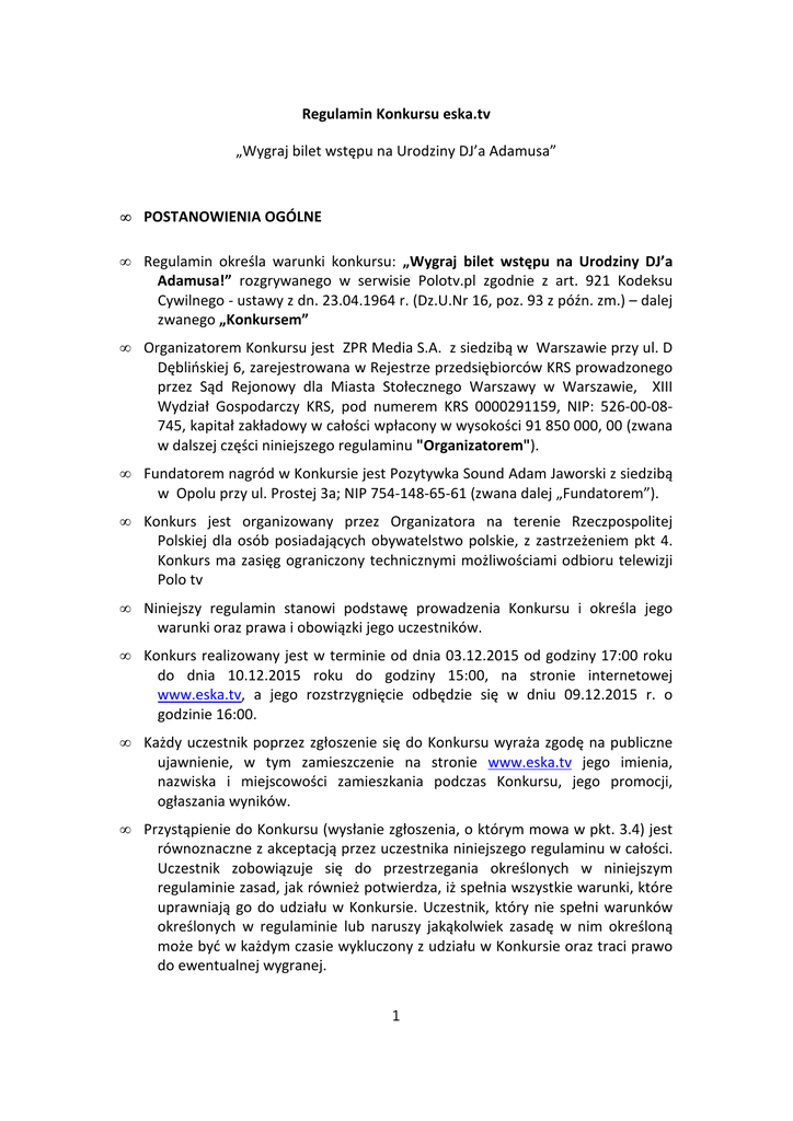 Regulamin Konkursu eska.tv „Wygraj bilet wstępu na Urodziny DJ’a Adamusa” • POSTANOWIENIA OGÓLNE • Regulamin określa warunki konkursu: „Wygraj bilet wstępu na Urodziny DJ’a Adamusa!” rozgrywanego w serwisie Polotv.pl zgodnie z art. 921 Kodeksu Cywilnego - ustawy z dn. 23.04.1964 r. (Dz.U.Nr 16, poz. 93 z późn. zm.) – dalej zwanego „Konkursem” • Organizatorem Konkursu jest ZPR Media S.A. z siedzibą w Warszawie przy ul. D Dęblińskiej 6, zarejestrowana w Rejestrze przedsiębiorców KRS prowadzonego przez Sąd Rejonowy dla Miasta Stołecznego Warszawy w Warszawie, XIII Wydział Gospodarczy KRS, pod numerem KRS 0000291159, NIP: 526-00-08745, kapitał zakładowy w całości wpłacony w wysokości 91 850 000, 00 (zwana w dalszej części niniejszego regulaminu "Organizatorem"). • Fundatorem nagród w Konkursie jest Pozytywka Sound Adam Jaworski z siedzibą w Opolu przy ul. Prostej 3a; NIP 754-148-65-61 (zwana dalej „Fundatorem”). • Konkurs jest organizowany przez Organizatora na terenie Rzeczpospolitej Polskiej dla osób posiadających obywatelstwo polskie, z zastrzeżeniem pkt 4. Konkurs ma zasięg ograniczony technicznymi możliwościami odbioru telewizji Polo tv • Niniejszy regulamin stanowi podstawę prowadzenia Konkursu i określa jego warunki oraz prawa i obowiązki jego uczestników. • Konkurs realizowany jest w terminie od dnia 03.12.2015 od godziny 17:00 roku do dnia 10.12.2015 roku do godziny 15:00, na stronie internetowej www.eska.tv, a jego rozstrzygnięcie odbędzie się w dniu 09.12.2015 r. o godzinie 16:00. • Każdy uczestnik poprzez zgłoszenie się do Konkursu wyraża zgodę na publiczne ujawnienie, w tym zamieszczenie na stronie www.eska.tv jego imienia, nazwiska i miejscowości zamieszkania podczas Konkursu, jego promocji, ogłaszania wyników. • Przystąpienie do Konkursu (wysłanie zgłoszenia, o którym mowa w pkt. 3.4) jest równoznaczne z akceptacją przez uczestnika niniejszego regulaminu w całości. Uczestnik zobowiązuje się do przestrzegania określonych w niniejszym regulaminie zasad, jak również potwierdza, iż spełnia wszystkie warunki, które uprawniają go do udziału w Konkursie. Uczestnik, który nie spełni warunków określonych w regulaminie lub naruszy jakąkolwiek zasadę w nim określoną może być w każdym czasie wykluczony z udziału w Konkursie oraz traci prawo do ewentualnej wygranej. 1 • Adres e-mail Organizatora, pod którym można uzyskać informacje na temat organizacji Konkursu: [email protected] • Nagrody • Zwycięzca Konkursu otrzyma nagrodę o wartości 150 zł brutto, w postaci 5 (pięciu) jednoosobowych wejściówek na imprezę Urodzinową DJ’a Adamusa, która odbędzie się w Klubie Capitol w Warszawie dnia 12.12.2015 roku o godzinie 22:00. Nazwiska Zwycięzców i osób towarzyszących zostaną wpisane na listę Fundatora. Organizator oświadcza, iż wszystkie nagrody zostaną wydane zgodnie z obowiązującymi przepisami prawa podatkowego. • Organizator nie ponosi odpowiedzialności za niemożność odbioru lub nieodebranie którejkolwiek nagrody, z jakiejkolwiek przyczyny leżącej po stronie nagrodzonego uczestnika. • Organizator nie ponosi odpowiedzialności za zmianę miejsca zamieszkania i/lub podanego przez uczestnika Konkursu adresu lub zmianę innych danych – uniemożliwiające kontakt z tym uczestnikiem lub odebranie przez niego zestawu nagród/nagrody. • O szczegółach odbioru i realizacji nagród zwycięzca Konkursu zostanie poinformowany przez Organizatora drogą mailową lub za pośrednictwem rozmowy telefonicznej. • Nagrody nieodebrane przez zwycięzcę Konkursu w terminie 2 dni od rozstrzygnięcia Konkursu pozostają własnością Fundatora. • Przy odbiorze przez zwycięzcę Konkursu nagrody zobowiązany jest on okazać dokument potwierdzający jego tożsamość lub w przypadku odbioru tej nagrody przez pełnomocnika zwycięzcy zobowiązany jest on okazać pisemne upoważnienie od zwycięzcy, który wygrał nagrodę, zawierające następujące informacje: imię nazwisko, adres, numer i seria dowodu osobistego, telefon kontaktowy tego zwycięzcy oraz adnotację o upoważnieniu określonej osoby do odbioru w jego imieniu danej nagrody, jak również podpis tego zwycięzcy wraz z danymi osoby odbierającej czyli imieniem, nazwiskiem, serią i numerem dowodu osobistego oraz telefonem odbiorcy. W przypadku niespełnienia przez osobę podającą się za pełnomocnika zwycięzcy powyższych warunków nagroda nie będzie jej wydany. • Wszystkie nagrody pozostają własnością Fundatora do momentu przekazania ich zwycięzcom Konkursu. • Nagrodę główną ufundowaną przez Fundatora zwycięzcy Konkursu przekaże Organizator . 2 • Zasady uczestnictwa w konkursie • Ogólne zasady Konkursu podawane są na stronie internetowej www.eska.tv, zakładka Konkursy. • W czasie trwania Konkursu odbędzie się jedna edycja Konkursu podczas której wyłonionych zostanie 1 (jeden) Zwycięzca. • Zwycięzcy zostaną ogłoszeni na stronie www.eska.tv • W celu wzięcia udziału w Konkursie należy w dniach od 03.12.2015r. od godziny 17:00 do dnia 10.12.2015r do godziny 15:00 należy odpowiedzieć na zadanie konkursowe zadane na stronie internetowej eska.tv które brzmi: DJ Adamus obchodzi swoje święto! Czego życzysz mu z okazji urodzin? oraz wysłać na adres [email protected] odpowiedź na powyższe pytanie. • Zgłoszenia do Konkursu należy dokonać na adres: [email protected] • Zgłoszenie mailowe powinno zawierać : • Dane zgłoszeniowe: imię, nazwisko, numer telefonu, adres mailowy • odpowiedź na zadanie: DJ Adamus obchodzi swoje święto! Czego życzysz mu z okazji urodzin? • Uczestnik zobowiązany jest posiadać pełnię praw do tekstu przesłanego do Konkursu drogą mailową. • Spośród wszystkich kompletnych zgłoszeń do Konkursu, komisja konkursowa wybierze 1 zgłoszenie uczestnika, który w ocenie Komisji wysłali najbardziej kreaty