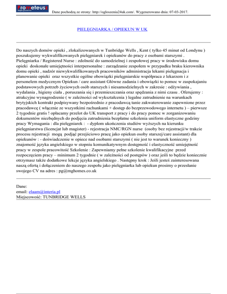 Dane pochodzą ze strony: http://ogloszenia24uk.com/. Wygenerowano dnia: 07-03-2017. PIELĘGNIARKA / OPIEKUN W UK Do naszych domów opieki , zlokalizowanych w Tunbridge Wells , Kent ( tylko 45 minut od Londynu ) poszukujemy wykwalifikowanych pielęgniarek i opiekunów do pracy z osobami starszymi . Pielęgniarka / Registered Nurse : zdolność do samodzielnej i zespołowej pracy w środowisku domu opieki doskonałe umiejętności interpersonalne : zarządzanie zespołem w przypadku braku kierownika domu opieki , nadzór niewykwalifikowanych pracowników administracja lekami pielęgnacja i planowanie opieki oraz wszystkie ogólne obowiązki pielęgniarskie współpraca z lekarzem i z personelem medycznym Opiekun / care assistant Główne zadania i obowiązki to pomoc w zaspokajaniu podstawowych potrzeb życiowych osób starszych i niesamodzielnych w zakresie : odżywiania , wydalania , higieny ciała , poruszania się i przemieszczania oraz spędzania z nimi czasu . Oferujemy : atrakcyjne wynagrodzenie ( w zależności od wykształcenia ) legalne zatrudnienie na warunkach brytyjskich kontrakt podpisywany bezpośrednio z pracodawcą tanie zakwaterowanie zapewnione przez pracodawcę ( włącznie ze wszystkimi rachunkami + dostęp do bezprzewodowego internetu ) – pierwsze 2 tygodnie gratis ! opłacamy przelot do UK transport z pracy i do pracy pomoc w zorganizowaniu dokumentów niezbędnych do podjęcia zatrudnienia bezpłatne szkolenia uniform elastyczne godziny pracy Wymagania : dla pielęgniarek : - dyplom ukończenia studiów wyższych na kierunku pielęgniarstwa (licencjat lub magister) - rejestracja NMC/RGN nurse (osoby bez rejestracji/w trakcie procesu rejestracji mogą podjąć przejściowo pracę jako opiekun osoby starszej/care assistant) dla opiekunów : - doświadczenie w opiece nad osobami starszymi ( nie jest to warunek konieczny ) znajomość języka angielskiego w stopniu komunikatywnym dostępność i elastyczność umiejętność pracy w zespole pracowitość Szkolenie : Zapewniamy pełne szkolenie kwalifikacyjne przed rozpoczęciem pracy – minimum 2 tygodnie ( w zależności od postępów ) oraz jeśli to będzie koniecznie otrzymasz także dodatkowe lekcje języka angielskiego . Następny krok : Jeśli jesteś zainteresowana naszą ofertą i dołączeniem do naszego zespołu jako pielęgniarka lub opiekun prosimy o przesłanie swojego CV na adres : [email protected] Dane: email: [email protected] Miejscowość: TUNBRIDGE WELLS