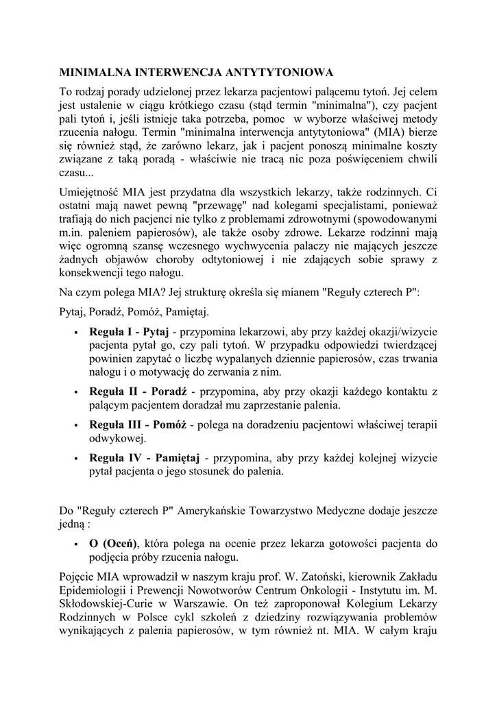 MINIMALNA INTERWENCJA ANTYTYTONIOWA To rodzaj porady udzielonej przez lekarza pacjentowi palącemu tytoń. Jej celem jest ustalenie w ciągu krótkiego czasu (stąd termin "minimalna"), czy pacjent pali tytoń i, jeśli istnieje taka potrzeba, pomoc w wyborze właściwej metody rzucenia nałogu. Termin "minimalna interwencja antytytoniowa" (MIA) bierze się również stąd, że zarówno lekarz, jak i pacjent ponoszą minimalne koszty związane z taką poradą - właściwie nie tracą nic poza poświęceniem chwili czasu... Umiejętność MIA jest przydatna dla wszystkich lekarzy, także rodzinnych. Ci ostatni mają nawet pewną "przewagę" nad kolegami specjalistami, ponieważ trafiają do nich pacjenci nie tylko z problemami zdrowotnymi (spowodowanymi m.in. paleniem papierosów), ale także osoby zdrowe. Lekarze rodzinni mają więc ogromną szansę wczesnego wychwycenia palaczy nie mających jeszcze żadnych objawów choroby odtytoniowej i nie zdających sobie sprawy z konsekwencji tego nałogu. Na czym polega MIA? Jej strukturę określa się mianem "Reguły czterech P": Pytaj, Poradź, Pomóż, Pamiętaj. Reguła I - Pytaj - przypomina lekarzowi, aby przy każdej okazji/wizycie pacjenta pytał go, czy pali tytoń. W przypadku odpowiedzi twierdzącej powinien zapytać o liczbę wypalanych dziennie papierosów, czas trwania nałogu i o motywację do zerwania z nim. Reguła II - Poradź - przypomina, aby przy okazji każdego kontaktu z palącym pacjentem doradzał mu zaprzestanie palenia. Reguła III - Pomóż - polega na doradzeniu pacjentowi właściwej terapii odwykowej. Reguła IV - Pamiętaj - przypomina, aby przy każdej kolejnej wizycie pytał pacjenta o jego stosunek do palenia. Do "Reguły czterech P" Amerykańskie Towarzystwo Medyczne dodaje jeszcze jedną : O (Oceń), która polega na ocenie przez lekarza gotowości pacjenta do podjęcia próby rzucenia nałogu. Pojęcie MIA wprowadził w naszym kraju prof. W. Zatoński, kierownik Zakładu Epidemiologii i Prewencji Nowotworów Centrum Onkologii - Instytutu im. M. Skłodowskiej-Curie w Warszawie. On też zaproponował Kolegium Lekarzy Rodzinnych w Polsce cykl szkoleń z dziedziny rozwiązywania problemów wynikających z palenia papierosów, w tym również nt. MIA. W całym kraju odbyły się już takie szkolenia dla nauczycieli rezydentów medycyny rodzinnej oraz dla samych lekarzy rodzinnych. Wzięło w nich udział ponad 500 osób. Ich celem jest włączenie polskich lekarzy rodzinnych do akcji mającej prowadzić do beznikotynowego stylu życia społeczeństwa polskiego poprzez ograniczenie nałogu palenia papierosów wśród populacji ich pacjentów. Mimo początkowego sceptycyzmu lekarzy rodzinnych, dotyczącego szkoleń z zakresu MIA, ostatnio coraz chętniej uczestniczą oni w kursach z tej dziedziny. Trudno się dziwić. Choroby odtytoniowe kosztują, a ponadto w latach 90. umieralność z powodu chorób tytoniozależnych u mężczyzn w średnim wieku zwiększyła się w Polsce 3-krotnie, a u kobiet 9-krotnie. Palenie papierosów powoduje blisko połowę przedwczesnych zgonów Polaków w wieku średnim. Jaka jest skuteczność MIA? Podobna do skuteczności nikotynowej terapii zastępczej, nieco mniejsza niż stosowanie bupropionu, ale za to aż o 50% wyższa od interwencji behawioralnej i psychologicznej. Zgodnie z regułą I i IV minimalną interwencję antytytoniową trzeba powtarzać, bo informację o tym, że trzeba przestać palić papierosy, pacjent może po prostu... zapomnieć lub zignorować. Wyliczono wszak, że po 10 minutach od konsultacji pacjentowi "ucieka" 50% informacji, przekazanych mu przez lekarza, a po 8 godzinach - aż 95%! I pamiętajmy jeszcze o jednym. Lekarze mogą (i powinni) stosować MIA nie tylko w stosunku do pacjentów, ale także wobec swojej rodziny, przyjaciół i znajomych. Profesjonalnych działań o charakterze promocji zdrowia i profilaktyki nigdy bowiem za wiele! Artykuł pochodzi z tygodnika "Służba Zdrowia" nr 32-35/2001