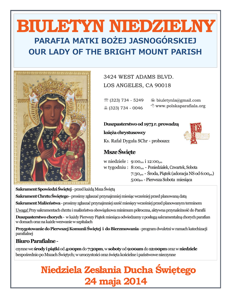 BIULETYN NIEDZIELNY PARAFIA MATKI BOŻEJ JASNOGÓRSKIEJ OUR LADY OF THE BRIGHT MOUNT PARISH 3424 WEST ADAMS BLVD. LOS ANGELES, CA 90018 (323) 734 - 5249 (323) 734 - 0046 [email protected] www.polskaparafiala.org Duszpasterstwo od 1973 r. prowadzą księża chrystusowcy Ks. Rafał Dyguła SChr - proboszcz Msze Święte w niedziele : 9:00am i 12:00pm w tygodniu : 8:00am - Poniedziałek, Czwartek, Sobota 7:30pm - Środa, Piątek (adoracja NS od 6:00pm) 5:00pm - Pierwsza Sobota miesiąca Sakrament Spowiedzi Świętej - przed każdą Msza Świętą Sakrament Chrztu Świętego - prosimy zgłaszać przynajmniej miesiąc wcześniej przed planowaną datą Sakrament Małżeństwa - prosimy zgłaszać przynajmniej sześć miesięcy wcześniej przed planowanym terminem Sakrament Spowiedzi Świętej - przed każdą Msza Świętą. Uwaga! Przy sakramentach chrztu i małżeństwa obowiązkowa minimum półroczna, aktywna przynależność do Parafii Sakrament Chrztu Świętego - prosimy zgłaszać przynajmniej miesiąc wcześniej przed planowaną datą. Duszpasterstwo chorych - w każdy Pierwszy Piątek miesiąca odwiedzamy z posługą sakramentalną chorych parafian Sakrament Małżeństwa prosimy zgłaszać przynajmniej 6 miesięcy wcześniej przed planowanym terminem. w domach oraz na każde wezwanie- w szpitalach Uwaga! do Przy sakramentach Chrztu i Małżeństwa obowiązkowa- program minimumdwuletni półroczna, aktywna Przygotowanie Pierwszej Komunii Świętej i do Bierzmowania w ramach katechizacji parafialnej przynależność do Parafii. Biuro Parafialne- - czynne we środy i piątki od 4:00pm do 7:30pm, w soboty od 9:00am do 12:00pm Biuro Parafialne w niedziele bezpośrednio po Mszach Świętych. czynne we środy i piątkioraz od 4:00pm do 7:30pm, w soboty od 9:00am do 12:00pm oraz w niedziele Uwaga! W uroczystości święta kościelne i państwowe jest nieczynne. bezpośrednio po Mszach Świętych;oraz w uroczystości oraz święta kościelnebiuro i państwowe nieczynne Niedziela Zesłania Ducha Świętego 24 maja 2014 INTENCJE Towarzystwo Chrystusowe dla Polonii Zagranicznej MSZALNE Niedziela Zesłania Ducha Świętego, 24 maja - wypełniając swoją misję w Kościele Powszechnym, włącza się w apostolstwo na rzecz Rodaków przebywających poza granicami Ojczyzny. Duchowośd Towarzystwa Chrystusowego, wypływająca z życia zakonnego i kapłaoskiego, oparta jest na charyzmacie założyciela, Sługi Bożego kard. Augusta Hlonda i posłannictwie Zgromadzenia. Wypływa także z późniejszych tradycji, wypracowanych przez wspólnotę zakonną, zwłaszcza kierowaną przez pierwszego przełożonego generalnego, Sługę Bożego ks. Ignacego Posadzego TChr. Szeroko rozumiana troska o polskich emigrantów nie ogranicza się jedynie do posługi duszpasterskiej. W parafiach polonijnych oprócz duszpasterstwa wielką wagę przywiązuje się do podtrzymania zdrowego ducha patriotycznego, polskiej kultury i życia społecznego Polonii. 9:00am o Boże błog. i opiekę MB dla Danuty i Jerzego Macioł z ok. 30 rocz. ślubu 12:00pm intencja zbiorowa + Irena Ryciak ++ Stanisława i Zygmunt Falkowscy + Franciszek Danek + Danuta Zawadzka + Józef Patrzek + Michał Zawadzki w 16 rocz. śm. ++ Paulina Witkowska i Kazimiera Puchlik ++ Lena Rogal i Teresa Genot + Zofia Wukowicz + Marta Szumaoska w 1 rocz. śm. o Boże błog. i łaskę zdrowia dla Józefa Danek MSZE ŚWIĘTE (patrz strona 1!): o Boże błog. i opiekę MB dla Anny i Aref Bhuiya NABOŻEOSTWA: w Bogu znanej intencji o Boże błog. i opiekę MB Ireny Witkowskiej, Wandy Kumor i Krystyny Zuliani Adoracja Najświętszego Sakramentu - środy i piątki od godz.6:00pm Różaniec Rodziców za Dzieci Poniedziałek, 25 maja, święto NMP Matki Kościoła 10:00am za Parafian (na cmentarzu Holy Cross) Środa, 27 maja 6:00pm adoracja NS 7:30pm + Regina Dąbrowska nabożeostwo majowe Czwartek, 28 maja, święto ku czci Jezusa Chrystusa Najwyższego i Wiecznego Kapłana 8:00am wolna: Piątek, 29 maja, wspomn. św. Urszuli Ledóchowskiej 6:00pm adoracja NS 7:30pm ++ Maria i Mieczysław Spychała, Tekla i Stefan Przebinda, Maria i Stanisław Bierzało, Jadwiga i Wincenty Michalak, Leon Rakowski, ks. Juliusz Boroo nabożeostwo majowe Sobota, 30 maja 8:00am o Boże błog., opiekę MB i łaskę zdrowia dla Jana Karpiela 9:30am różaniec dzieci Towarzystwo Imienia Jezus Niedziela Najświętszej Trójcy, 31 maja Dzieło Duchowej Adopcji Dziecka Poczętego 9:00am intencja zbiorowa Apostolat Margaretka Koło Przyjaciół Radia Maryja + Władysława Karbarz Nowenna do MB Królowej Polski - środy, godz.7:30pm Nabożeostwo Fatimskie - Pierwsze Soboty Miesiąca (w łączności ze Mszą Świętą), godz.5:00pm Godzinki ku czci Niepokalanego Poczęcia NMP - niedziele, godz.8:40am Różaniec i Anioł Paoski - niedziele, godz.11:30pm Nabożeostwo do Bożego Miłosierdzia - piątki, godz.7:30pm Nabożeostwo do Najświętszego Serca Pana Jezusa - Pierwsze Piątki Miesiąca (w łączności ze Mszą Świętą), godz.7:30pm Różaniec dzieci - soboty, godz.9:30am WSPÓLNOTY MODLITEWNE I APOSTOLSKIE: Jasnogórska Rodzina Różaocowa + Jan Strękowski w 8 rocz. śm. Liturgiczna Służba Ołtarza ++ Ludwika i Michał Babiak, Helena Walace, Danuta Zagórska, Czesław Gołębiowski Wspólnota Młodych Ruchu Focolare + Janina Kubicka w 1 rocz. śm. ++ Wacław Chojnowski, Mieczyaława i Antoni Bałazy SŁUŻBA LITURGICZNA DZISIEJSZEJ NIEDZIELI ++ Jola Przybylska i Józef Bieniasz 9:00am – Agnieszka Górecki, Aleksandra Butusov 12:00pm – Anna i Paweł Nogalscy o Boże błog. i łaskę zdrowia dla Łukasza Gołębiowskiego z ok. 3 rocz. ur. o Boże błog. i potrzebne łaski dla Renaty i Marcina w 3 rocz. ślubu Ofiary mszalne z poprzedniej niedzieli: o Boże błog. i opiekę MB dla Anny i Franciszka Rakowski z ok. 66 rocz. ślubu XXXXXXXXXXX o Boże błog. i opiekę MB dla Barbary i Stanisława Dzikowski z ok. rocz. ślubu Pragniemy wraz z Radą Finansową poinformowad, że koszt tygodniow