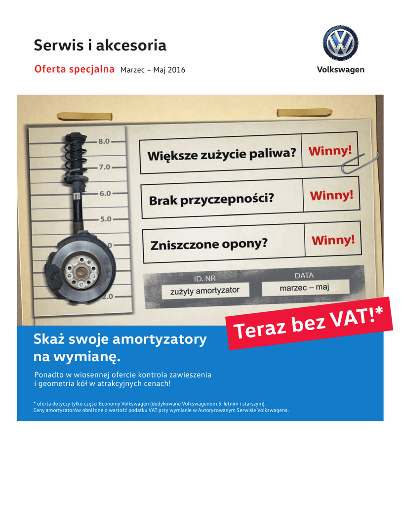 Serwis i akcesoria Oferta specjalna Marzec – Maj 2016 Skaż swoje amortyzatory na wymianę. * ! T A V z e Teraz b Ponadto w wiosennej ofercie kontrola zawieszenia i geometria kół w atrakcyjnych cenach! * oferta dotyczy tylko części Economy Volkswagen (dedykowane Volkswagenom 5-letnim i starszym). Ceny amortyzatorów obniżone o wartość podatku VAT przy wymianie w Autoryzowanym Serwisie Volkswagena. Zadbaj o bezpieczeństwo i komfort podróży Koniecznie zleć kontrolę zawieszenia jeśli Twój Volkswagen przekroczył przebieg 80 000 km i wykazuje jeden z poniższych objawów: niższy komfort jazdy, zwiększone odczucie nierówności nawierzchni, dłuższa droga hamowania, zużycie opon i części podwozia, niska stabilność pojazdu w zakrętach, wyższe zużycie paliwa. Pamiętaj także o właściwie ustawionej geometrii kół, która gwarantuje bezpieczeństwo, pewne prowadzenie i prawidłowe zużycie opon. Nie ryzykuj, gdy koszt nie jest wysoki, a zyskiem jest bezpieczeństwo. Powierz je fachowcom z Autoryzowanego Serwisu Volkswagena. Kontrola zawieszenia i układu kierowniczego Zakres: – sprawdzenie stanu wahaczy, – kontrola tulei wahaczy i stabilizatora, – ocena stanu amortyzatorów, – sprawdzenie luzów w ukł. kierowniczym: drążków, końcówek i przekładni. Geometria kół Nasza cena Nasza cena Skorzystaj z formularza by poznać cenę zł Skorzystaj z formularza by poznać cenę zł XXX XXX Przy zleceniu geometrii kół, kontrola zawieszenia gratis! Jeśli Twój Volkswagen ma 5 lat lub więcej, ta oferta jest dla Ciebie!!! Pakiet ekonomiczny Volkswagen Pakiet ekonomiczny Volkswagen Wymiana amortyzatorów przednich ednich Wymiana amortyzatorów w tylnyc tylnych nych Golf/Golf Plus/Jetta/Passat 2006 – 2012 012 Passat CC/Scirocco 2009 009 – 2012 Tiguan 2012 Passat/Touran 2006 – 2012 Passat CC/Sharan 2011 – 2012 Nasza cena (część + usługa) Nasza cena (część + usługa) Skorzystaj z formularza by poznać cenę zł Skorzystaj z formularza by poznać cenę zł XXX JZW 413 031 A 2 VAT!* Teraz bez XXX JZW 513 025 N VAT!* Teraz bez y p r ze w a k l e i W Oryginalne akcesoria Volkswagen® * Kompletne koła zimowe z felgami ze stopu metali lekkich Do wybranych modeli: up! 14" Felga aluminiowa: Opona: Nasza cena za 1 szt. Aspen 165/70 R14 81T Michelin Alpin 4 1S0 073 514E 8Z8 - prawe, 1S0 073 614E 8Z8 - lewe „Aspen” Passat Alltrack/CC /Scirocco/ 17" daż! Aspen 205/50 R17 93V XL Pirelli W.Sottozero2 599 zł 1 157 zł 1K8 073 247D 8Z8 Passat B8 16" Corvara 215/60 R16 99H XL Pirelli Sottozero3 858 zł 3G0 073 546E 8Z8 - prawe, 3G0 073 646E 8Z8 - lewe Passat B8 Lim./Var. 17" Corvara 215/55 R17 98V XL Continental WinterContact TS850 P 1 399 zł 3G0 073 227 8Z8 Passat B8 Alltrack 17" Stavang 215/55 R17 98V XL Continental WinterContact TS850 P „Corvara” „Corva 1 349 zł 3G8 073 227 8Z8 Golf Hb./Var./Sportsvan 16" Corvara 205/55 R16 91H Pirelli Snowcontrol Serie 3 714 zł 5G0 073 546B 8Z8 - prawe, 5G0 073 646B 8Z8 - lewe Golf GTI/GTD/R 17" Dijon 205/50 R17 93V XL Pirelli Snowcontrol Serie 3 1 119 zł 5G0 073 547A 8Z8 - prawe, 5G0 073 647A 8Z8 - lewe Sharan/Sharan GP 16" Aspen 205/60 R16 96H XL Continental WinterContact TS830 „Dijon” 1 050 zł 7N0 073 226F 8Z8 Tiguan Aspen 215/65 R16 98H Pirelli Sottozero 3 884 zł 7N0 073 546 8Z8 - prawe, 7N0 073 646 8Z8 - lewe Touareg NF 18" Aspen 255/55 R18 109V XL Pirelli Scorpion Winter 1 718 zł 7P0 073 548B 8Z8 - prawe, 7P0 073 648B 8Z8 - lewe Touareg NF 19" „Diorit” Diorit 265/50 R19 110V XL Pirelli Scorpion Winter 2 099 zł 7P0 073 549C 88Z - prawe, 7P0 073 649C 88Z Oryginalne akcesoria Volkswagen® Kompletne koła zimowe z oryginalnymi felgami stalowymi Nasza cena za 1 szt. Do wybranych modeli: Felga/opona: up! 14" Felga stalowa 165/70 R14 81T, Pirelli Snowcontrol Serie 3 Passat B8 16" 1S0 073 544A 03C - prawe, 1S0 073 644A 03C - lewe 348 zł 3Q0 073 566A 03C - prawe, 3Q0 073 666A 03C - lewe 559 zł 3Q0 073 576 03C - prawe, 3Q0 073 676 03C - lewe 535 zł 7N0 073 566A 03C - prawe, 7N0 073 666A 03C - lewe 520 zł Felga stalowa 215/60 R16 99H XL, Blizzak LM-32 Felga stalowa 215/60 R16 99H XL, Semperit Tiguan 16" Felga stalowa 215/65 R16 98H, Bridgestone * dobór kół zimowych według ogólnych zaleceń producenta. Powyższe koła nie są wyposażone w czujniki ciśnienia w oponach. UWAGA: Oferta kół zimowych ważna do wyczerpania zapasów. 3 Nasza cena Nasza cena 499 zł 560 zł 6R0 071 495A 8Z8 1T4 071 496C 8Z8 Nasza cena 590 zł 1T4 071 498 666 Oryginalne akcesoria Volkswagen® Oryginalne akcesoria Volkswagen® Oryginalne akcesoria Volkswagen® Felga aluminiowa Sima Felga aluminiowa Sima Felga aluminiowa Goal Rozmiar 6J x 15, 100/5 ET 40 dla opon w rozmiarze: 185/60R15; 195/55R15. Zastosowanie: Polo A4/A5/A5-GP. Rozmiar 6J x 16 ET50 112/5 dla opon w rozmiarze 205/55 R 16. Do wybranych modeli: VW Golf A6/A7 Hb/Var. Plus, Golf Sportsvan, Touran A5/A6, Jetta A5/A6/A6-GP. Rozmiar 7J x 18 ET51 112/5 dla opon w rozmiarze 225/40 R 18. Do wybranych modeli: VW Golf A5/A6/A7 GT/GTI/Variant/Plus; Jetta A5/A6/A6-GP. Dostępna do wyczerpania zapasów. Oryginalne akcesoria Volkswagen® Zestaw nakrętek na wentyle Oryginalne akcesoria Volkswagen® Oryg Zestaw nakrętek na wentyle z logo VW zwiększają optycznie atrakcyjność i nadają oryginalny akcent. Osłony skutecznie chronią nią wentyle przed kurzem, zanieczyszczeniami oraz wilgoci wilgocią. cią. ą Kom Komple Komplet et 4 sz szt. Przeznaczone Przeznacz zon one do zaworów w gu gumowy gumowych wycc i meta metalowych. etalow lowych ych. Ze Zestaw śrub zzabezpieczających ab b Komplet Kom o om śrub zabezpieczających felgi alu lum m aluminiowe przed kradzieżą, M14 x 1,5 x 27. Kolor: Kol o o czarny. ol Nasza ccena Nasza cena Nas 85 5 zł 125 zł do zawor zzaworów aworó gumowych owych ch im me talowy talo wy metalowych 000 071 2 215 000 071 597 do zaworó zaworów aluminiowych 000 071 2 215A Oryginalne akcesoria Volkswagen® Zestaw pokrowców Wykonany z wys