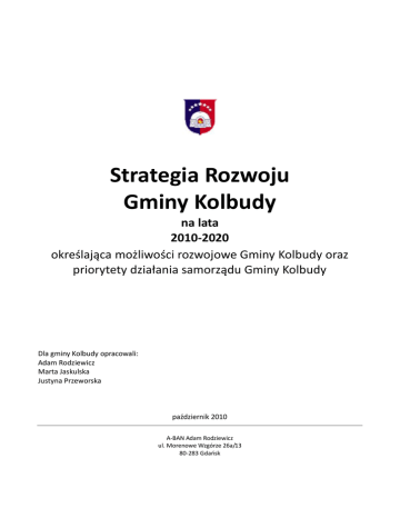 Strategia Rozwoju Gminy Kolbudy na lata 2010-2020 określająca możliwości rozwojowe Gminy Kolbudy oraz priorytety działania samorządu Gminy Kolbudy Dla gminy Kolbudy opracowali: Adam Rodziewicz Marta Jaskulska Justyna Przeworska październik 2010 A-BAN Adam Rodziewicz ul. Morenowe Wzgórze 26a/13 80-283 Gdaosk STRATEGIA ROZWOJU GMINY KOLBUDY 2010-2020 Spis treści Spis treści .................................................................................................................................................... 2 Słowniczek ważniejszych pojęd: .................................................................................................................... 3 Wstęp .......................................................................................................................................................... 4 Co to jest Strategia Rozwoju Gminy? ........................................................................................................ 4 Strategia – do czego jest potrzebna? ........................................................................................................ 4 Metodologia sporządzania Strategii ............................................................................................................. 5 Podstawa prawna opracowania................................................................................................................ 5 Wymogi formalne ................................................................................................................................ 5 Przyjęta metodologia ............................................................................................................................... 5 Etapy przygotowania Strategii .............................................................................................................. 6 Partycypacja społeczna ........................................................................................................................ 7 Dokumenty strategiczne bezpośrednio dotyczące Strategii Rozwoju Gminy .............................................. 8 Strategia Powiatu Gdaoskiego ............................................................................................................. 8 Strategia Województwa Pomorskiego .................................................................................................. 9 Strategia Rozwoju Kraju ......................................................................................................................10 Punkt A – Jaka jest sytuacja w gminie dzisiaj?..............................................................................................11 Diagnoza demograficzno-gospodarcza ....................................................................................................11 Lokalizacja ..........................................................................................................................................11 Zainwestowanie..................................................................................................................................11 Demografia ........................................................................................................................................11 Gospodarka ........................................................................................................................................13 Turystyka i rekreacja ...........................................................................................................................13 Diagnoza społeczna ................................................................................................................................13 Ogólna charakterystyka mieszkaoców gminy.......................................................................................14 Identyfikacja z gminą i wizerunek gminy .............................................................................................15 Aktywnośd społeczna mieszkaoców ....................................................................................................15 Powiązania funkcjonalne ....................................................................................................................16 Problemy w funkcjonowaniu gminy ....................................................................................................16 Podsumowanie ...................................................................................................................................18 Analiza budżetu gminy ............................................................................................................................19 Analiza SWOT .........................................................................................................................................21 Strategia Rozwoju na lata 199 — 2015 – analiza aktualności ...................................................................23 Podsumowanie analizy aktualności .....................................................................................................24 Punkt B – Jak powinna wyglądad gmina w przyszłości? ................................................................................26 Wizja ......................................................................................................................................................26 Cele rozwoju gminy.................................................................................................................................26 Cel strategiczny ..................................................................................................................................26 Cele operacyjne .................................................................................................................................. 27 Jak z punktu A dojśd do punktu B? ..............................................................