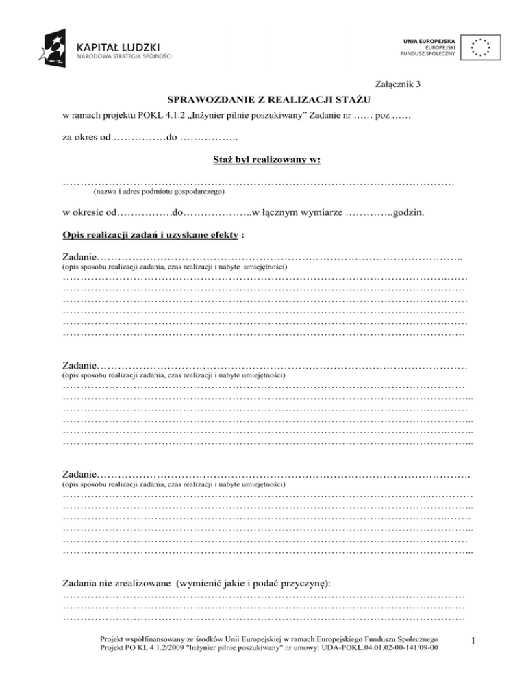 Załącznik 3 SPRAWOZDANIE Z REALIZACJI STAŻU w ramach projektu POKL 4.1.2 „Inżynier pilnie poszukiwany” Zadanie nr …… poz …… za okres od ……………do …………….. Staż był realizowany w: ………………………………………………………………………………………………… (nazwa i adres podmiotu gospodarczego) w okresie od…………….do………………..w łącznym wymiarze …………..godzin. Opis realizacji zadań i uzyskane efekty : Zadanie………………………………………………………………………………………….. (opis sposobu realizacji zadania, czas realizacji i nabyte umiejętności) ……………………………………………………………………………………………….…… …………………………………………………………………………………………………… ……………………………………………………………………………………………….…… …………………………………………………………………………………………………… ……………………………………………………………………………………………….…… …………………………………………………………………………………………………… Zadanie…………………………………………………………………………………………… (opis sposobu realizacji zadania, czas realizacji i nabyte umiejętności) …………………………………………………………………………………………………… ……………………………………………………………………………………………………... ……………………………………………………………………………………………….…… ……………………………………………………………………………………………………... ……………………………………………………………………………………………….…….. ……………………………………………………………………………………………………... Zadanie……………………………………………………………………………………………. (opis sposobu realizacji zadania, czas realizacji i nabyte umiejętności) …………………………………………………………………………………………...………… ……………………………………………………………………………………………………... ……………………………………………………………………………………………….……. ……………………………………………………………………………………………………... ……………………………………………………………………………………………….…… ……………………………………………………………………………………………………... Zadania nie zrealizowane (wymienić jakie i podać przyczynę): …………………………………………………………………………………………………… …………………………………………………………………………………………………… …………………………………………………………………………………………………… Projekt współfinansowany ze środków Unii Europejskiej w ramach Europejskiego Funduszu Społecznego Projekt PO KL 4.1.2/2009 "Inżynier pilnie poszukiwany" nr umowy: UDA-POKL.04.01.02-00-141/09-00 1 ……………………………………………………………………………………………….…… ……………………………………………………………………………………………………. ……………………………………………………………………………………………….…… …………………………………………………………………………………………………… W wyniku zrealizowania programu stażu nabyłem/am nowe wiadomości i umiejętności przydatnie w pracy zawodowej w studiowanej specjalności: …………………………………………………………………………………………………… …………………………………………………………………………………………………… …………………………………………………………………………………………………… …………………………………………………………………………………………………… ……………………………………………………………………………………………….…… ……………………………………………………………………………………………………... ……………………………………………………………………………………………….…… …………………………………………………………………………………………………….. ……………………………………………………………………………………………….…… ……………………………………………………………………………………………………. ……………………………………………………………………………………………….…… …………………………………………………………………………………………………….. …………………… (data, podpis studenta) ….……..……………………………. (data i podpis opiekuna stażysty w przedsiębiorstwie) Akceptuję …..……………………… (data i podpis kierownika zad