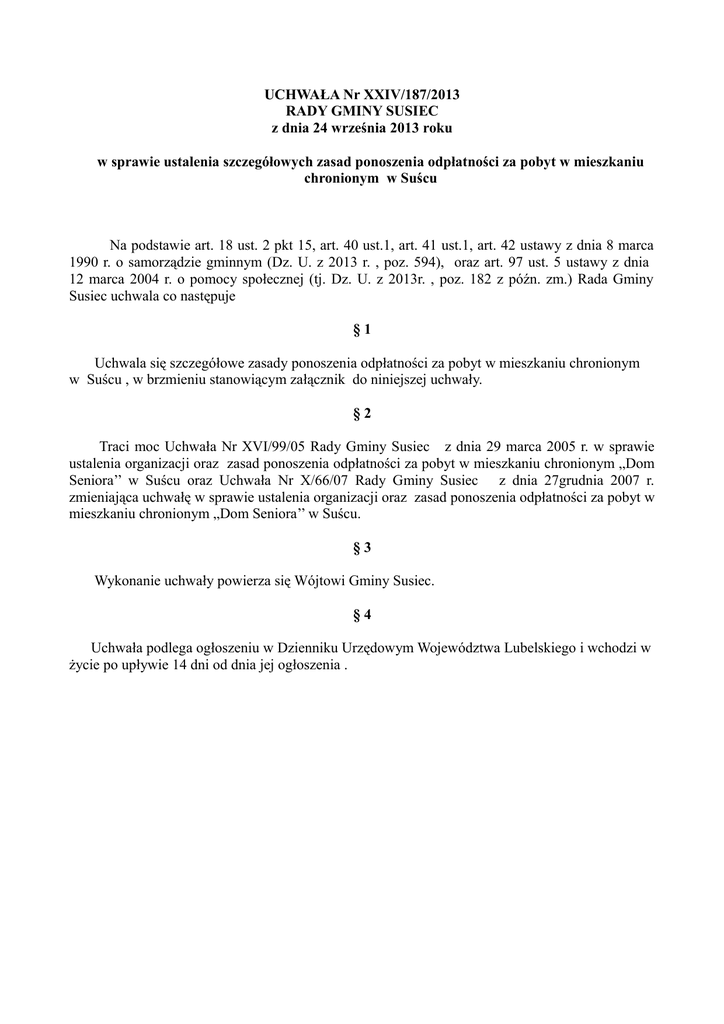 UCHWAŁA Nr XXIV/187/2013 RADY GMINY SUSIEC z dnia 24