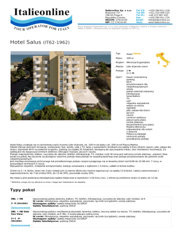 Italieonline Sp. z o.o. Bryksova 757 198 00 Praga 9 Republika Czeska REGON: 27614140 NIP: CZ 27614140 Tel CZ: Tel SK: Tel PL: Fax: Email: Web: +420 284 811 218 +421 233 006 523 +48 223 987 493 +420 284 811 210 [email protected] www.italieonline.eu Biuro podróży Italieonline sp. z o.o. jest zapisane w Miejskim Sądzie w Pradze oddział C, wkład 118991 i ubezpieczone na wypadek upadku w ČPP a.s. Hotel Salus (IT62-1962) Typ: Hotel Plaża: 100 m Region: Wenecja Euganejska Miasto: Lido di Jesolo ovest Pokoje: 2 2+1 Opis*: basen zewnętrzny parking Wi-Fi przystosowane dla niepełnosprawnych winda pobyt zwierząt zakazany klimatyzacja taras/balkon TV sejf niepełne wyżywienie widok na morze ogródek plac zabaw dla dzieci jacuzzi sauna centrum wellness piaszczysta plaża serwis plażowy bezpośrednio przy plaży Riwiera Wenecka odpowiednie dla rodzin z dziećmi Północny Adriatyk skrócone pobyty przedłużone pobyty Hotel Salus znajduje się w zachodniej części kurortu Lido di Jesolo, ok. 100 m od plaży i ok. 200 m od Piazza Marina. Obiekt oferuje gościom recepcję, restaurację i bar, windę, salę z TV, taras z parasolami i leżakami (za opłatą 3 €/os./dzień), basen, plac zabaw dla dzieci, darmowe Wi-Fi na parterze budynku, parking (za opłatą 35 €/tydzień, dostępny do wyczerpania miejsc, bez możliwości rezerwacji). Za opłatą jest do dyspozycji centrum wellness oferujące masaże, jacuzzi i saunę. Pokoje mają łazienkę, balkon, suszarkę do włosów, telefon, klimatyzację, TV, minibar i sejf. W cenę jest wliczony serwis plażowy - parasol i dwa leżaki na pokój. Na życzenie są dostępne rodzinne pokoje (dwa pokoje ze wspólną łazienką) oraz pokoje przystosowane do potrzeb osób niepełnosprawnych. Jest możliwa rezerwacja skróconego lub przedłużonego pobytu rozpoczynającego się w dowolny dzień (od 8.08 do 22.08 min. 7 nocy, w pozostałych terminach 5 nocy). Wyżywienie niepełne: śniadania kontynentalne, kolacje serwowane z wyborem z 3 menu, sałatki w formie bufetu. Zniżki na 3. i 4. łóżko: dzieci do 3 bez świadczeń za darmo (łóżeczko można wypożyczyć za opłatą 13 €/dzień, należy zarezerwować z wyprzedzeniem), do 7 lat zniżka 50%, do 13 lat 30%, pozostałe osoby 10%. Na miejscu jest pobierana obowiązkowa opłata miejscowa w wysokości 1,50 €/os./noc, z której są zwolnione dzieci w wieku do 12 lat. * Niektóre usługi nie są wliczone w cenę i mogą być świadczone za dopłatą. Typy pokoi DBL + HB 2 (double) Zarezerwować DBL + HB Side Sea View 2+1 (double) Zarezerwować dwuosobowy pokój, łazienka, balkon, TV, telefon, klimatyzacja, suszarka do włosów, sejf, minibar, wi fi. W cenie: klimatyzacja, niepełne wyżywienie, poszewki, ręczniki (za tydzień), serwis plażowy Wymagane opłaty: opłata miejscowa 10.50€/P Opłaty fakultatywne: parking 35€/A dwuosobowy pokój z możliwością dostawki, łazienka, balkon, boczny widok na morze, TV, telefon, klimatyzacja, suszarka do włosów, sejf, minibar, wi fi. Min. 3 osoby płacące pełną cenę. W cenie: klimatyzacja, niepełne wyżywienie, poszewki, ręczniki (za tydzień), serwis plażowy Wymagane opłaty: opłata miejscowa 10.50€/P Opłaty fakultatywne: parking 35€/A P - cena na osobę, A - cena za apartament/pokój Prezentowane zdjęcia są przykładowe. DBL + HB 2 Sezon (double) Terminy Cena za noc / P Koniec pobytu Min. ilość nocy A 01.05. - 24.05.2017 10.09. - 11.10.2017 336 zł Każdy dzień Każdy dzień 3 B 25.05. - 07.07.2017 28.08. - 09.09.2017 390 zł Każdy dzień Każdy dzień 5 C 08.07. - 04.08.2017 21.08. - 27.08.2017 409 zł Każdy dzień Każdy dzień 5 D 05.08. - 20.08.2017 457 zł Każdy dzień Każdy dzień 7 Zniżka 10% Ważne do Do 24.03.2017 Dla pobytów od 01.05.2017 Do 10.10.2017 DBL + HB Side Sea View 2+1 Sezon Terminy Warunek Zniżki nie można połączyć z innymi zniżkami (double) Cena za noc / P Początek pobytu Koniec pobytu Min. ilość nocy A 01.05. - 24.05.2017 10.09. - 11.10.2017 359 zł Każdy dzień Każdy dzień 3 B 25.05. - 07.07.2017 28.08. - 09.09.2017 414 zł Każdy dzień Każdy dzień 5 C 08.07. - 04.08.2017 21.08. - 27.08.2017 433 zł Każdy dzień Każdy dzień 5 D 05.08. - 20.08.2017 480 zł Każdy dzień Każdy dzień 7 Zniżka 10% Początek pobytu Ważne do Do 24.03.2017 Dla pobytów od 01.05.2017 Do 10.10.2017 Warunek Zniżki nie można połączyć z innymi zniżkami https://www.italieonline.eu/pl/lido-di-jesolo/hotel-salus-1962.html www.ITALIEONLINE.eu TOUR OPERATOR FOR ITALY