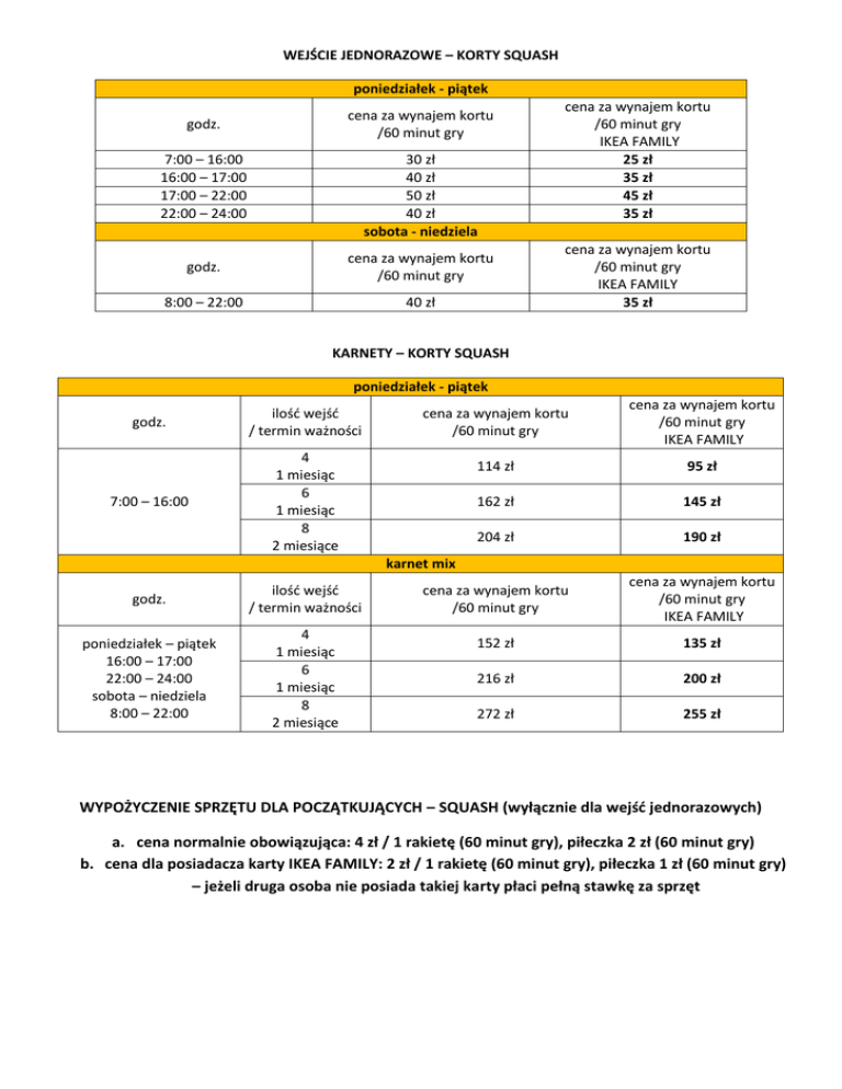 WEJŚCIE JEDNORAZOWE – KORTY SQUASH poniedziałek - piątek cena za wynajem kortu /60 minut gry godz. 7:00 – 16:00 16:00 – 17:00 17:00 – 22:00 22:00 – 24:00 30 zł 40 zł 50 zł 40 zł sobota - niedziela godz. cena za wynajem kortu /60 minut gry 8:00 – 22:00 40 zł cena za wynajem kortu /60 minut gry IKEA FAMILY 25 zł 35 zł 45 zł 35 zł cena za wynajem kortu /60 minut gry IKEA FAMILY 35 zł KARNETY – KORTY SQUASH poniedziałek - piątek godz. ilość wejść / termin ważności 7:00 – 16:00 4 1 miesiąc 6 1 miesiąc 8 2 miesiące cena za wynajem kortu /60 minut gry cena za wynajem kortu /60 minut gry IKEA FAMILY 114 zł 95 zł 162 zł 145 zł 204 zł 190 zł cena za wynajem kortu /60 minut gry cena za wynajem kortu /60 minut gry IKEA FAMILY 152 zł 135 zł 216 zł 200 zł 272 zł 255 zł karnet mix godz. ilość wejść / termin ważności poniedziałek – piątek 16:00 – 17:00 22:00 – 24:00 sobota – niedziela 8:00 – 22:00 4 1 miesiąc 6 1 miesiąc 8 2 miesiące WYPOŻYCZENIE SPRZĘTU DLA POCZĄTKUJĄCYCH – SQUASH (wyłącznie dla wejść jednorazowych) a. cena normalnie obowiązująca: 4 zł / 1 rakietę (60 minut gry), piłeczka 2 zł (60 minut gry) b. cena dla posiadacza karty IKEA FAMILY: 2 zł / 1 rakietę (60 minut gry), piłeczka 1 zł (60 minut gry) – jeżeli druga osoba nie posiada takiej karty płaci pełną stawkę za sprzęt TENIS STOŁOWY a. cena normalnie obowiązująca: 10 zł za wynajęcie stołu / 60 minut gry, 5 zł sprzęt (2 rakiety + piłeczka) b. cena dla posiadacza karty IKEA FAMILY: 9 zł za wynajęcie stołu / 60 minut gry, 4 zł sprzęt (2 rakiety + piłeczka) Wszystkie podane ceny są cenami brutto z podatkiem 23 % VAT.