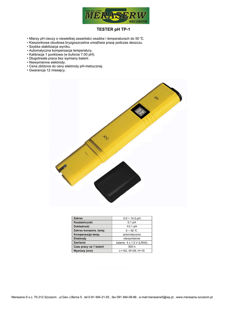 TESTER pH TP-1 • Mierzy pH cieczy o niewielkiej zawartości osadów i temperaturach do 50 °C. • Kieszonkowa obudowa bryzgoszczelna umoŜliwia pracę podczas deszczu. • Szybka stabilizacja wyniku. • Automatyczna kompensacja temperatury. • Kalibracja 1 punktowa (w buforze 7.00 pH). • Długotrwała praca bez wymiany baterii. • Niewymienne elektrody. • Cena zbliŜona do ceny elektrody pH-metrycznej. • Gwarancja 12 miesięcy. 0.0 ÷ 14.0 pH 0.1 pH ± 0.1 pH 0 ÷ 50 °C automatyczna niewymienne baterie 4 x 1.5 V (LR44) 500 h L=142, W=29, H=15 Meraserw-5 s.c. 70-312 Szczecin , ul.Gen.J.Bema 5 , tel.0-91 484-21-55 , fax 091 484-09-86 , e-mail:[email protected] , www.meraserw.szczecin.pl