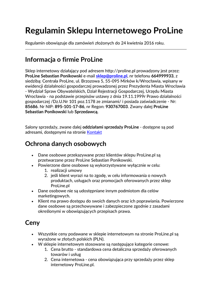 Regulamin Sklepu Internetowego ProLine Regulamin obowiązuje dla zamówień złożonych do 24 kwietnia 2016 roku. Informacja o firmie ProLine Sklep internetowy działający pod adresem http://proline.pl prowadzony jest przez: ProLine Sebastian Ponikowski e-mail [email protected], nr telefonu 664999933, z siedzibą: Centrala ProLine, ul. Brzozowa 5, 55-095 Mirków k/Wrocławia, wpisany w ewidencji działalności gospodarczej prowadzonej przez Prezydenta Miasta Wrocławia - Wydział Spraw Obywatelskich, Dział Rejestracji Gospodarczej, Urzędu Miasta Wrocławia - na podstawie przepisów ustawy z dnia 19.11.1999r Prawo działalności gospodarczej /Dz.U.Nr 101 poz.1178 ze zmianami/ i posiada zaświadczenie - Nr: 85686. Nr NIP: 895-101-17-86, nr Regon: 930767003. Zwany dalej ProLine Sebastian Ponikowski lub Sprzedawcą. Salony sprzedaży, zwane dalej oddziałami sprzedaży ProLine - dostępne są pod adresami, dostępnymi na stronie Kontakt Ochrona danych osobowych Dane osobowe przekazywane przez klientów sklepu ProLine.pl są przetwarzane przez ProLine Sebastian Ponikowski. Powierzone dane osobowe są wykorzystywane wyłącznie w celu: 1. realizacji umowy 2. jeśli klient wyrazi na to zgodę, w celu informowania o nowych produktach, usługach oraz promocjach oferowanych przez sklep ProLine.pl Dane osobowe nie są udostępniane innym podmiotom dla celów marketingowych. Klient ma prawo dostępu do swoich danych oraz ich poprawiania. Powierzone dane osobowe są przechowywane i zabezpieczone zgodnie z zasadami określonymi w obowiązujących przepisach prawa. Ceny Wszystkie ceny podawane w sklepie internetowym na stronie ProLine.pl są wyrażone w złotych polskich (PLN). W sklepie internetowym stosowane są następujące kategorie cenowe: 1. Cena brutto - standardowa cena detaliczna sprzedaży oferowanych towarów i usług 2. Cena internetowa - cena obowiązująca przy sprzedaży przez sklep internetowy ProLine.pl. 3. Cena w promocji Headshot - cena specjalna obowiązująca przy sprzedaży przez sklep internetowy ProLine.pl podczas trwania promocji przy wybraniu transportu kurierem, do Paczkomatu lub paczki w Ruchu. Wszystkie podane ceny oferowanych produktów zawierają rabat w wysokości 1%. Rabat ten nie jest naliczany w przypadku płatności za pośrednictwem systemów płatności on-line DotPay, kartą płatniczą, kartą płatniczą w oddziale. Ceny w oddziałach sprzedaży ProLine mogą nieznacznie różnić się od cen prezentowanych na stronach sklepu internetowego. W przypadku zamówienia zestawu komputerowego z inna formą płatności niż przedpłata na konto, sklep może wymagać 10% zadatku w celu realizacji zamówienia. Podatkowa Dokumentacja Zakupów Na wszystkie zamówione towary w sklepie internetowym ProLine wystawiane są paragony fiskalne lub faktury VAT. Stosownie do treści przepisów ustawy z dnia 11 marca 2004r. o podatku od towarów i usług (tekst jednolity: Dz. U. 2011 r. Nr 177 poz. 1054) oraz rozporządzenia Ministra Finansów z dnia 3 grudnia 2013 r. w sprawie wystawiania faktur (Dz. U. z 2013 r. poz. 1485), podpis klienta - jako nabywcy towaru- nie jest obowiązkowym elementem treści faktury VAT. W tej sytuacji nabywca otrzymuje wyłącznie oryginał faktury. Należy przy tym mieć na uwadze, że w przypadku, gdy kupujący będący osobą fizyczną składa zamówienie lub dokonuje zakupu przy z podaniem nazwy firmy prowadzonej przez tego kupującego, domniemywać się będzie, iż zakup jest przez niego dokonywany w związku z taką działalnością i faktura wystawiona będzie na tego kupującego jako przedsiębiorcę. Zgodnie przepisami ustawy z dnia 11 marca 2004 r. o podatku od towarów i usług (tekst jednolity: Dz. U. 2011 r. Nr 177 poz. 1054), Kupujący akceptuje wystawianie i przesyłanie faktur w formie elektronicznej wysłanej na adres email podany w trakcie rejestracji lub w formularzu zamówienia. Za moment otrzymania faktury przez Kupującego uznaje się moment otwarcia korespondencji elektronicznej z załączoną fakturą. Zamówienia Sklep internetowy ProLine.pl umożliwia Klientom: 1. dokonywanie rezerwacji towarów oferowanych w oddziałach sprzedaży ProLine, 2. składanie zamówień dotyczących towarów dostępnych w ramach sklepu internetowego i zawierania umów kupna/sprzedaży towarów na odległość 3. uzyskanie informacji o towarach i usługach dostępnych w sklepie internetowym oraz w oddziałach sprzedaży ProLine. Wszelkie informacje dotyczące towarów, w tym w szczególności katalogi, foldery, broszury, inne materiały informacyjne lub reklamowe, a także informacje zawarte na stronie ProLine.pl kierowane przez ProLine Sebastian Ponikowski do odbiorców i potencjalnych klientów nie stanowią oferty w rozumieniu przepisów prawa, a są wyłącznie zaproszeniem do rozpoczęcia negocjacji. Sklep internetowy przyjmuje zamówienia poprzez stronę ProLine.pl. Zamówienia realizowane są w kolejności ich składania. Klient może wprowadzać zmiany w zamówieniu poprzez kontakt telefoniczny: +48 664999933, Wiadomości wysyłane pod zamówieniem lub pocztą elektroniczną na adres: 664999933. Złożenie zamówienia nie jest równoznaczne z jego przyjęciem przez sklep ProLine.pl. Za moment przyjęcia zamówienia uważa się przekazanie zamawiającemu informacji o nadaniu statusu "Potwierdzenie realizacji", a w przypadku gdy wybrano sposób zapłaty Przedpłata przelew lub Płatność on-line Dotpay za moment zawarcia umowy uważa się dokonanie płatności na wskazane przez sprzedawcę konto. W przypadku dokonania rezerwacji przez sklep internetowy ProLine.pl towaru oferowanego w oddziałach sprzedaży ProLine, umowa kupna/sprzedaży zawierana jest w danym salonie sprzedaży ProLine po osobistej akceptacji oferty przez klienta. Z przyczyn leżących po stronie przewoźnika maksymalna kwota pobrania (zapłaty gotówkowej) wynosi 5000 PLN. Sposób zapłaty różnicy zostanie ustalony indywidualnie z klientem. Sklep ProLine.pl nie prowadz