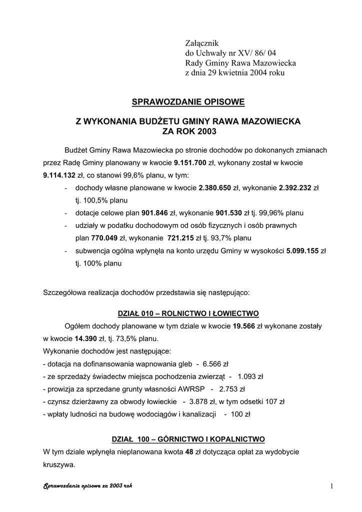 Załącznik do Uchwały nr XV/ 86/ 04 Rady Gminy Rawa Mazowiecka z dnia 29 kwietnia 2004 roku SPRAWOZDANIE OPISOWE Z WYKONANIA BUDŻETU GMINY RAWA MAZOWIECKA ZA ROK 2003 Budżet Gminy Rawa Mazowiecka po stronie dochodów po dokonanych zmianach przez Radę Gminy planowany w kwocie 9.151.700 zł, wykonany został w kwocie 9.114.132 zł, co stanowi 99,6% planu, w tym: - dochody własne planowane w kwocie 2.380.650 zł, wykonanie 2.392.232 zł tj. 100,5% planu - dotacje celowe plan 901.846 zł, wykonanie 901.530 zł tj. 99,96% planu - udziały w podatku dochodowym od osób fizycznych i osób prawnych plan 770.049 zł, wykonanie 721.215 zł tj. 93,7% planu - subwencja ogólna wpłynęła na konto urzędu Gminy w wysokości 5.099.155 zł tj. 100% planu Szczegółowa realizacja dochodów przedstawia się następująco: DZIAŁ 010 – ROLNICTWO I ŁOWIECTWO Ogółem dochody planowane w tym dziale w kwocie 19.566 zł wykonane zostały w kwocie 14.390 zł, tj. 73,5% planu. Wykonanie dochodów jest następujące: - dotacja na dofinansowania wapnowania gleb - 6.566 zł - ze sprzedaży świadectw miejsca pochodzenia zwierząt - 1.093 zł - prowizja za sprzedane grunty własności AWRSP - 2.753 zł - czynsz dzierżawny za obwody łowieckie - 3.878 zł, w tym odsetki 107 zł - wpłaty ludności na budowę wodociągów i kanalizacji - 100 zł DZIAŁ 100 – GÓRNICTWO I KOPALNICTWO W tym dziale wpłynęła nieplanowana kwota 48 zł dotycząca opłat za wydobycie kruszywa. Sprawozdanie opisowe za 2003 rok 1 DZIAŁ 600 –TRANSPORT I ŁĄCZNOŚĆ Dochody w tym dziale planowane w kwocie 153.759 zł, wykonane zostały w kwocie 153.012 zł, z czego kwota 4.159 zł stanowiła odszkodowanie z Zakładu Ubezpieczeń za zniszczony przystanek w miejscowości Konopnica. Kwota 148.853 zł z Agencji Restrukturyzacji i Modernizacji Rolnictwa na budowę drogi Kaleń-Zagórze wpłynęła w m-cu grudniu. DZIAŁ 700– GOSPODARKA MIESZKANIOWA Ogółem dochody planowane w tym dziale w kwocie 76.141 zł wykonane zostały w kwocie 81.232 zł, tj. 106,7% planu. Na dochody w tym dziale składają się: - opłaty z tyt. wieczystego użytkowania - 17.638 zł - najmu i dzierżawy - 7.902 zł, w tym odsetki 639 zł - sprzedaż mienia komunalnego - 53.710 zł - opłaty z tyt. przekształcenia prawa użytkowania wieczyst. w prawo własności - 1.982 zł DZIAŁ 750– ADMINISTRACJA PUBLICZNA W tym dziale planowane dochody stanowiły kwotę 80.644 zł, wykonane zostały w wysokości 76.226 zł, co stanowi 94,5%. Na dochody w tym dziale składają się: - dotacje na zadania zlecone wykonywane przez Urząd Gminy w ramach zadań ustawowych wpłynęły na ogólną kwotę - 70.644 zł - pozostałe dochody: wpłata za sprzedane drewno topolowe, za specyfikacje przetargowe, przyłącze wodociągowe - 5.582 zł DZIAŁ 751 – URZĘDY NACZELNYCH ORGANÓW WŁADZY PAŃSTWOWEJ, KONTROLI I OCHRONY PRAWA ORAZ SĄDOWNICTWA W tym dziale planowane dochody stanowiły kwotę 16.131 zł, wykonane zostały w wysokości 16.131 zł, co stanowi 100% planu: Dotacja na przeprowadzenie referendum ogólnokrajowego została przekazana w pełnej wysokości w kwocie 14.904 zł. Dotację na prowadzenie i aktualizację stałego rejestru wyborców przekazano w kwocie 1.227 zł. DZIAŁ 754 – BEZPIECZEŃSTWO PUBLICZNE I OCHRONA PRZECIWPOŻAROWA Dotacja na Obronę Cywilną planowana w wysokości 760 zł przekazana została do budżetu Gminy w 100%. Sprawozdanie opisowe za 2003 rok 2 DZIAŁ 756 – DOCHODY OD OSÓB PRAWNYCH OD OSÓB FIZYCZNYCH I OD INNYCH JEDNOSTEK NIE POSIADAJĄCYCH OSOBOWOŚCI PRAWNEJ. Ogółem plan dochodów w tym dziale stanowił kwotę 2.782.799 zł, wykonany został w wysokości 2.758.068 zł, co stanowi 99,1% planu rocznego. Na dochody w tym dziale składają się: I. Udziały gmin w podatkach stanowiących dochód budżetu państwa. Podatek dochodowy od osób fizycznych - planowana kwota 714.049 zł, wykonanie wynosi 663.283 zł tj. 92,9% planu. Podatek dochodowy od osób prawnych na plan 56.000 zł, wykonanie stanowi 57.932 zł tj. 103,4% II. Wpływy z podatków i opłat lokalnych od osób prawnych. Planowane dochody – 1.144.100 zł, wykonanie – 1.217.787 zł tj.106,4% planu. 1. Podatek od nieruchomości: plan 1.080.000 zł wykonanie 1.186.351 zł co stanowi 109,8% planu; w stosunku do należności wykonanie wynosi 89,7%. Zaległość na dzień 31 grudnia 2003 r. wynosi 135.517 zł. W październiku 2002 roku do restrukturyzacji zaległych należności podatkowych przystąpiły 3 przedsiębiorstwa, na łączną kwotę do oddłużenia 135.144 zł. Postępowanie restrukturyzacyjne zgodnie z ustawą ma zostać zakończone do końca kwietnia 2004 roku. Na pozostałą zaległość po każdej racie wystawiane zostały upomnienia oraz tytuły wykonawcze. W 2003 r. wystawiono tytuły na łączną kwotę 14.337,90 zł 2.Podatek rolny: plan – 1.100 zł, wykonanie 1.187 zł, tj. 107,9% planu, natomiast wykonanie w stosunku do należności wynosi 91% 3. Podatek leśny: plan - 34.000 zł, wykonanie - 14.255 zł, tj. 41,9% planu. W stosunku do należności podatku leśnego wykonanie wynosi 100%. 4.Podatek od środków transportowych plan14.000 zł, wykonanie 14.203 zł, tj. 101,4%. 5. W tym rozdziale wpłynęła nieplanowana kwota w wysokości 153 zł dot. podatku od czynności cywilnoprawnych. 6.Odsetki od nieterminowych wpłat z tyt. podatków i opłat na plan 15.000 zł wykonanie 1.638 zł Sprawozdanie opisowe za 2003 rok 3 III. Podatki i opłaty lokalne od osób fizycznych Planowane dochody – 771.150 zł, wykonanie – 722.958 zł co stanowi 93,7% planu. 1.Podatek rolny plan 404.000 zł, wykonanie 438.049 zł, tj.108,4%. Wykonanie w stosunku do należności wynosi 82,1%. Zaległość na koniec 2003 r. wynosi 95.120 zł. Wystawiane na bieżąco upomnienia oraz tytuły wykonawcze zwiększają dyscyplinę płatności podatków przez osoby fizyczne. Dla przykładu po I racie 2003 r. ogółem na pod. rolny wystawiono 144 upomnienia na kwotę 30,9 tys.z