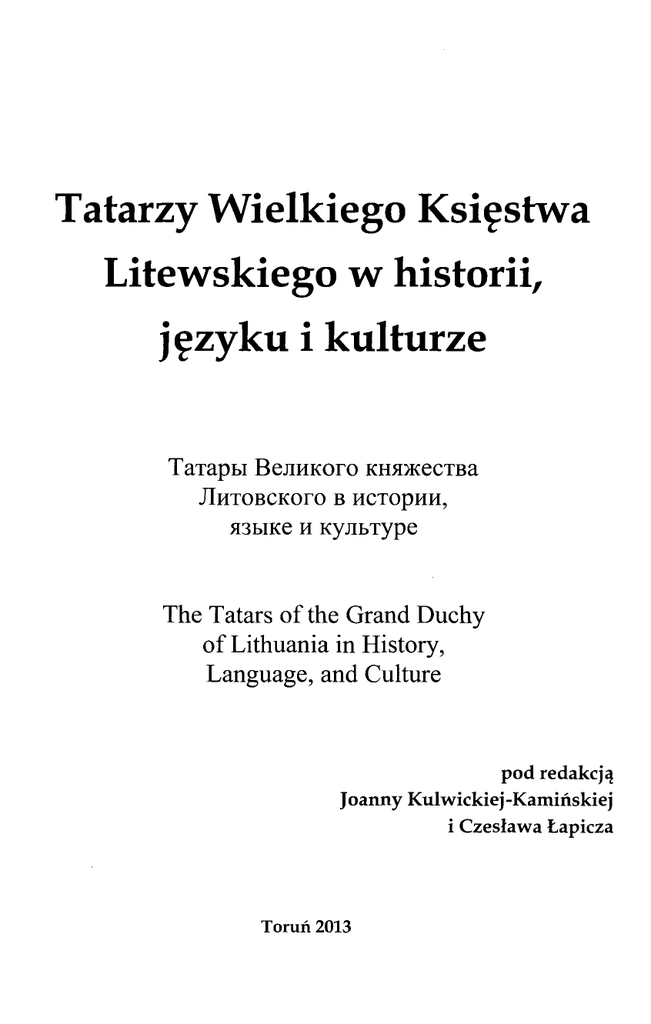 Tatarzy Wielkiego Księstwa Litewskiego w historii, języku i kulturze TaTapti BejiHKoro KHJDKecTBa JlHTOBCKOrO B HCTOpHH, H3biKe H KyjitType The Tatars of the Grand Duchy of Lithuania in History, Language, and Culture pod redakcją Joanny Kulwickiej-Kamińskiej i Czesława Łapicza Toruń 2013 SPIS TREŚCI Wstęp 11 I. Maciej Musa Konopacki Musa Czachorowski (Polska, Wrocław) Maciejowi Musie Konopackiemu - wiersz dedykowany M.M. Konopackiemu 25 Czesław Łapicz (Polska, Toruń) Maciej Musa Konopacki jako badacz dziejów Tatarów Wielkiego Księstwa Litewskiego oraz popularyzator kultury islamu (laudacja) 27 Iwona Radziszewska (Polska, Toruń-Gdańsk) Bibliografia prac Macieja Musy Konopackiego. Wybór 33 II. Tatarzy Wielkiego Księstwa Litewskiego: historia i współczesność Natalia Danyliuk (Polska, Toruń) Islam i Ukraina 45 Stanisław W. Dumin (Rosja, Moskwa) Tradycje genealogiczne i legendy rodowe Tatarów litewskich 61 Adas Jakubauskas (Litwa, Wilno) Wczoraj i dziś gminy tatarskiej na Litwie 91 III. Piśmiennictwo i język Tatarów Wielkiego Księstwa Litewskiego Shirin Akiner (Wielka Brytania, Londyn) Treść kitabu ze zbiorów Biblioteki Brytyjskiej 103 Marek M. Dziekan (Polska, Łódź) Chcąc znać i wiedzieć, jak ciągnąć fał alkuranowy w „Chamaile Aleksandrowicza" 125 Aleksander Gadomski (Ukraina, Symferopol) Uwagi na temat bibliografii teolingwistyki 135 Henryk Jankowski (Polska, Poznań) Imiennictwo Tatarów litewsko-polsko-białoruskich w dawnych dokumentach 149 Joanna Kulwicka-Kamińska (Polska, Toruń) Nazwy bogów pogańskich w piśmiennictwie Tatarów Wielkiego Księstwa Litewskiego i w polskich przekładach Koranu jako przykład interferencji islamu i chrześcijaństwa 165 Czesław Łapicz (Polska, Toruń) Źródła cytatów koranicznych w Wykładzie wiary machometańskiej czyli islamskiej... Józefa Sobolewskiego z 1830 r 185 Tadeusz Majda (Polska, Warszawa) Osmanizacja pisanego języka Tatarów polsko-litewskich 203 Galina Miszkiniene, Sergiej Temczyn (Litwa, Wilno) O tekstologii rękopiśmiennych kitabów Tatarów litewskich: Dialog proroka Muhammada z szejtanem 211 Iwona Radziszewska (Polska, Toruń-Gdańsk) Praktyki magiczne w chamaiłach Tatarów Wielkiego Księstwa Litewskiego (na podstawie tzw .fału Sulejmana) 231 Volha Starastsina (Białoruś, Witebsk) Porównanie zawartości Kitabu Lebiedzia (z drugiej połowy XVIII w.) z zawartością innych rękopisów Tatarów Wielkiego Księstwa Litewskiego 253 Irina Synkova (Białoruś, Mińsk) Magiczne teksty w rękopisach Tatarów WKL 275 Michaił Tarelka (Białoruś, Mińsk) Pskowski Koran z 1093/1682 r. Nowe informacje 291 IV. Tatarzy Wielkiego Księstwa Litewskiego w kulturze Selim Chazbijewicz (Polska, Olsztyn) Islam i Tatarzy w literaturze polskiej 309 Świetlana Czerwonnaja (Polska, Toruń - Rosja, Moskwa) Mizary i nagrobki Tatarów polsko-litewskich na tle islamskiej sztuki epigraficznej ich sąsiadów ze Wschodu 319 COAEP5KAHHE BcTynneHHe I. Maueft Myca KoHonauKUH Myca HaxopoecKuu (Ilojibuia, BpounaB) C TMX Mycbi HaxopoBCKoro, nocBflineHHbifi M.M. KcmonauKOMy Hecnae Jlanun (nojibiua, TopyHb) Maueii Myca KoHonauKHH - ncc.neziOBaTe.Jib HCTOPHH TaTap BejiHKoro KHH>KecTBa JIMTOBCKOTO H nonyjiapH3aTop KyjibTypbi HCJiaMa (jiay^auwa) Heoua PaÓ3uiueecKaH (Tlojibiiia, OiaHbCK-Topyiib) EnGjiHorpacjmfl paSoT Mauea Mycbi KoHonauKoro II. TaTapw BejiHKoro KHH/KccTBa JlHTOBCKoro: HCTOPHH H coBpeiweHHocTb HamanuH flamuiioK (riojibiua, TopyHb) HcnaM H YKpaHHa Cmamicjiae B. JlyMim (P OCCHH, MocKBa) TEHEAJIORHNECKHE TpaflHijHH H po/iOBbie jiereHflbi JIHTOBCKHX TATAP Adac }/Ky6aycKac (JIHTB3, BHJibHioc) IlpouiJioe H HacTOHiyee TaTapcKOH rMHHbi B JIHTBC III. JlHTepaTypa H H3BIK TaTap BejiHKoro KHHwecTBa JlHTOBCKoro UIupilH AKUHep (BejTHKOÓpHTaHHH, JIOH^OH) CoAcp>KaHne KHTaSa EpHTaHCKOH 6H6jwoTeKH MapeK M. JJseKan (Tlojibma, JIo,a,3b) Chcąc znać i wiedzieć, jak ciągnąć fał alkuranowy B «XaMaHJie ANEKCAHFLPOBHHA» A/ieKcandp radoMCKiiu (YKpaHHa, CHMcJ)eponojib) 3aMeHaHHH no noBO^y 6H6jiHorpat})HH TeojiHHrBHCTHKH REUPUK HHKOBCKUU (Ilojibiiia, no3HaHb) OHOMaCTHKa JlHTOBCKO-nOJlbCKO-6eJ!OpyCCKHX TaTap B AABHHX FLOKYMEHTAX Hoanna KyjibeuifKOH-KaMUHbCKOH (nojibina, TopyHb) Ha3BaHH5i H3biHecKHx 6oroB B JiHTepaType TaTap BejiHKoro KHH)KECTBA JIMTOBCKOTO h B nojibCKHx nepeBO,a,ax KopaHa KaK npHMep HHTepcjDepeHUHH HCJiaMa H xpncTHaHCTBa 165 Hec/iae Jlamm (Ilojibma, TopyHb) MCTOHHHKH KOPAHHHECKHX UHTAT B Wykładzie wiary machometańskiej czyli islamskiej... («TojiKOuaHHM Bepbi MaroMeTaHCKOH, TO ecTb HCJiaMCKOH») K)3e(j)a Co6ojieBCKoro 1830 r 185 Tadeyui Mauda (nojibina, BapmaBa) OcMaHH3auHH nHCbMeHHoro »3biica nojibCKO-JIHTOBCKHX TaTap 203 rajiuua MutuKUHene, Cep2eu TeMmm (JlHTBa, Bmibnioc) O TeKCTOJlOrHH pyKOnHCHbIX KHTa60B JIHTOBCKHX TaTap: /],Hajior npopoKa MyxaMMe.ua c maHTaHOM 211 Heona PaÓ3uiueecKaH (flojibina, TflaHbCK-TopyHb) MaranecKMe o6p«,abi B xaiviaHJiax TaTap BejiHKoro KHa>KecTBa JlHTOBCKoro 231 Ojibea Cmapocmima (Bejiapycb, BHTe6cK) ConocTaBJieHHe co/iep>KaHHH «KnTa6a JIe6ezi«» (BT. non. XVIII B.) C coaep>KaHneM ,a,pyrHX pyKonnceH TaTap BejiHKoro KH>DKecTBa JlHTOBCKoro 253 Mpima CbiHKoea (Bejiapycb, MHHCK) 3HaxapcKHe TCKCTH B pyKoriHCHx TaTap BejiHKoro KHSDKecTBa JlmoBCKoro 275 Muxawi Tapejim (Bejiapycb, MHHCK) FICKOBCKHH KopaH 1093/1682 r. HoBbie CBEAEHHH 291 IV. TaTapbi BejiHKoro KHJmecTBa JlHTOBCKoro B KyjibType CenuM Xa3ÓueeuH (Ilojibma, OjibiuTbiH) HcjiaM H TaTapbi B nojibCKoft JiHTepaType 309 CeemnaHa M. WepeoHHan (nojibina, TopyHb - POCCHH, MocKBa^ Mn3apbi H Ha^rpoGna nojibCKo-JiHTOBCKHx TaTap Ha (j)OHe HCKyccTBa HCJiaMCKOH 3nnrpa(J)HKH HX coce^eM c BocTOKa 319 CONTENTS Introduction 11 I. Maciej Musa Konopacki Musa Czachorowski (Poland, Wrocław) Musa Czachorowskie poem dedicated to Maciej Musa Konopacki 25 Czesław Łapicz (Poland, Toruń) Maciej Musa Konopacki as a researcher of the history of the Tatars of the Grand Duchy of Lithuania and a promoter of the Islamie culture (a speech) 27 Iw
