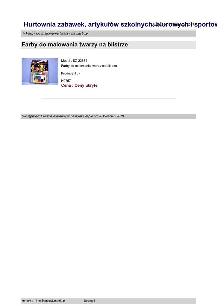 : 07 marzec 2017 Hurtownia zabawek, artykułów szkolnych,Utworzono biurowych i sportow > Farby do malowania twarzy na blistrze Farby do malowania twarzy na blistrze Model : SZ-22634 Farby do malowania twarzy na blistrze Producent : H9757 Cena : Ceny ukryte Dostępność: Produkt dostępny w naszym sklepie od 26 kwiecień 2010 kontakt : - [email protected] Strona 1