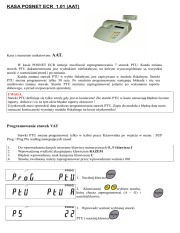 KASA POSNET ECR 1.01 (AAT) Kasa z numerem unikatowym: AAT. W kasie POSNET ECR istnieje możliwość zaprogramowania 7 stawek PTU. Każda zmiana stawek PTU dokumentowana jest wydrukiem niefiskalnym, na którym wyszczególnione są wszystkie stawki z wartościami przed i po zmianie. Każda zmiana stawek PTU w trybie fiskalnym, jest zapisywana w module fiskalnym. Stawki PTU można programować tylko 30 razy. Po ostatnim programowaniu następuję blokada i nie ma możliwości zmiany stawek. Stawki PTU możemy zaprogramować jedynie po wykonaniu raportu dobowego, a przed rozpoczęciem sprzedaży. UWAGA. Stawki PTU definiuje się tylko wtedy gdy jest to konieczne! Złe stawki PTU w kasie oznaczają błędnie liczone raporty dobowe i co za tym idzie błędne raporty okresowe ! Użytkownik musi sprawdzić datę podczas programowania stawek PTU. Zapis do modułu z błędną datą może oznaczać konieczność wymiany modułu fiskalnego na koszt użytkownika! Programowanie stawek VAT Stawki PTU można programować tylko w trybie pracy Kierownika po wejściu w menu : SUP Prog / Prog Ptu według następujących zasad: 1. 2. 3. 4. Do wprowadzania danych używamy klawiszy numerycznych O...9 i klawisza J Wprowadzoną wielkość akceptujemy klawiszem RAZEM Błędnie wprowadzony znak kasujemy klawiszem C Stawkę zwolnioną należy zaprogramować przez wprowadzenie wartości 100. 1. Naciśnij klawisz . 2. Klawiszami wybierz stawkę, którą chcesz zaprogramować (A — G) i naciśnij klawisz. 3. Wprowadź wartość wybranej stawki PTU i naciśnij klawisz . 1. Aby wprowadzić stawki PTU do pomięci kasy wybierz polecenie ,,dodaj” i naciśnij klawisz . Po akceptacji wprowadzonych z klawiatury stawek PTU na wyświetlaczu pojawi się data. Jeśli data jest poprawna naciśnięcie klawisza spowoduje wydruk niefiskalny dokumentujący zmianę stawek. Z UWAGA. 1. 2. 3. 4. 5. 6. 7. 8. Stawki PTU zostaną zapisane do pamięci kasy TYLKO po wybraniu opcji ,,dodaj”. Programowanie stawek możliwe jest tylko przy zerowych totalizerach (po raporcie dobowym). Do wprowadzania danych używamy klawiszy numerycznych O...9 i klawisza J. Wprowadzoną wielkość akceptujemy klawiszem [RAZEM]. Wprowadzenie wartości 1O1 oznacza, że wybrana stawka jest NIEAKTYWNA. Wprowadzenie wartości 1OO oznacza, że stawka jest ZWOLNIONA. Błędnie wprowadzony znak kasujemy klawiszem C. Stawki PTU można zmieniać TYLKO 3O razy. Dalsza zmiana stawek jest niemożliwa. Można pracować na kasie z ostatnio zapisanymi stawkami PTU. Zmiana przypisania stawki VAT do PLU W kasie Posnet ECR każdy towar musi mieć unikalną nazwę (maksymalnie 16 znaków) oraz stawkę PTU. W trakcie programowania towaru użytkownik może przyporządkować do niego cenę, opakowanie zwrotne oraz unikalny kod kreskowy. Dane te nie są wprowadzane obligatoryjnie, więc pominięcie którejkolwiek powoduje ustawienie wartości zerowych (co oznacza brak ceny proponowanej, brak przyporządkowanego opakowania oraz brak kodu kreskowego). Funkcja dostępna w menu kierownika SUP Prog. 1. Naciśnij klawisz POSNET Instrukcja . 2. Wybierz numer PLU do edycji. Kolejność wprowadzanych danych dotyczących towaru jest dowolna. Należy pamiętać, że aby towar został zaprogramowany musi zostać wprowadzona unikalna nazwa towaru i stawka PTU. 3. Naciśnij klawisz . 4. Wprowadź nazwę towaru i naciśnij klawisz . 5. Naciśnij klawisz kod kreskowy. aby wprowadzić 6. Wprowadź unikalny kod kreskowy i naciśnij klawisz . Kod kreskowy można wprowadzić ręcznie lub przy pomocy czytnika kodów kreskowych. Kod kreskowy sklada się z 6 do 13 cyfr. 7. Naciśnij klawisz . 8. Wprowadź cenę i naciśnij klawisz . Wprowadzenie wartości zerowej oznacza, że towar ma cenę otwartą. 9. Naciśnij klawisz . 10. Klawiszami i naciśnij klawisz POSNET Instrukcja wybierz odpowiednią stawkę PTU . 11. Naciśnij klawisz 12. Klawiszami . wybierz numer opakowania i naciśnij klawisz . Klawiszami można wybierać tylko zaprogramowane opakowania. Wprowadzenie wartości zerowej oznacza, że towar nie ma przypisanego opakowania. 13. Naciśnij klawisz . Każde programowanie towaru zakończone jest wydrukiem dokumentu niefiskalnego, na którym wyszczególniona jest nazwa towaru, numer PLU oraz przypisana do niego stawka PTU. POSNET Instrukcja