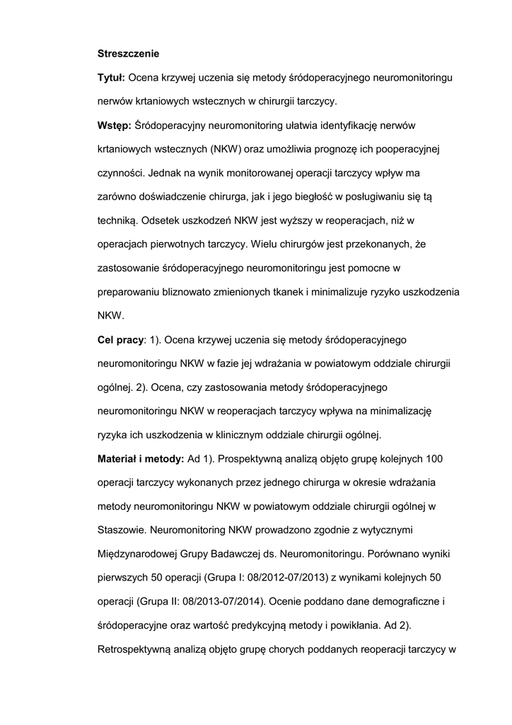 Streszczenie Tytuł: Ocena krzywej uczenia się metody śródoperacyjnego neuromonitoringu nerwów krtaniowych wstecznych w chirurgii tarczycy. Wstęp: Śródoperacyjny neuromonitoring ułatwia identyfikację nerwów krtaniowych wstecznych (NKW) oraz umożliwia prognozę ich pooperacyjnej czynności. Jednak na wynik monitorowanej operacji tarczycy wpływ ma zarówno doświadczenie chirurga, jak i jego biegłość w posługiwaniu się tą techniką. Odsetek uszkodzeń NKW jest wyższy w reoperacjach, niż w operacjach pierwotnych tarczycy. Wielu chirurgów jest przekonanych, że zastosowanie śródoperacyjnego neuromonitoringu jest pomocne w preparowaniu bliznowato zmienionych tkanek i minimalizuje ryzyko uszkodzenia NKW. Cel pracy: 1). Ocena krzywej uczenia się metody śródoperacyjnego neuromonitoringu NKW w fazie jej wdrażania w powiatowym oddziale chirurgii ogólnej. 2). Ocena, czy zastosowania metody śródoperacyjnego neuromonitoringu NKW w reoperacjach tarczycy wpływa na minimalizację ryzyka ich uszkodzenia w klinicznym oddziale chirurgii ogólnej. Materiał i metody: Ad 1). Prospektywną analizą objęto grupę kolejnych 100 operacji tarczycy wykonanych przez jednego chirurga w okresie wdrażania metody neuromonitoringu NKW w powiatowym oddziale chirurgii ogólnej w Staszowie. Neuromonitoring NKW prowadzono zgodnie z wytycznymi Międzynarodowej Grupy Badawczej ds. Neuromonitoringu. Porównano wyniki pierwszych 50 operacji (Grupa I: 08/2012-07/2013) z wynikami kolejnych 50 operacji (Grupa II: 08/2013-07/2014). Ocenie poddano dane demograficzne i śródoperacyjne oraz wartość predykcyjną metody i powikłania. Ad 2). Retrospektywną analizą objęto grupę chorych poddanych reoperacji tarczycy w klinicznym oddziale chirurgii w Krakowie z wizualizacją i neuromonitoringiem NKW vs. z wizualizacją nerwów, ale bez neuromonitoringu NKW. Celem identyfikacji właściwych chorych przeszukano kliniczną bazę danych chorych operowanych w latach 1993 – 2012. Pierwszorzędowym punktem końcowym był odsetek przejściowych i utrwalonych uszkodzeń NKW. Do oceny uszkodzeń NKW zastosowano laryngoskopię. Wyniki: Ad 1). W Grupie II w porównaniu do Grupy I stwierdzono istotne skrócenie czasu zabiegu (102,1±19,4 vs. 109,9±19,0; p=0,045), zwiększenie odsetka zidentyfikowanych NKW (99,0% vs. 89,2%; p=0,006), zmniejszenie odsetka błędów technicznych wymagających korekty (8,0% vs. 24,0%; p=0,029), poprawę wartości predykcyjnej ujemnej (99,0% vs. 89,3%; p<0,001) oraz dodatniej (75,0% vs, 55,6%; p<0,001), a także zmniejszenie odsetka uszkodzeń NKW (3,0% vs. 14,0%; p=0,006). Ad 2). Badana grupa składała się z 854 chorych (139 mężczyzn, 715 kobiet) operowanych z powodu wola nawrotowego (n = 576), nawrotu nadczynności tarczycy (n = 36), chorych poddanych radykalizacji z powodu raka tarczycy (n = 194), bądź reoperacji z powodu wznowy raka tarczycy (n = 48), włączając 472 zabiegi obustronnej i 382 zabiegów jednostronnej resekcji tarczycy; 1326 nerwów narażonych na ryzyko uszkodzenia (NNRU). Grupa 306 chorych (500 NNRU) poddana została reoperacjom ze śródoperacyjnym neuromonitoringiem NKW, natomiast 548 chorych (826 NNRU) przebyła reoperacje z wizualizacją NKW, ale bez neuromonitoringu. Przejściowe i utrwalone uszkodzenie NKW stwierdzono odpowiednio u 13 (2,6 %) i 7 (1,4 %) NNRU operowanych z neuromonitoringiem versus 52 (6,3 %) i 20 (2,4 %) NNRU operowanych bez neuromonitoringu (odpowiednio p = 0,003 oraz p = 0,202). Wnioski: Ad 1). Opanowanie techniki śródoperacyjnego neuromonitoringu NKW w chirurgii tarczycy wymaga samodzielnego wykonania około 50 monitorowanych operacji, co pozwala na uzyskanie wartości predykcyjnej metody porównywalnej z wynikami publikowanymi przez ośrodki referencyjne. Ad 2). Zastosowanie śródoperacyjnego neuromonitoringu NKW obniżyło odsetek chorych z przejściowym uszkodzeniem nerwów po reoperacji tarczycy w porównaniu do samej wizualizacji bez neuromonitoringu. Odsetek utrwalonych uszkodzeń NKW był także niższy w reoperacjach tarczycy z neuromonitoringiem, niż w reoperacjach z wizualizacją nerwów bez neuromonitoringu, choć do oceny istotności statystycznej tej różnicy konieczna byłaby analiza grupy badanej o liczebności równej 1840 NNRU (po 920 NNRU w każdym ramieniu badania). Słowa kluczowe: chirurgia tarczycy, śródoperacyjny neuromonitoring, nerw krtaniowy wsteczny