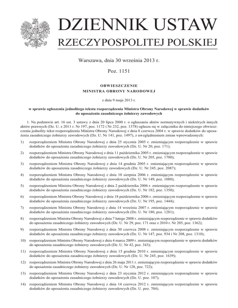 DZIENNIK USTAW RZECZYPOSPOLITEJ POLSKIEJ Warszawa, dnia 30 września 2013 r. Poz. 1151 OBWIESZCZENIE MINISTRA OBRONY NARODOWEJ z dnia 9 maja 2013 r. w sprawie ogłoszenia jednolitego tekstu rozporządzenia Ministra Obrony Narodowej w sprawie dodatków do uposażenia zasadniczego żołnierzy zawodowych 1. Na podstawie art. 16 ust. 3 ustawy z dnia 20 lipca 2000 r. o ogłaszaniu aktów normatywnych i niektórych innych aktów prawnych (Dz. U. z 2011 r. Nr 197, poz. 1172 i Nr 232, poz. 1378) ogłasza się w załączniku do niniejszego obwieszczenia jednolity tekst rozporządzenia Ministra Obrony Narodowej z dnia 8 czerwca 2004 r. w sprawie dodatków do uposażenia zasadniczego żołnierzy zawodowych (Dz. U. Nr 141, poz. 1497), z uwzględnieniem zmian wprowadzonych: 1) rozporządzeniem Ministra Obrony Narodowej z dnia 25 stycznia 2005 r. zmieniającym rozporządzenie w sprawie dodatków do uposażenia zasadniczego żołnierzy zawodowych (Dz. U. Nr 20, poz. 171); 2) rozporządzeniem Ministra Obrony Narodowej z dnia 11 października 2005 r. zmieniającym rozporządzenie w sprawie dodatków do uposażenia zasadniczego żołnierzy zawodowych (Dz. U. Nr 205, poz. 1700); 3) rozporządzeniem Ministra Obrony Narodowej z dnia 14 grudnia 2005 r. zmieniającym rozporządzenie w sprawie dodatków do uposażenia zasadniczego żołnierzy zawodowych (Dz. U. Nr 245, poz. 2087); 4) rozporządzeniem Ministra Obrony Narodowej z dnia 10 sierpnia 2006 r. zmieniającym rozporządzenie w sprawie dodatków do uposażenia zasadniczego żołnierzy zawodowych (Dz. U. Nr 149, poz. 1080); 5) rozporządzeniem Ministra Obrony Narodowej z dnia 2 października 2006 r. zmieniającym rozporządzenie w sprawie dodatków do uposażenia zasadniczego żołnierzy zawodowych (Dz. U. Nr 182, poz. 1350); 6) rozporządzeniem Ministra Obrony Narodowej z dnia 18 października 2006 r. zmieniającym rozporządzenie w sprawie dodatków do uposażenia zasadniczego żołnierzy zawodowych (Dz. U. Nr 195, poz. 1444); 7) rozporządzeniem Ministra Obrony Narodowej z dnia 14 września 2007 r. zmieniającym rozporządzenie w sprawie dodatków do uposażenia zasadniczego żołnierzy zawodowych (Dz. U. Nr 180, poz. 1281); 8) rozporządzeniem Ministra Obrony Narodowej z dnia 7 lutego 2008 r. zmieniającym rozporządzenie w sprawie dodatków do uposażenia zasadniczego żołnierzy zawodowych (Dz. U. Nr 29, poz. 171 oraz z 2010 r. Nr 205, poz. 1362); 9) rozporządzeniem Ministra Obrony Narodowej z dnia 30 czerwca 2008 r. zmieniającym rozporządzenie w sprawie dodatków do uposażenia zasadniczego żołnierzy zawodowych (Dz. U. Nr 147, poz. 934 i Nr 208, poz. 1310); 10) rozporządzeniem Ministra Obrony Narodowej z dnia 4 marca 2009 r. zmieniającym rozporządzenie w sprawie dodatków do uposażenia zasadniczego żołnierzy zawodowych (Dz. U. Nr 42, poz. 343); 11) rozporządzeniem Ministra Obrony Narodowej z dnia 15 grudnia 2010 r. zmieniającym rozporządzenie w sprawie dodatków do uposażenia zasadniczego żołnierzy zawodowych (Dz. U. Nr 245, poz. 1639); 12) rozporządzeniem Ministra Obrony Narodowej z dnia 26 maja 2011 r. zmieniającym rozporządzenie w sprawie dodatków do uposażenia zasadniczego żołnierzy zawodowych (Dz. U. Nr 128, poz. 722); 13) rozporządzeniem Ministra Obrony Narodowej z dnia 23 stycznia 2012 r. zmieniającym rozporządzenie w sprawie dodatków do uposażenia zasadniczego żołnierzy zawodowych (Dz. U. poz. 107); 14) rozporządzeniem Ministra Obrony Narodowej z dnia 14 czerwca 2012 r. zmieniającym rozporządzenie w sprawie dodatków do uposażenia zasadniczego żołnierzy zawodowych (Dz. U. poz. 704). Dziennik Ustaw –2– Poz. 1151 2. Podany w załączniku do niniejszego obwieszczenia tekst jednolity rozporządzenia nie obejmuje: 1) § 2 i § 3 rozporządzenia Ministra Obrony Narodowej z dnia 25 stycznia 2005 r. zmieniającego rozporządzenie w sprawie dodatków do uposażenia zasadniczego żołnierzy zawodowych (Dz. U. Nr 20, poz. 171), które stanowią: „§ 2. Przepisy rozporządzenia stosuje się przy ustalaniu wysokości dodatku za długoletnią służbę wojskową należnego żołnierzom zawodowym od dnia 1 stycznia 2005 r. § 3. Rozporządzenie wchodzi w życie z dniem ogłoszenia.”; 2) § 2 i § 3 rozporządzenia Ministra Obrony Narodowej z dnia 11 października 2005 r. zmieniającego rozporządzenie w sprawie dodatków do uposażenia zasadniczego żołnierzy zawodowych (Dz. U. Nr 205, poz. 1700), które stanowią: „§ 2. Przepisy rozporządzenia stosuje się przy ustalaniu wysokości dodatku za długoletnią służbę wojskową należnego żołnierzom zawodowym od dnia 1 października 2005 r. § 3. Rozporządzenie wchodzi w życie z dniem ogłoszenia.”; 3) § 2 rozporządzenia Ministra Obrony Narodowej z dnia 14 grudnia 2005 r. zmieniającego rozporządzenie w sprawie dodatków do uposażenia zasadniczego żołnierzy zawodowych (Dz. U. Nr 245, poz. 2087), który stanowi: „§ 2. Rozporządzenie wchodzi w życie po upływie 14 dni od dnia ogłoszenia.”; 4) § 2 i § 3 rozporządzenia Ministra Obrony Narodowej z dnia 10 sierpnia 2006 r. zmieniającego rozporządzenie w sprawie dodatków do uposażenia zasadniczego żołnierzy zawodowych (Dz. U. Nr 149, poz. 1080), które stanowią: „§ 2. Przepisy rozporządzenia stosuje się przy przyznawaniu dodatku służbowego należnego żołnierzom zawodowym od dnia 1 maja 2006 r. § 3. Rozporządzenie wchodzi w życie po upływie 14 dni od dnia ogłoszenia.”; 5) § 2 rozporządzenia Ministra Obrony Narodowej z dnia 2 października 2006 r. zmieniającego rozporządzenie w sprawie dodatków do uposażenia zasadniczego żołnierzy zawodowych (Dz. U. Nr 182, poz. 1350), który stanowi: „§ 2. Rozporządzenie wchodzi w życie z dniem ogłoszenia, z mocą od dnia 1 października 2006 r.”; 6) § 2 rozporządzenia Ministra Obrony Narodowej z dnia 18 października 2006 r. zmieniającego rozporządzenie w sprawie dodatków do uposażenia zasadniczego żołnierzy zawo