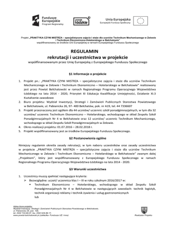 Projekt „PRAKTYKA CZYNI MISTRZA – specjalistyczne zajęcia i staŜe dla uczniów Technikum Mechanicznego w Zelowie i Technikum Ekonomiczno-Hotelarskiego w Bełchatowie” współfinansowany ze środków Unii Europejskiej w ramach Europejskiego Funduszu Społecznego REGULAMIN rekrutacji i uczestnictwa w projekcie współfinansowanym przez Unię Europejską z Europejskiego Funduszu Społecznego §1 Informacje o projekcie 1. Projekt pn.: „PRAKTYKA CZYNI MISTRZA – specjalistyczne zajęcia i staże dla uczniów Technikum Mechanicznego w Zelowie i Technikum Ekonomiczno – Hotelarskiego w Bełchatowie” realizowany jest przez Powiat Bełchatowski w ramach Regionalnego Programu Operacyjnego Województwa Łódzkiego na lata 2014 - 2020, Priorytet XI Edukacja Kwalifikacje Umiejętności, Działanie XI.3 Kształcenie zawodowe 2. Biuro projektu: Wydział Inwestycji, Strategii i Zamówień Publicznych Starostwa Powiatowego w Bełchatowie, ul. Pabianicka 26, 97- 400 Bełchatów, pok. nr A19, tel. 44 7336607 3. Projekt przeznaczony jest ogółem dla 44 uczniów/ uczennic szkół ponadgimnazjalnych, w tym dla 32 uczniów/ uczennic Technikum Ekonomiczno – Hotelarskiego, wchodzącego w skład Zespołu Szkół Ponadgimnazjalnych Nr 4 w Bełchatowie oraz 12 uczniów/ uczennic Technikum Mechanicznego, wchodzącego w skład Zespołu Szkół Ponadgimnazjalnych w Zelowie. 4. Okres realizacji projektu: 01.07.2016 – 28.02.2018 r. 5. Projekt współfinansowany jest ze środków Europejskiego Funduszu Społecznego. §2 Postanowienia ogólne Niniejszy regulamin określa zasady rekrutacji, w tym naboru uczestników oraz zasady uczestnictwa w projekcie „PRAKTYKA CZYNI MISTRZA – specjalistyczne zajęcia i staże dla uczniów Technikum Mechanicznego w Zelowie i Technikum Ekonomiczno – Hotelarskiego w Bełchatowie” zwanym dalej „Projektem”, który jest współfinansowany z Europejskiego Funduszu Społecznego w ramach Regionalnego Programu Operacyjnego Województwa Łódzkiego na lata 2014 - 2020. §3 Warunki uczestnictwa 1. Uczestnicy muszą spełniać następujące kryteria: Bezwzględne: uczeń/ uczennica klas I – III w roku szkolnym 2016/2017 w: Technikum Ekonomiczno – Hotelarskiego, wchodzącego w skład Zespołu Szkół Ponadgimnazjalnych Nr 4 w Bełchatowie w następujących zawodach: technik logistyk, technik organizacji reklamy i technik żywienia i usług gastronomicznych lub Adres biura projektu: Wydział Inwestycji, Strategii i Zamówień Publicznych Starostwa Powiatowego w Bełchatowie, ul. Pabianicka 26, pok. 19A, tel. /044/ 733-66-07, fax. /044/ 635-86-17, www.powiat-belchatowski.pl (zakładka- Fundusze UE i inne) Realizator Projektu Projekt „PRAKTYKA CZYNI MISTRZA – specjalistyczne zajęcia i staŜe dla uczniów Technikum Mechanicznego w Zelowie i Technikum Ekonomiczno-Hotelarskiego w Bełchatowie” współfinansowany ze środków Unii Europejskiej w ramach Europejskiego Funduszu Społecznego Technikum Mechanicznego, wchodzącego w skład Zespołu Szkół Ponadgimnazjalnych w Zelowie w następujących zawodach: technik informatyk i technik pojazdów samochodowych Dodatkowe: średnia ocen na ostatnim świadectwie. Wysokość średniej ocen odpowiada ilości otrzymanych punktów np. średnia 3,75 = 3,75 pkt. Pierwszeństwo będą mieć uczniowie/ uczennice najlepiej uczący się. W przypadkach spornych dodatkowo porównywana będzie ocena z zachowania. Osoby, które nie zakwalifikują się do projektu ze względu na brak miejsc, znajdą się na liście rezerwowej i zostaną zakwalifikowane do projektu w przypadku wycofania się z projektu jakiegokolwiek uczestnika. 2. Warunkiem uczestnictwa w projekcie po spełnieniu kryteriów określonych w pkt. 1 jest wypełnienie i złożenie w sekretariacie szkoły lub biurze projektu: - czytelnie wypełnionego oraz podpisanego przez osoby uprawnione formularza zgłoszeniowego wraz z kserokopią legitymacji szkolnej, - Oświadczenia uczestnika projektu, - Oświadczenia uczestnika projektu o wyrażeniu zgodny na udostępnienie swojego wizerunku - Oświadczenia rodziców/ opiekunów prawnych 3. Formularze ww. dokumentów będą dostępne w sekretariatach szkół, biurze projektu oraz na stronie internetowej Powiatu Bełchatowskiego: www.powiat-belchatowski.pl (zakładka Fundusze UE i inne). 4. Przyjmowane będą jedynie kompletne, poprawnie i czytelnie wypełnione zgłoszenia na właściwym formularzu zgłoszeniowym, opatrzone datą i podpisem osób uprawnionych. §4 Zasady rekrutacji 1. Proces rekrutacji obejmuje zaproszenie do udziału w projekcie oraz udostępnienie Regulaminu rekrutacji i uczestnictwa w projekcie. 2. Sposób informowania: plakaty i ulotki informacyjne w budynkach szkół oraz komunikaty na stronie internetowej Powiatu Bełchatowskiego (www.powiat-belchatowski.pl). 3. Organizację procesu rekrutacji oraz kwalifikację osób do udziału w projekcie prowadzi Komisja Rekrutacyjna. 4. Terminy i daty rekrutacji będą publikowane na stronie internetowej Powiatu Bełchatowskiego www.powiat-belchatowski.pl. 5. Dopuszcza się możliwość przedłużenia rekrutacji do momentu zebrania wymaganej liczby uczestników. 6. Procedura rekrutacyjna składa się z następujących etapów: Adres biura projektu: Wydział Inwestycji, Strategii i Zamówień Publicznych Starostwa Powiatowego w Bełchatowie, ul. Pabianicka 26, pok. 19A, tel. /044/ 733-66-07, fax. /044/ 635-86-17, www.powiat-belchatowski.pl (zakładka- Fundusze UE i inne) Realizator Projektu Projekt „PRAKTYKA CZYNI MISTRZA – specjalistyczne zajęcia i staŜe dla uczniów Technikum Mechanicznego w Zelowie i Technikum Ekonomiczno-Hotelarskiego w Bełchatowie” współfinansowany ze środków Unii Europejskiej w ramach Europejskiego Funduszu Społecznego • wypełnienia formularza zgłoszeniowego wraz z załącznikami i dostarczenia go sekretariatu szkoły lub biura projektu, • weryfikacji złożonych dokumentów, • selekcji kandydatów według kryteriów określonych 