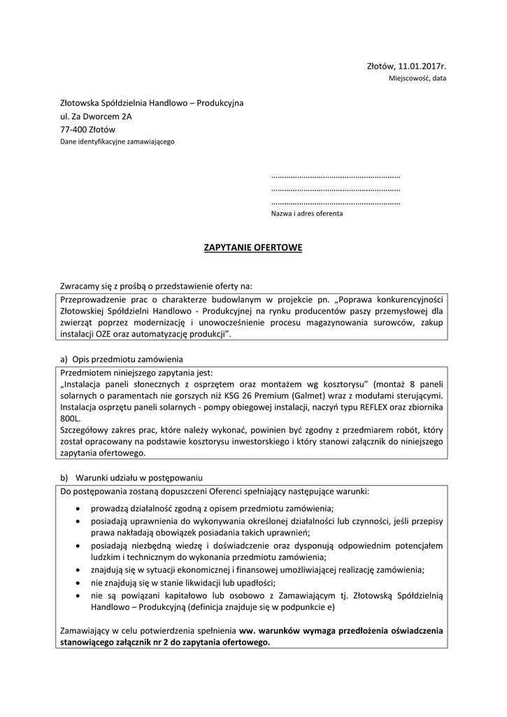 Złotów, 11.01.2017r. Miejscowość, data Złotowska Spółdzielnia Handlowo – Produkcyjna ul. Za Dworcem 2A 77-400 Złotów Dane identyfikacyjne zamawiającego …………………………………………………… …………………………………………………… …………………………………………………… Nazwa i adres oferenta ZAPYTANIE OFERTOWE Zwracamy się z prośbą o przedstawienie oferty na: Przeprowadzenie prac o charakterze budowlanym w projekcie pn. „Poprawa konkurencyjności Złotowskiej Spółdzielni Handlowo - Produkcyjnej na rynku producentów paszy przemysłowej dla zwierząt poprzez modernizację i unowocześnienie procesu magazynowania surowców, zakup instalacji OZE oraz automatyzację produkcji”. a) Opis przedmiotu zamówienia Przedmiotem niniejszego zapytania jest: „Instalacja paneli słonecznych z osprzętem oraz montażem wg kosztorysu” (montaż 8 paneli solarnych o paramentach nie gorszych niż KSG 26 Premium (Galmet) wraz z modułami sterującymi. Instalacja osprzętu paneli solarnych - pompy obiegowej instalacji, naczyń typu REFLEX oraz zbiornika 800L. Szczegółowy zakres prac, które należy wykonać, powinien być zgodny z przedmiarem robót, który został opracowany na podstawie kosztorysu inwestorskiego i który stanowi załącznik do niniejszego zapytania ofertowego. b) Warunki udziału w postępowaniu Do postępowania zostaną dopuszczeni Oferenci spełniający następujące warunki: prowadzą działalność zgodną z opisem przedmiotu zamówienia; posiadają uprawnienia do wykonywania określonej działalności lub czynności, jeśli przepisy prawa nakładają obowiązek posiadania takich uprawnień; posiadają niezbędną wiedzę i doświadczenie oraz dysponują odpowiednim potencjałem ludzkim i technicznym do wykonania przedmiotu zamówienia; znajdują się w sytuacji ekonomicznej i finansowej umożliwiającej realizację zamówienia; nie znajdują się w stanie likwidacji lub upadłości; nie są powiązani kapitałowo lub osobowo z Zamawiającym tj. Złotowską Spółdzielnią Handlowo – Produkcyjną (definicja znajduje się w podpunkcie e) Zamawiający w celu potwierdzenia spełnienia ww. warunków wymaga przedłożenia oświadczenia stanowiącego załącznik nr 2 do zapytania ofertowego. c) Kryteria oceny ofert – wybór najkorzystniejszej oferty nastąpi w oparciu o następujące kryteria 1. Cena netto 60% 2. Okres gwarancji (liczony w miesiącach) 20% 3. Czas reakcji serwisu 20% d) Opis sposobu przyznawania punktacji Wartość punktowa wyliczona zostanie następująco: Cena: 60% - wartość punktowa kryterium „cena” (max 60 pkt.) wyliczona według wzoru: najniższa cena netto wśród otrzymanych ofert --------------------------------------------------------------- x 60 cena netto wskazana w badanej ofercie Brane pod uwagę będę wartości netto (bez podatku VAT) wyrażona w PLN. W przypadku uzyskania oferty w walutach obcych wskazana wartość zamówienia zostanie przeliczona na PLN w oparciu o kurs sprzedaży danej waluty wg notować NBP z dnia wystawienia waluty. W przypadku, gdy NBP nie publikuje dla danej waluty kursów sprzedaży, do dokonywania przeliczeń zastosowany zostanie kurs średni NBP z dnia wystawienia oferty. Okres gwarancji (liczony w miesiącach): 20% - wartość punktowa kryterium „okres gwarancji” (max 20 pkt.) wyliczona według wzoru: Okres gwarancji (w miesiącach) wskazany w badanej ofercie --------------------------------------------------------------------------------- x20 Najdłuższy okres gwarancji wśród otrzymanych ofert Zaleca się podanie jednego okresu gwarancji dla zamówienia. Jeżeli Wykonawca udzieli różnych okresów gwarancji, np. na różne urządzenia, Zamawiający przyjmie do oceny najkrótszy z podanych okres gwarancji. Czas reakcji serwisu (rozumiane jako maksymalny czas reakcji serwisu liczony od momentu zgłoszenia w godzinach): 20% - wartość punkowa kryterium „czas reakcji serwisu” (max 20 pkt.) wyliczona według wzoru: najkrótszy czas reakcji serwisu wśród otrzymanych ofert --------------------------------------------------------------------------- x 20 Czas reakcji serwisu w badanej ofercie Wyniki dokonywanych obliczeń podlegać będą zaokrągleniu do dwóch miejsc po przecinku, przy zachowaniu matematycznej zasady zaokrąglania liczb. Wybrana zostanie oferta, która uzyska największą liczbę punktów, stanowiących sumę punktów uzyskanych w ramach poszczególnych kryteriów oceny oferty (cena netto, okres gwarancji, czas reakcji serwisu). Maksymalna liczba punktów możliwych do uzyskania: 100 pkt. W sytuacji, gdy dwie lub więcej ofert uzyskają jednakową liczbę punktów, wówczas decydującym kryterium w wyborze będzie ranking punktów uzyskanych za cenę. e) Informacja na temat zakresu wykluczenia Wykluczeniu będą podlegać Oferenci, którzy: nie prowadzą działalności zgodnej z opisem przedmiotu zamówienia; nie posiadają uprawnienia do wykonywania określonej działalności lub czynności, jeśli przepisy prawa nakładają obowiązek posiadania takich uprawnień; nie posiadają niezbędnej wiedzy i doświadczenia oraz nie dysponują odpowiednim potencjałem ludzkim i technicznym do wykonania przedmiotu zamówienia; nie znajdują się w sytuacji ekonomicznej i finansowej umożliwiającej realizację zamówienia; znajdują się w stanie likwidacji lub upadłości, są powiązani z Zamawiającym kapitałowo lub osobowo. Przez powiązania kapitałowe lub osobowe rozumie się wzajemne powiązania między Zamawiającym lub osobami upoważnionymi do zaciągania zobowiązań w imieniu Zamawiającego lub osobami wykonującymi w imieniu Zamawiającego czynności związane z przygotowaniem i przeprowadzeniem procedury wyboru Wykonawcy a Wykonawcą, polegające w szczególności na: f) uczestniczeniu w spółce jako wspólnik spółki cywilnej lub spółki osobowej, posiadaniu co najmniej 10% udziałów lub akcji, pe