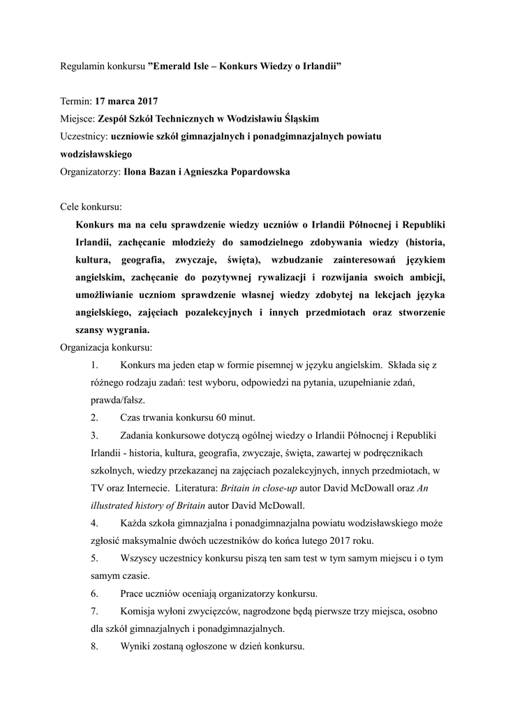 Regulamin konkursu ”Emerald Isle – Konkurs Wiedzy o Irlandii” Termin: 17 marca 2017 Miejsce: Zespół Szkół Technicznych w Wodzisławiu Śląskim Uczestnicy: uczniowie szkół gimnazjalnych i ponadgimnazjalnych powiatu wodzisławskiego Organizatorzy: Ilona Bazan i Agnieszka Popardowska Cele konkursu: Konkurs ma na celu sprawdzenie wiedzy uczniów o Irlandii Północnej i Republiki Irlandii, zachęcanie młodzieży do samodzielnego zdobywania wiedzy (historia, kultura, geografia, zwyczaje, święta), wzbudzanie zainteresowań językiem angielskim, zachęcanie do pozytywnej rywalizacji i rozwijania swoich ambicji, umożliwianie uczniom sprawdzenie własnej wiedzy zdobytej na lekcjach języka angielskiego, zajęciach pozalekcyjnych i innych przedmiotach oraz stworzenie szansy wygrania. Organizacja konkursu: 1. Konkurs ma jeden etap w formie pisemnej w języku angielskim. Składa się z różnego rodzaju zadań: test wyboru, odpowiedzi na pytania, uzupełnianie zdań, prawda/fałsz. 2. Czas trwania konkursu 60 minut. 3. Zadania konkursowe dotyczą ogólnej wiedzy o Irlandii Północnej i Republiki Irlandii - historia, kultura, geografia, zwyczaje, święta, zawartej w podręcznikach szkolnych, wiedzy przekazanej na zajęciach pozalekcyjnych, innych przedmiotach, w TV oraz Internecie. Literatura: Britain in close-up autor David McDowall oraz An illustrated history of Britain autor David McDowall. 4. Każda szkoła gimnazjalna i ponadgimnazjalna powiatu wodzisławskiego może zgłosić maksymalnie dwóch uczestników do końca lutego 2017 roku. 5. Wszyscy uczestnicy konkursu piszą ten sam test w tym samym miejscu i o tym samym czasie. 6. Prace uczniów oceniają organizatorzy konkursu. 7. Komisja wyłoni zwycięzców, nagrodzone będą pierwsze trzy miejsca, osobno dla szkół gimnazjalnych i ponadgimnazjalnych. 8. Wyniki zostaną ogłoszone w dzień konkursu. I POWIATOWY KONKURS WIEDZY O IRLANDII 9. 2017 10. HISTORIA, KULTURA I GEOGRAFIA IRLANDII PÓŁNOCNEJ I REPUBLIKI IRLANDII REGULAMIN KONKURSU 1. Organizatorem konkursu jest Zespół Szkół Technicznych w Wodzisławiu Śląskim reprezentowany przez nauczycielki języka angielskiego: Ilonę Bazan i Agnieszkę Popardowską. 2. Honorowy patronat nad konkursem sprawują: Konsulat Honorowy Irlandii w Poznaniu i Starostwo Powiatowe w Wodzisławiu Śląskim. 3. W konkursie mogą brać udział uczniowie gimnazjów oraz szkół ponadgimnazjalnych powiatu wodzisławskiego. 4. Konkurs jest dwuetapowy: I etap – eliminacje szkolne przeprowadzone do 28 lutego 2017 II etap – finał powiatowy składający się z testu przeprowadzonego 17 marca 2017 w Zespole Szkół Technicznych I etap ELIMINACJE SZKOLNE Dyrekcja szkoły powołuje Szkolną Komisję Konkursu, która sporządza listę uczestników oraz przeprowadza eliminacje szkolne w celu wyłonienia dwóch reprezentantów szkoły. Test szkolny powinien obejmować materiał dotyczący geografii, historii, gospodarki, sztuki, polityki, sportu oraz życia codziennego mieszkańców Irlandii Północnej i Republiki Irlandii. Następnie dyrekcja przysyła zgłoszenie szkoły do finału w terminie do 6 marca 2017 na adres: Zespół Szkół Technicznych 44 - 300 Wodzisław Śl. ul. Pszowska 92 z dopiskiem: zgłoszenie na I Powiatowy Konkurs Wiedzy o Irlandii Północnej i Republiki Irlandii II etap FINAŁ POWIATOWY Finał powiatowy, który odbędzie się 17 marca 2017 o godzinie 9.00 w Sali Konferencyjnej przy Zespole Szkół Technicznych, będzie przeprowadzony w formie testu w języku angielskim, przygotowanego przez Komitet Organizacyjny dla reprezentantów gimnazjów oraz szkół ponadgimnazjalnych. Laureaci, wraz z opiekunami, otrzymają dyplomy oraz nagrody książkowe. Wręczenie nagród laureatom odbędzie się 1 kwietnia 2017 o godzinie 18.00 w sali ślubów pałacu Dietrichsteinów w Wodzisławiu Śląskim podczas czwartej edycji WIECZORU IRLANDZKIEGO z udziałem Wicekonsula Honorowego Irlandii Krzysztofa Schramma. Wszelkie pytania dotyczące konkursu proszę kierować na adres: [email protected] lub [email protected] Wzór zgłoszenia. __________ Nazwa szkoły …........................................................................................................................................ Pieczątka szkoły Imiona i nazwiska uczniów: 1..................................................................................................................................................... 2..................................................................................................................................................... Opiekun: ....................................................................................................................................... Adres e-mail opiekuna i telefon kontaktowy …........................................................................... …...................................................................................................................................................