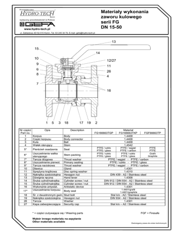 Materiały wykonania zaworu kulowego serii FG DN 15-50 ul. Zakładowa 4D 62-510 Konin, Tel. 63 245 34 79, E-mail: [email protected] Nr części Part no. 1 2 3 4 5* Opis Description FG166663TGP Korpus Część korpusu Kula Wałek sterujący Body Body connector Ball Stem Pierścień osadzenia Seat 17* Uszczelnienie wałka sterującego Tarcza ślizgowa Uszczelnienie pierwot. Tarcza naciskowa Dławica Sprężyna krążkowa Nakrętka sześciokątna Dźwignia ręczna Śruba cylind/nakrętka Śruba cylind/nakrętka Wykonanie antystat. Uszczelnienie korpusu Body seal 18 19 26 27 Śr. z dwustronnym gwin. Nakrętka sześciokątna Tarcza Kapa zabezpieczająca Stud bolt Hexagon nut Washer Security cap 6* 7* 8* 9* 10 11 12 13 14 15 16 Stem packing Thrust washer Primary sealing Thrust washer Gland Disc spring washer Hexagon nut Hand lever Cylinder screw / nut Cylinder screw / nut Antistatic device * = części zużywające się / Wearing parts Wybór innego materiału na zapytanie Other materials available PTFE / szkło PTFE / glass PTFE / szkło PTFE / glass Materiał FG166663TKP 1.4408 1.4408 1.4408 1.4542 FGF66663TP PTFE / węgiel PTFE / carbon PTFE / szkło PTFE / glass PTFE PTFE Grafit Graphite PTFE / węgiel - PTFE / carbon PTFE / szkło - PTFE / glass PTFE / węgiel - PTFE / carbon 1.4301 1.4310 DIN 439 - A2 / Stainless steel 1.4308 DIN 912 / DIN 934 - A2 / Stainless steel DIN 912 / DIN 934 - A2 / Stainless steel 1.4301 1.4401/grafit 1.4401/graphite Stal k/o - A2 / Stainless steel DIN 934 - A2 / Stainless steel 1.4301 Stal k/o – A2 / Stainless steel FGF = Firesafe Zastrzegamy prawo do zmian technicznych