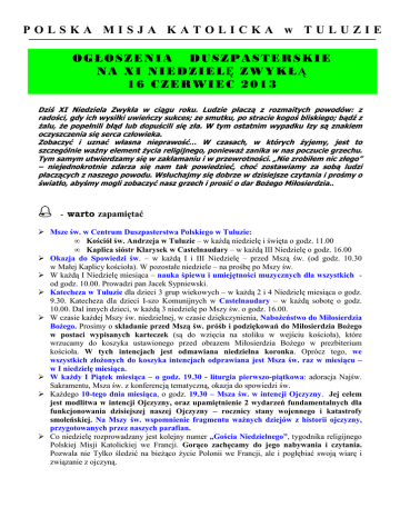 OGŁOSZENIA NA XI NIEDZIELĘ ZWYKŁĄ
