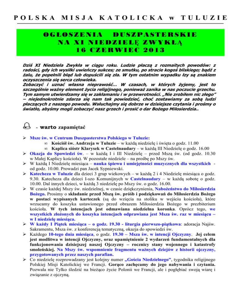 POLSKA MISJA KATOLICKA w TULUZIE OGŁOSZENIA DUSZPASTERSKIE NA XI NIEDZIELĘ ZWYKŁĄ 16 CZERWIEC 2013 Dziś XI Niedziela Zwykła w ciągu roku. Ludzie płaczą z rozmaitych powodów: z radości, gdy ich wysiłki uwieńczy sukces; ze smutku, po stracie kogoś bliskiego; bądź z żalu, że popełnili błąd lub dopuścili się zła. W tym ostatnim wypadku łzy są znakiem oczyszczenia się serca człowieka. Zobaczyć i uznać własna nieprawość… W czasach, w których żyjemy, jest to szczególnie ważny element życia religijnego, ponieważ zanika w nas poczucie grzechu. Tym samym utwierdzamy się w zakłamaniu i w przewrotności. „Nie zrobiłem nic złego” – niejednokrotnie zdarza się nam tak powiedzieć, choć zostawiamy za sobą ludzi płaczących z naszego powodu. Wsłuchajmy się dobrze w dzisiejsze czytania i prośmy o światło, abyśmy mogli zobaczyć nasz grzech i prosić o dar Bożego Miłosierdzia.. ֠ - warto zapamiętać Msze św. w Centrum Duszpasterstwa Polskiego w Tuluzie: • Kościół św. Andrzeja w Tuluzie – w każdą niedzielę i święta o godz. 11.00 • Kaplica sióstr Klarysek w Castelnaudary – w każdą III Niedzielę o godz. 16.00 Okazja do Spowiedzi św. – w każdą I i III Niedzielę – przed Mszą św. (od godz. 10.30 w Małej Kaplicy kościoła). W pozostałe niedziele – na prośbę po Mszy św. W każdą I Niedzielę miesiąca – nauka śpiewu i umiejętności muzycznych dla wszystkich od godz. 10.00. Prowadzi pan Jacek Sypniewski. Katecheza w Tuluzie dla dzieci 3 grup wiekowych – w każdą 2 i 4 Niedzielę miesiąca o godz. 9.30. Katecheza dla dzieci I-szo Komunijnych w Castelnaudary – w każdą sobotę o godz. 10.00. Dal innych dzieci, w każdą 3 niedzielę po Mszy św. o godz. 16.00. W czasie każdej Mszy św. niedzielnej, w czasie dziękczynienia, Nabożeństwo do Miłosierdzia Bożego. Prosimy o składanie przed Mszą św. próśb i podziękowań do Miłosierdzia Bożego w postaci wypisanych karteczek (są do wzięcia na stoliku w wejściu kościoła), które wrzucamy do koszyka ustawionego przed obrazem Miłosierdzia Bożego w prezbiterium kościoła. W tych intencjach jest odmawiana niedzielna koronka. Oprócz tego, we wszystkich złożonych do koszyka intencjach odprawiana jest Msza św. raz w miesiącu – w I niedzielę miesiąca. W każdy I Piątek miesiąca – o godz. 19.30 - liturgia pierwszo-piątkowa: adoracja Najśw. Sakramentu, Msza św. z konferencją tematyczną, okazja do spowiedzi św. Każdego 10-tego dnia miesiąca, o godz. 19.30 – Msza św. w intencji Ojczyzny. Jej celem jest modlitwa w intencji Ojczyzny, oraz upamiętnienie 2 wydarzeń fundamentalnych dla funkcjonowania dzisiejszej naszej Ojczyzny – rocznicy stany wojennego i katastrofy smoleńskiej. Na Mszy św. wspomnienie fragmentu ważnych dziejów z historii ojczyzny, przygotowanych przez naszych parafian. Co niedzielę rozprowadzany jest kolejny numer „Gościa Niedzielnego”, tygodnika religijnego Polskiej Misji Katolickiej we Francji. Gorąco zachęcamy do jego nabywania i czytania. Pozwala nie Tylko śledzić na bieżąco życie Polonii we Francji, ale i pogłębiać swoją wiarę i związanie z ojczyną. - warto wiedzieć ! • Dziś XI Niedziela Zwykła – trwa w Kościele miesiąc czerwiec, poświęcony czci Najświętszego Serca Pana Jezusa i Niepokalanego Serca NMP. Zachęcam wszystkich do odmawiania w domu Litanii do Serca Pana Jezusa. W naszej parafii, w każdą niedzielę czerwca, na zakończenie Mszy św. – Nabożeństwo Czerwcowe. • Dwa tygodnie temu, w niedzielę Bożego Ciała, po odbyciu procesji z Najśw. Sakramentem, przeżyliśmy piękne wydarzenie parafialne, mianowicie Dzień Dziecka, z okazji zakończenia Roku Katechetycznego oraz Festyn Parafialny. Wzięło w nim udział ok. 80 osób, w tym 34 dzieci. Napłynęło wiele podziękowań od strony parafian za jego zorganizowanie. Chciałbym ze swej strony podziękować gorąco wszystkim tym, którzy aktywnie przyczynili się do jego zorganizowania. Tym, którzy ciężką fizyczną pracą przygotowali teren i salę; tym którzy pomogli w organizacji przebiegu Festynu: w zakupach i potem w ogrodzie; oraz tym, którzy przeprowadzili animację z dziećmi (4 godziny zabaw i konkursów). Nie będę wymieniał nazwisk, bo było ich wielu i nie życzą sobie, aby ich wymieniać. Jedynie podziękuję z imienia pani Marcie Mireckiej, która przygotowała i przeprowadziła Dzień Dziecka. Dzieci były bardzo zadowolone i wdzięczne. Bóg zapłać. • We wrześniu, prawdopodobnie w 2 lub 3 niedzielę, zorganizujemy kolejny Festyn Parafialny, połączony z Inauguracją nowego roku katechetycznego dla dzieci. Jeszcze zostanie to dokładnie sprecyzowane. • W ubiegłą niedzielę, odbywała się Msza św. na wyjeździe. Gościliśmy, jako Polonia, w kościele parafialnym w miejscowości St Rome, przy obrazie Matki Bożej Częstochowskiej. Razem z mieszkańcami miejscowości, było nas dobre 40 osób. Na zakończenie zebraliśmy się przy wspólnej kawie i ciastku. Bardzo dziękuję wszystkim, którzy przyjechali na tę Mszę św. i dali świadectwo wiary oraz Pani Krystynie Smati za przygotowanie kawy. • Bardzo dziękuję wszystkim którzy pomogli wczoraj, w sobotę w kolejnym sprzątaniu terenu wokół kościoła i plebanii. Bóg zapłać! Raz na dwa tygodnie, będziemy regularnie kontynuowali te prace, aby utrzymać obejście kościoła w czystości. Zapraszamy wszystkich parafian do pomocy i spędzeniu od czasu do czasu sobotniego dnia we wspólnocie polskiej, w pracy i przy wspólnym stole! Czynimy to jako współodpowiedzialność z francuzami za wspólne dobro, jakim jest kościół St Andre. (nie dla ks. Proboszcza!). • 24 czerwca przypada Uroczystość Narodzenia św. Jana Chrzciciela. Ponieważ przypada w poniedziałek, z inicjatywy parafian, została sformułowana propozycja, aby spotkać się w piątek 21 czerwca, na zakończenie tygodnia pracy, na wspólnym pikniku 