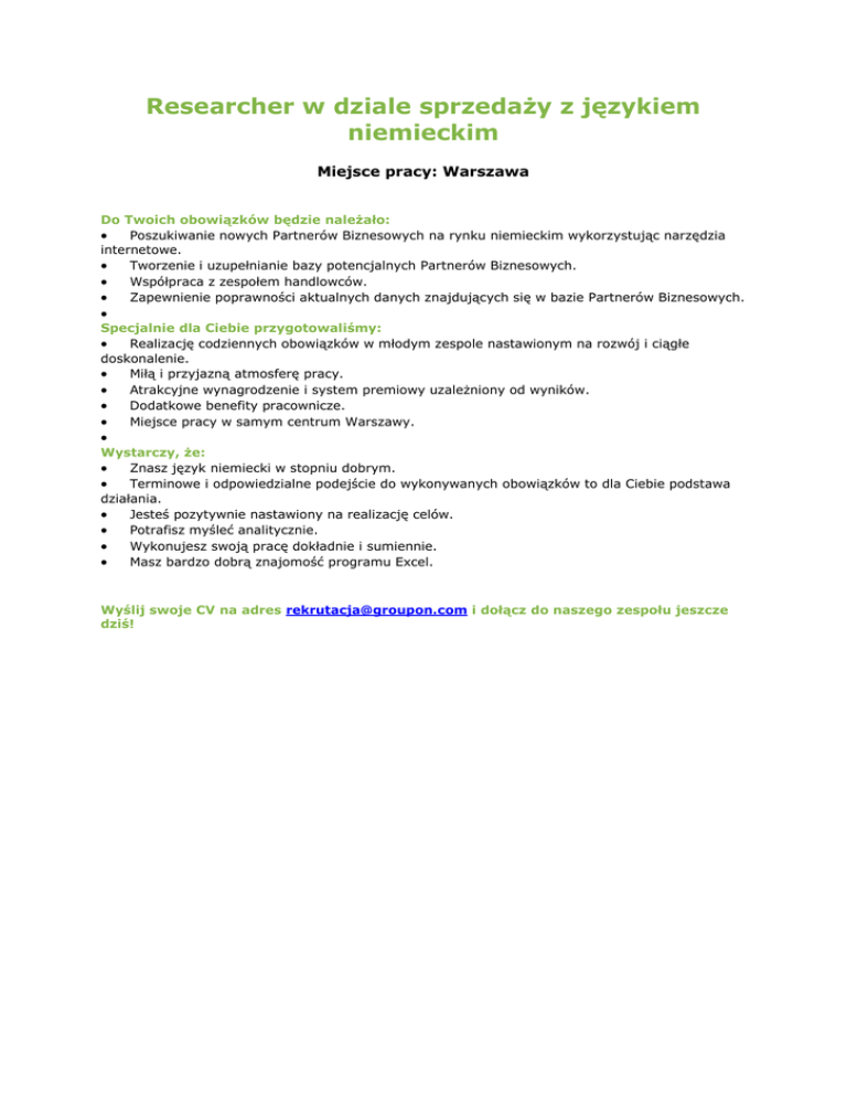 Researcher w dziale sprzedaży z językiem niemieckim Miejsce pracy: Warszawa Do Twoich obowiązków będzie należało: Poszukiwanie nowych Partnerów Biznesowych na rynku niemieckim wykorzystując narzędzia internetowe. Tworzenie i uzupełnianie bazy potencjalnych Partnerów Biznesowych. Współpraca z zespołem handlowców. Zapewnienie poprawności aktualnych danych znajdujących się w bazie Partnerów Biznesowych. Specjalnie dla Ciebie przygotowaliśmy: Realizację codziennych obowiązków w młodym zespole nastawionym na rozwój i ciągłe doskonalenie. Miłą i przyjazną atmosferę pracy. Atrakcyjne wynagrodzenie i system premiowy uzależniony od wyników. Dodatkowe benefity pracownicze. Miejsce pracy w samym centrum Warszawy. Wystarczy, że: Znasz język niemiecki w stopniu dobrym. Terminowe i odpowiedzialne podejście do wykonywanych obowiązków to dla Ciebie podstawa działania. Jesteś pozytywnie nastawiony na realizację celów. Potrafisz myśleć analitycznie. Wykonujesz swoją pracę dokładnie i sumiennie. Masz bardzo dobrą znajomość programu Excel. Wyślij swoje CV na adres [email protected] i dołącz do naszego zespołu jeszcze dziś!
