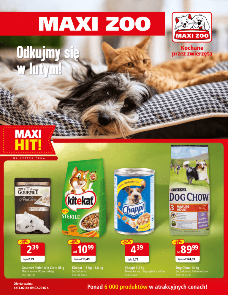 Odkujmy się w lutym! -20% 2 39 było 2,99 -19% od Kochane przez zwierzęta 10 99 było od 13,49 -24% 439 było 5,79 -28% od 8999 było od 124,99 Gourmet Perle i A’la Carte 85 g Kitekat 1,8 kg i 1,6 kg Chappi 1,2 kg Dog Chow 14 kg 1 kg = 28,11 zł 1 kg = od 6,10 zł 1 kg = 3,66 zł 1 kg = od 6,43 zł Mokra karma. Różne rodzaje. Oferta ważna od 3.02 do 09.02.2016 r. Sucha karma. Mokra karma. Duży wybór smaków. Sucha karma. Różne rodzaje. Ponad 6 000 produktów w atrakcyjnych cenach! WSZYSTKO DLA MOJEGO PSA CZAS SIĘ PSIEBUDZIĆ od 9499 AniOne transporter dla psa Dostępny w dwóch rozmiarach i dwóch wariantach kolorystycznych. -21% od od Ani One poduszka do transportera Miękka i wygodna. Dostępna w dwóch rozmiarach. 2639 2999 było od 32,99 AniOne miska dla psa Melaminowa, dostępne różne kolory i rozmiary. 2999 Zabawka „California” Zabawka, która spełnia rolę piłki, choć jej nie przypomina. Wykonana z bezpiecznych materiałów. -25% 105 00 AniOne legowisko dla psa Miękkie, wykonane z wysokiej jakości materiałów. od 1699 od było od 41,99 Fit+Fun koc dla psa More4Dogs obroża dla psa „Allround“ Miękki i ciepły. Dostępny w kilku rozmiarach i kilku wariantach kolorystycznych. -25% 5 99 było 7,99 3149 Wykonane z neoprenu. Dostępne rozmiary: XXS-XL i różne kolory. -25% od 47 24 było od 62,99 -25% od 5099 było od 67,99 APETYT NA ZDROWIE Dobrze dobrana, zbilansowana dieta ważna jest przez cały rok. Ale zimą szczególnie warto zadbać, by do miseczki Twojego pupila trafiały wszystkie niezbędne składniki mineralne i witaminy. Dzięki temu łatwiej będzie uniknąć przeziębień i chorób, a podczas spacerów nie braknie energii do zabaw i szaleństw! 2 Trixie worki na odchody 24 szt. Niezastąpione na spacerach. Pojemność 400 ml. Oferta ważna od 3.02 do 09.02.2016 r. More4Dogs smycz spacerowa „Allround“ Wykonane z neoprenu. Dostępne rozmiary: S-L i różne kolory. More4Dogs szelki „Allround“ Wykonane z neoprenu. Dostępne rozmiary: XXS-XL i różne kolory. www.maxizoo.pl -20% % -15 -27% -15% 143 199 00 od było od 169,00 było 249,00 Real Nature 15 kg Pet Balance 8 kg Wysokogatunkowa sucha karma. Karmy dietetyczne dla szczególnych potrzeb żywieniowych. 1 kg = 13,27 zł -20% 1999 5 69 99 było 24,99 było 6,99 Butcher’s 1,2 kg ACANA ciastka dla psa 454 g 1 kg = 5,00 zł 1 kg = 44,03 zł Mokra karma. Różne rodzaje. Różne warianty smakowe. 1 kg = od 17,96 zł -15% od -17% 63 79 było od 74,99 4 Premiere 400 g 1 kg = od 15,34 zł 1 kg = 12,47 zł -16% 4 było 5,99 Select Gold 4 kg Sucha karma. Różne rodzaje. -16% 99 4799 19 było 4,99 było 56,99 Select Gold 200 g Mokra karma. Różne rodzaje. Premiere Best Meat 4 kg Wysokiej jakości mokra karma. Różne rodzaje. Sucha karma. Różne rodzaje. 1 kg = 12 zł 1 kg = 20,95 zł -20% -15% 29 59 od od było od 36,99 1439 -15% było od 16,99 od -6% 16899 16 19 od było od 179,00 było od 18,99 Bosh 2,5 kg i 3 kg MultiFit 3 kg 1 kg = od 9,87 zł 1 kg = od 4,80 zł. Sucha karma. Sucha karma. Brit Care Adult 1 kg Acana 11,4 kg i 13 kg 1 kg = od 16,19 zł 1 kg = od 13,00 zł Sucha karma. -23% Sucha karma. Różne smaki. -22% 699 2 29 -15% od było 8,99 było 2,99 -21% 299 5 49 było 3,79 było od 6,49 Chappi 500 g Sucha karma. 1 kg = 4,58 zł Multifit Soft 70 g Przysmaki dostepne w kilku wariantach smakowych. Pedigree 800 g Chappi 4 x 100 g 1 kg = od 6,86 zł 1 kg = 7,48 zł Mokra karma. Różne smaki i rodzaje. Mokra karma. Różne rodzaje 1 kg = 99,86 zł Ponad 6 000 produktów w atrakcyjnych cenach! 3 WSZYSTKO DLA MOJEGO KOTA 849 ŻEGNAMY ZIMOWE DRZEMKI AniOne miska dla kota Wykonana z wysokiej jakości materiałów. Wykończona „mankietem”, który zapobiega spadaniu okruszków na podłogę. 8499 Edukacyjna zabawka dla kota Pobudza inteligencję i instynkty Twojego pupila. 1249 6499 Miska i podajnik na karmę 2 w 1 - mieści zapas karmy, nawet na kilka dni. Doskonałe rozwiązanie podczas weekendowych nieobecności właściciela. AniOne obroża Z miejscem na adres. -20% 8499 od 7999 od było od 99,99 899 -90 zł 35900 było 449,00 AniOne drapak „Deseczka” Wykonany z mocnych materiałów. Legowisko Camelot Ciepła i wygodna jaskinia dla Twojego kota. Dostępne dwa rozmiary. 4Cats poduszki przytulanki Dostępne w kilku kolorach. -17% 8499 AniOne kuweta dla kota Zamknięta kuweta w niepowtarzalnej kolorystyce. 999 Żwirek Fit+fun Bioclean 5 kg W 100% naturalny, pochłania nieprzyjemne zapachy. 499 było 5,99 Nautralizator zapachu 250 ml Dostępny w trzech wersjach zapachowych. Drapak AniOne XXL Wspaniały duży drapak dla Twojego kota. Stanowi jednocześnie plac zabaw i miejsce odpoczynku. 1 kg = 2,00 zł 4 Oferta ważna od 3.02 do 09.02.2016 r. www.maxizoo.pl -25% -17% -27% 74 4 99 było 89,99 było 6,69 -25% 299 39 99 99 było 3,99 było 54,99 Real Nature 100 g Real Nature Wilderness 2,5 kg PetBalance Suplement 30 ml Schesir Natural 85 g 1 kg = 49,90 zł 1 kg = 30,00 zł 1 l = 1333 zł 1 kg = 35,18 zł Mokra karma. Karma sucha. -16% od -30% Wspomaga nerki. -23% 16 4 19 269 47 było 23,49 było od 4,99 Mokra karma. Różne rodzaje. było 3,49 TWÓJ KOT JEST TYM… CO JE! Select Gold 200 g Cat Chow 1,5 kg 1 kg = od 20,95 zł 1 kg = 10,98 zł Mokra karma. Decydując się na kota, przyjmujesz do domu „nowego członka rodziny”. Dlatego musisz zadbać o to, co je – tak, jak dbasz o swoich najbliższych. A jeśli nie wiesz, co będzie dla Twojego wąsacza najlepsze, spytaj naszą obsługę o radę – pomoże Ci dobrać pyszne i zdrowe menu! Premiere 85 g Sucha karma. Różne rodzaje. Mokra karma. Saszetki dla kota. Dostępne różne rodzaje. 1 kg = 31,64 zł -14% od -20% 2 99 od było od 3,49 479 było od 5,99 -20% od -16% 9 1931 99 od było od 12,49 było od 22,99 Whiskas 400 g MultiFit 50g i 60 g Perfect Fit 750 g Royal Canin 400 g 1 kg = od 7,47 zł 1 kg = od 79,83 zł 1 kg = od 13,32 zł 1 kg = od 48,27 zł Mokra karma. Dostępne różne rodzaje. -17% Przysmaki dla kota. Dostę