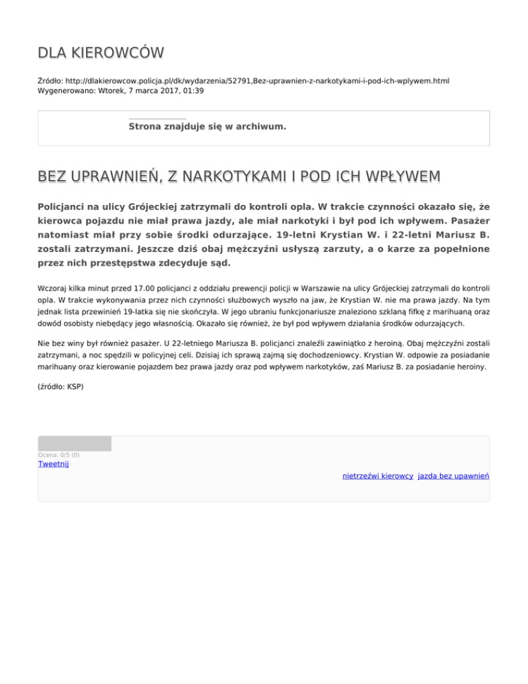 DLA KIEROWCÓW Źródło: http://dlakierowcow.policja.pl/dk/wydarzenia/52791,Bez-uprawnien-z-narkotykami-i-pod-ich-wplywem.html Wygenerowano: Wtorek, 7 marca 2017, 01:39 Strona znajduje się w archiwum. BEZ UPRAWNIEŃ, Z NARKOTYKAMI I POD ICH WPŁYWEM Policjanci na ulicy Grójeckiej zatrzymali do kontroli opla. W trakcie czynności okazało się, że kierowca pojazdu nie miał prawa jazdy, ale miał narkotyki i był pod ich wpływem. Pasażer natomiast miał przy sobie środki odurzające. 19-letni Krystian W. i 22-letni Mariusz B. zostali zatrzymani. Jeszcze dziś obaj mężczyźni usłyszą zarzuty, a o karze za popełnione przez nich przestępstwa zdecyduje sąd. Wczoraj kilka minut przed 17.00 policjanci z oddziału prewencji policji w Warszawie na ulicy Grójeckiej zatrzymali do kontroli opla. W trakcie wykonywania przez nich czynności służbowych wyszło na jaw, że Krystian W. nie ma prawa jazdy. Na tym jednak lista przewinień 19-latka się nie skończyła. W jego ubraniu funkcjonariusze znaleziono szklaną fifkę z marihuaną oraz dowód osobisty niebędący jego własnością. Okazało się również, że był pod wpływem działania środków odurzających. Nie bez winy był również pasażer. U 22-letniego Mariusza B. policjanci znaleźli zawiniątko z heroiną. Obaj mężczyźni zostali zatrzymani, a noc spędzili w policyjnej celi. Dzisiaj ich sprawą zajmą się dochodzeniowcy. Krystian W. odpowie za posiadanie marihuany oraz kierowanie pojazdem bez prawa jazdy oraz pod wpływem narkotyków, zaś Mariusz B. za posiadanie heroiny. (źródło: KSP) Ocena: 0/5 (0) Tweetnij nietrzeźwi kierowcy, jazda bez upawnień
